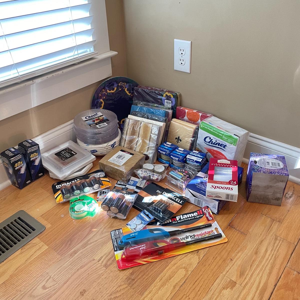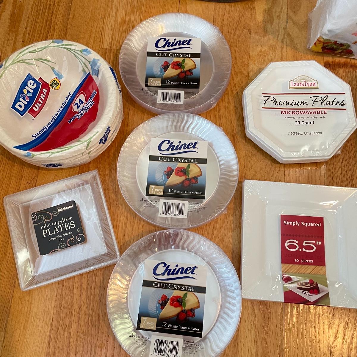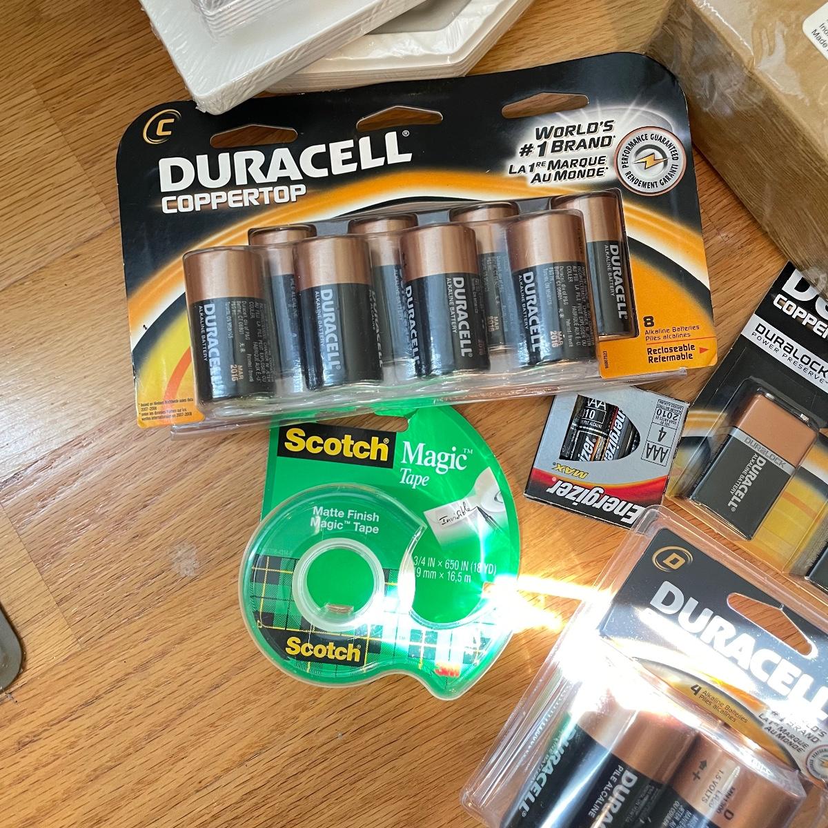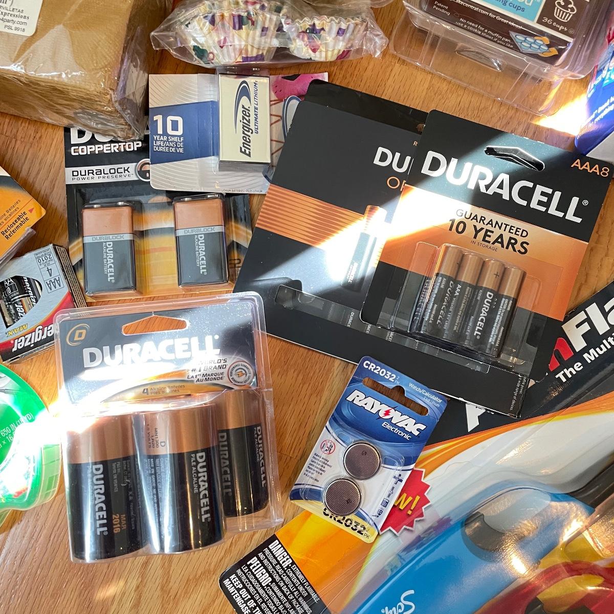 New in package, seven package of disposable plates with between 6-20 count each. One pack of 24 bowls, a total of 54 pieces of cutlery and small muffin papers. Packaged batteries, mostly Duracell, include AAA, C,D, 9V and CR2032. Lighters, tape, and flashlights too. Local pick up only.