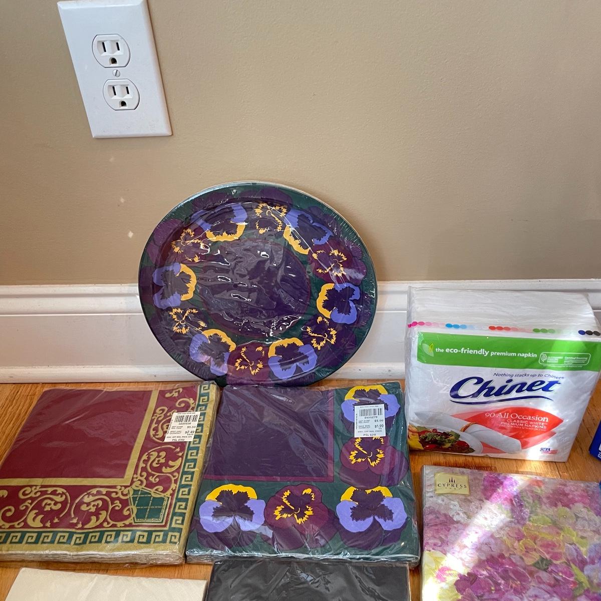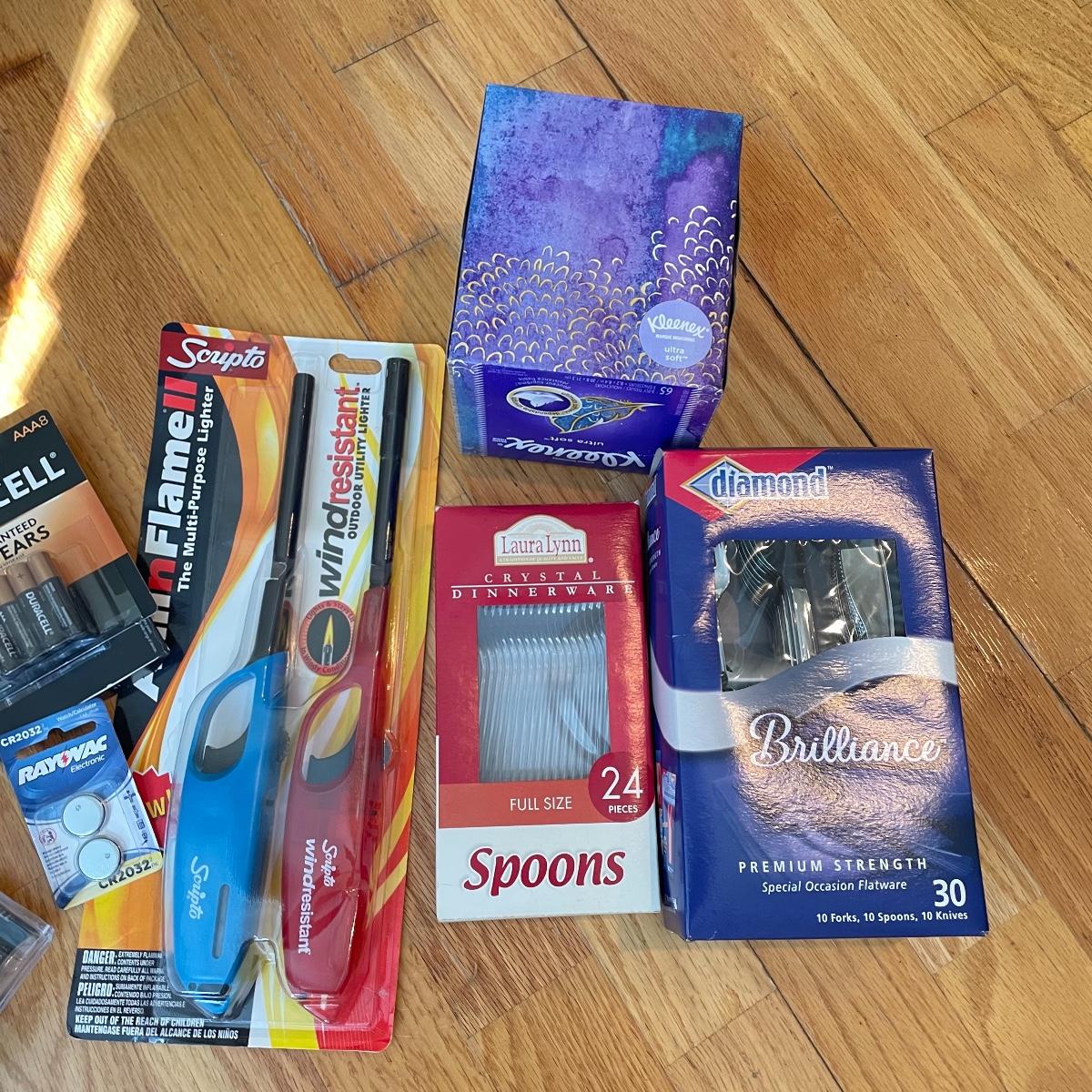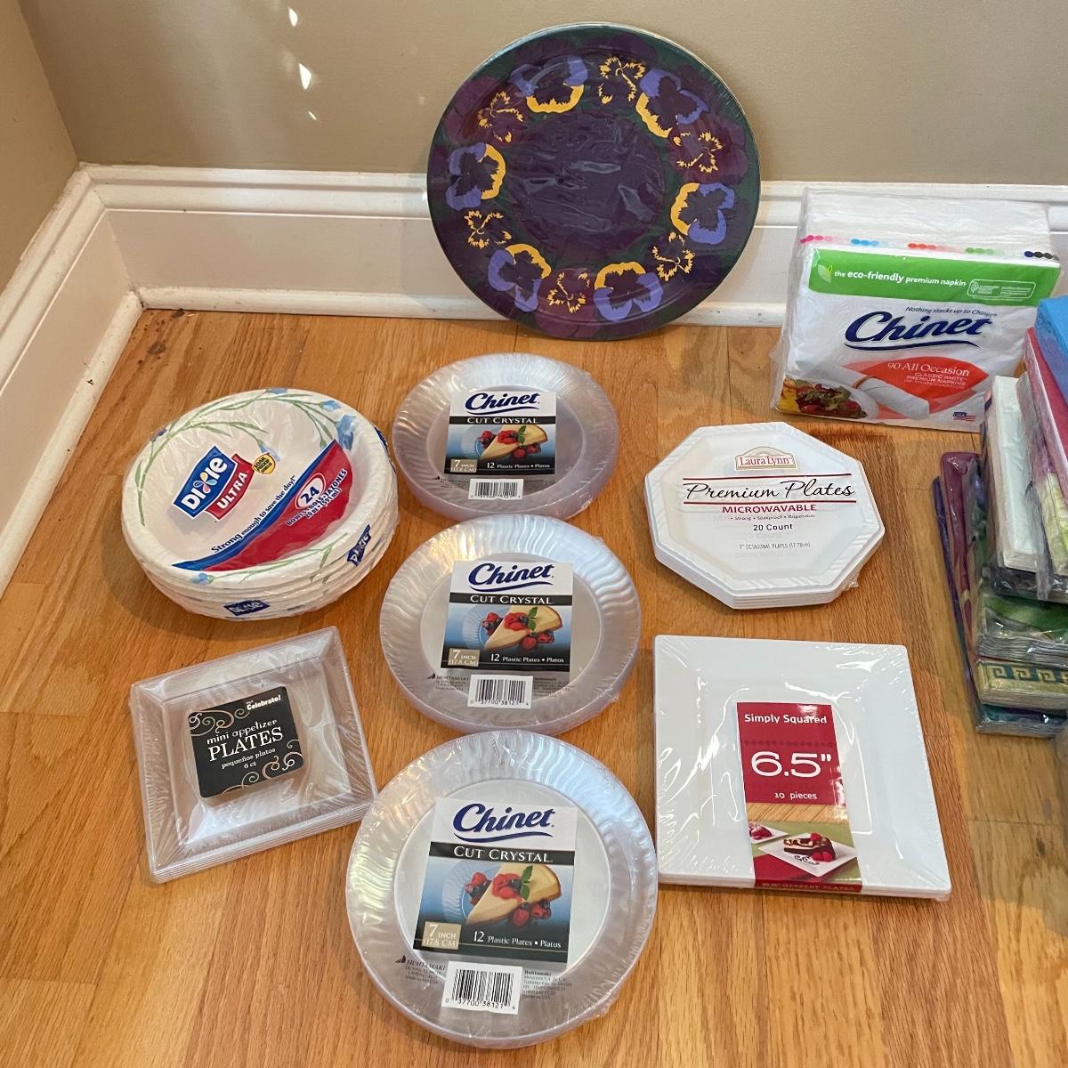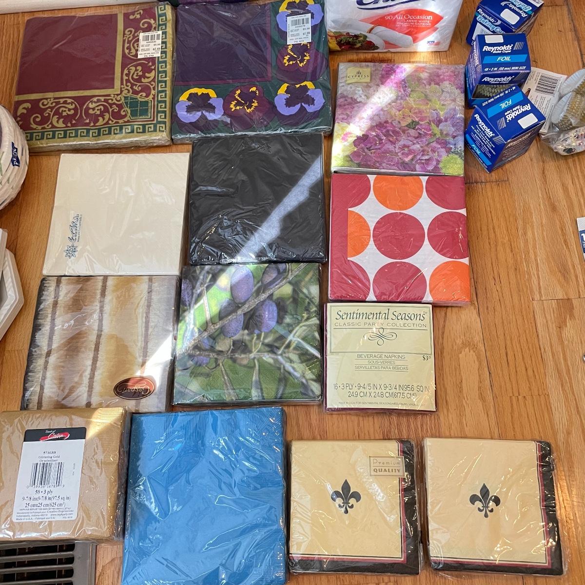 New in package, seven package of disposable plates with between 6-20 count each. One pack of 24 bowls, a total of 54 pieces of cutlery and small muffin papers. Packaged batteries, mostly Duracell, include AAA, C,D, 9V and CR2032. Lighters, tape, and flashlights too. Local pick up only.