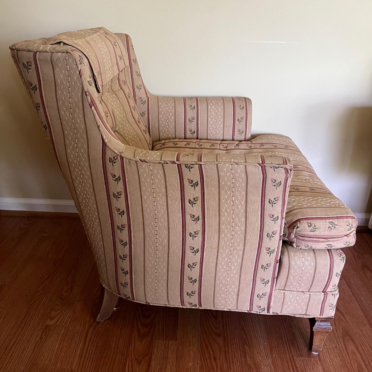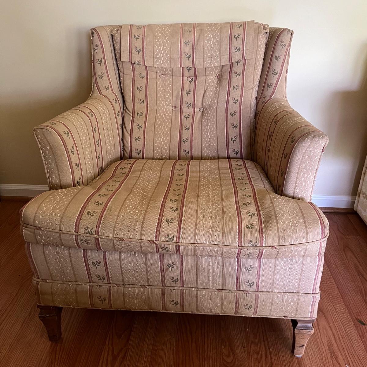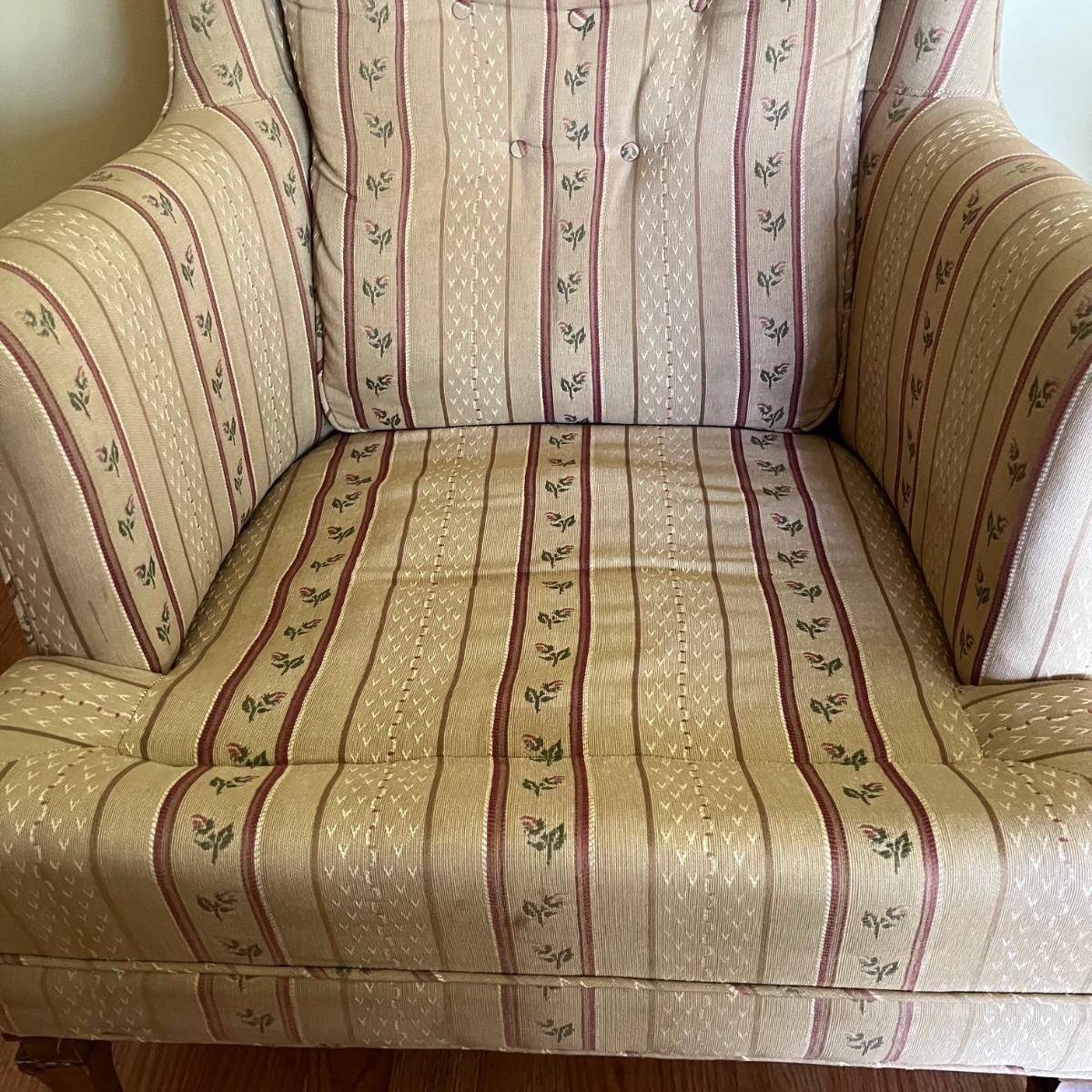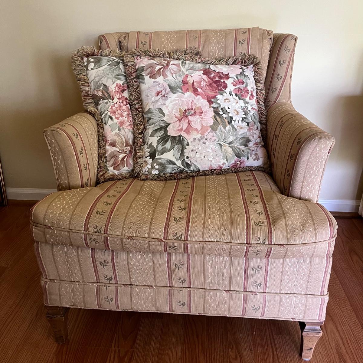 Lot includes a padded fabric arm chair with removable bottom cushion and wooden feet. Also includes two throw pillows. Chair measures 29” x 33” x 30.5” with a seat height of 16”. Item is up one flight of stairs.