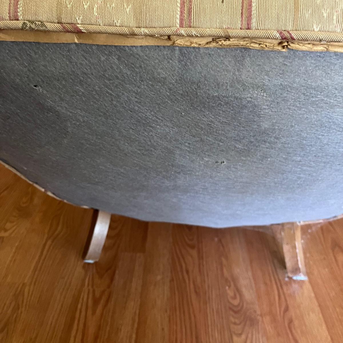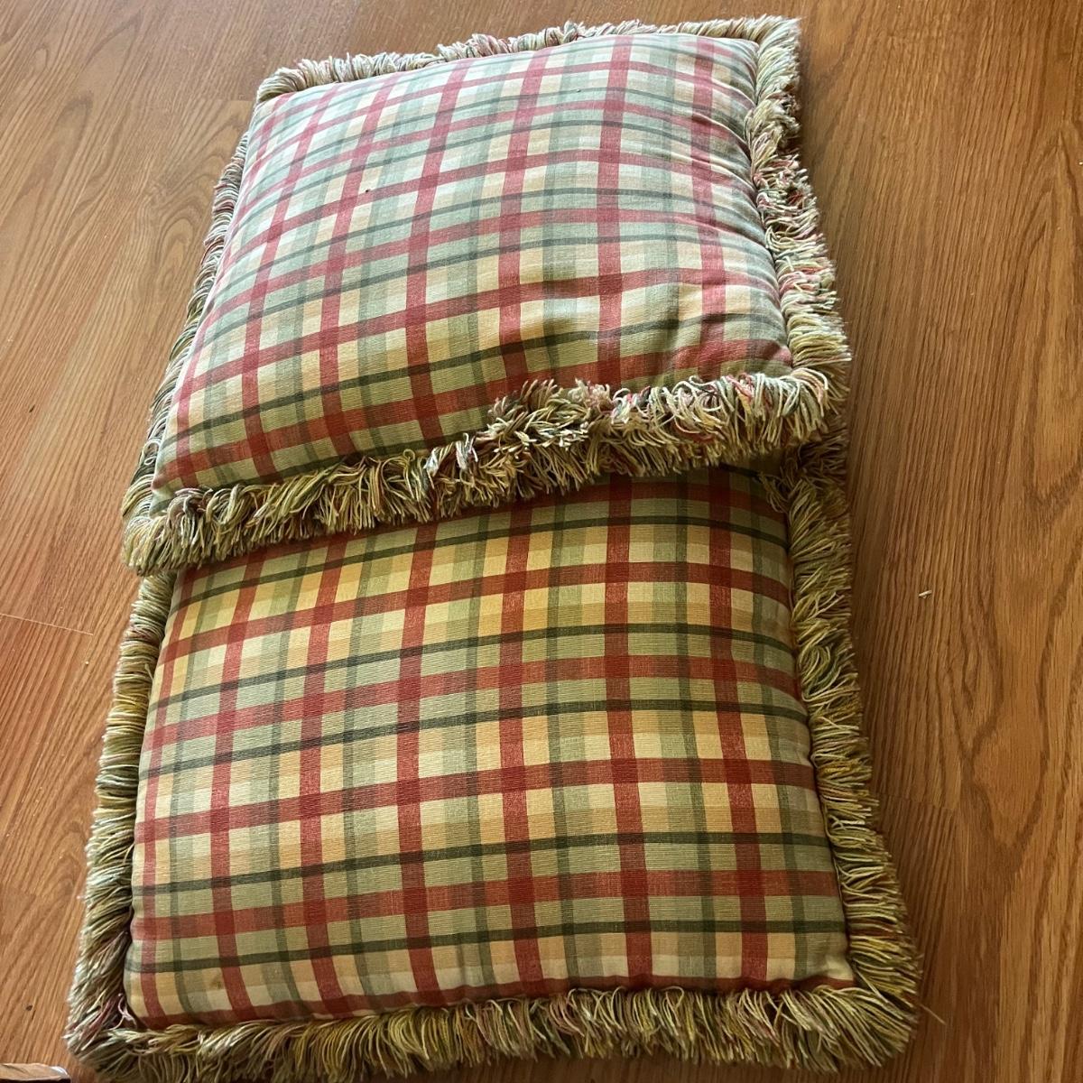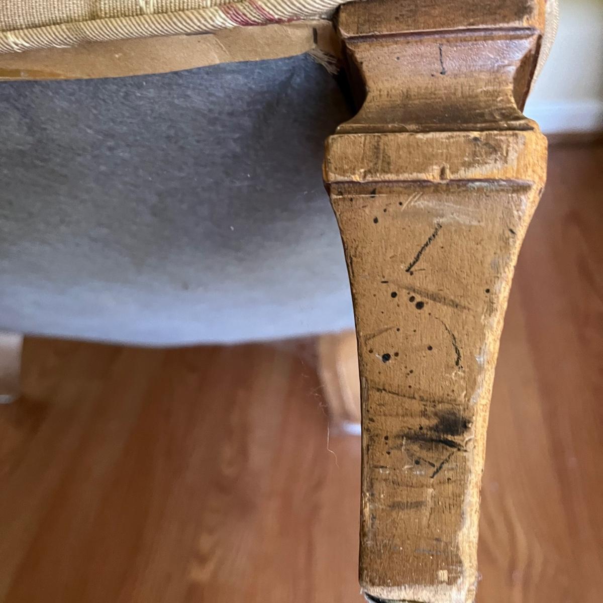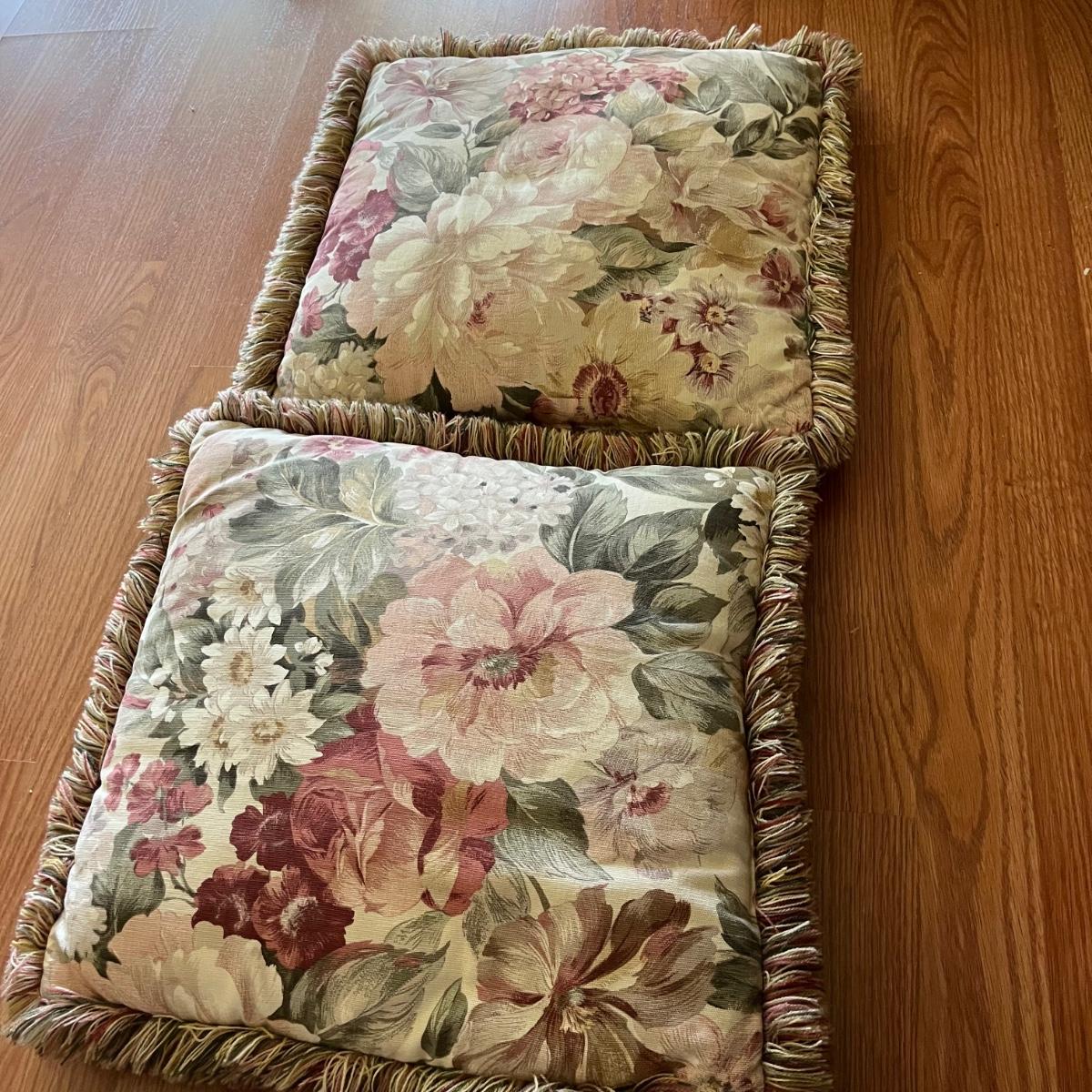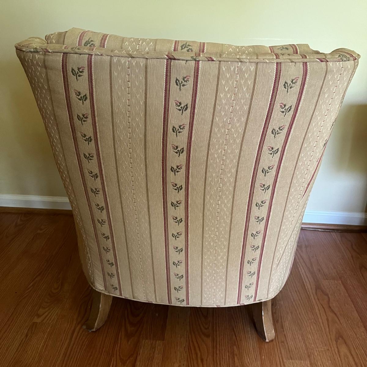 Lot includes a padded fabric arm chair with removable bottom cushion and wooden feet. Also includes two throw pillows. Chair measures 29” x 33” x 30.5” with a seat height of 16”. Item is up one flight of stairs.