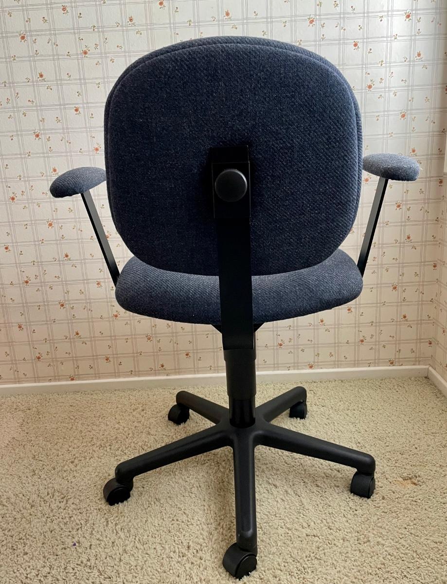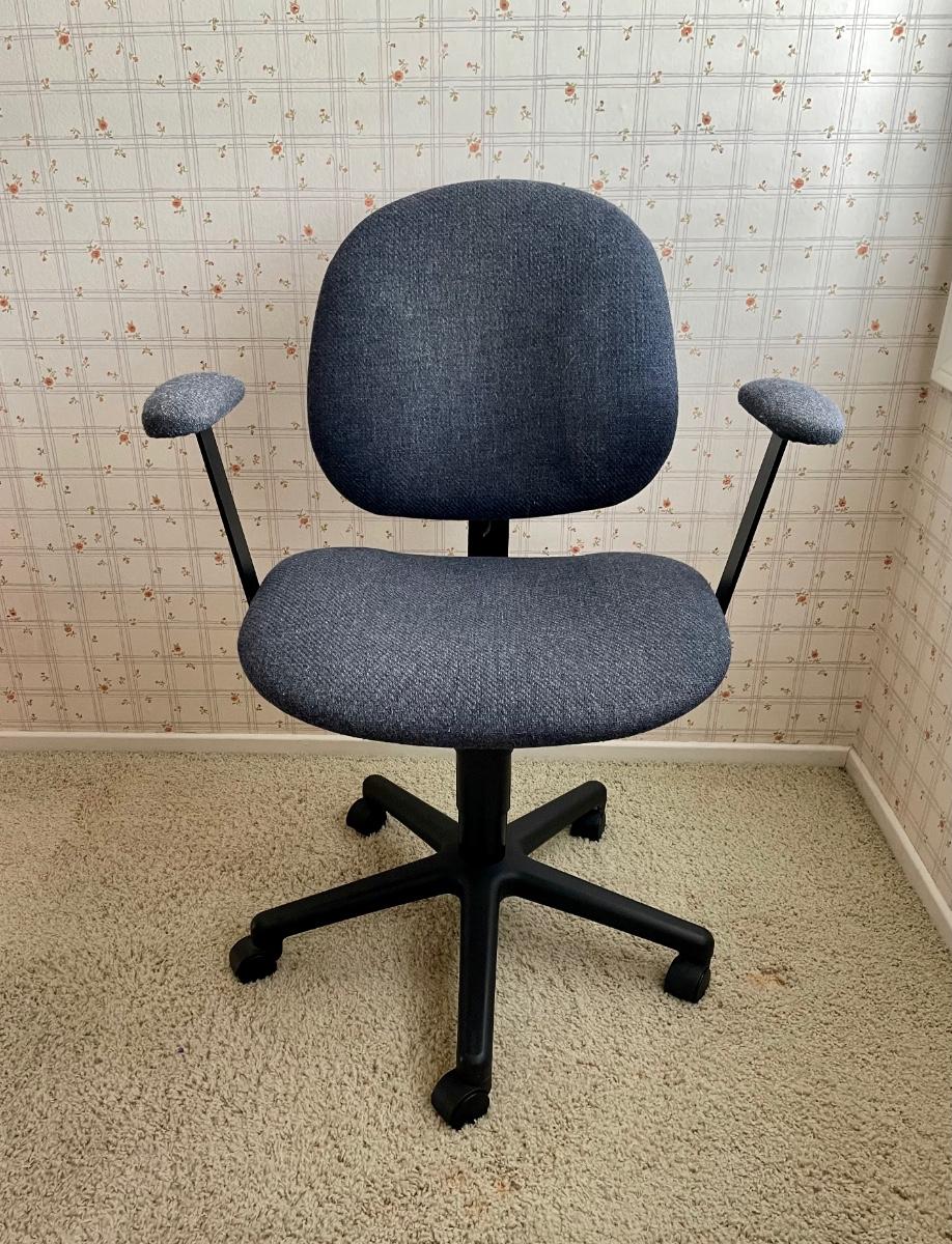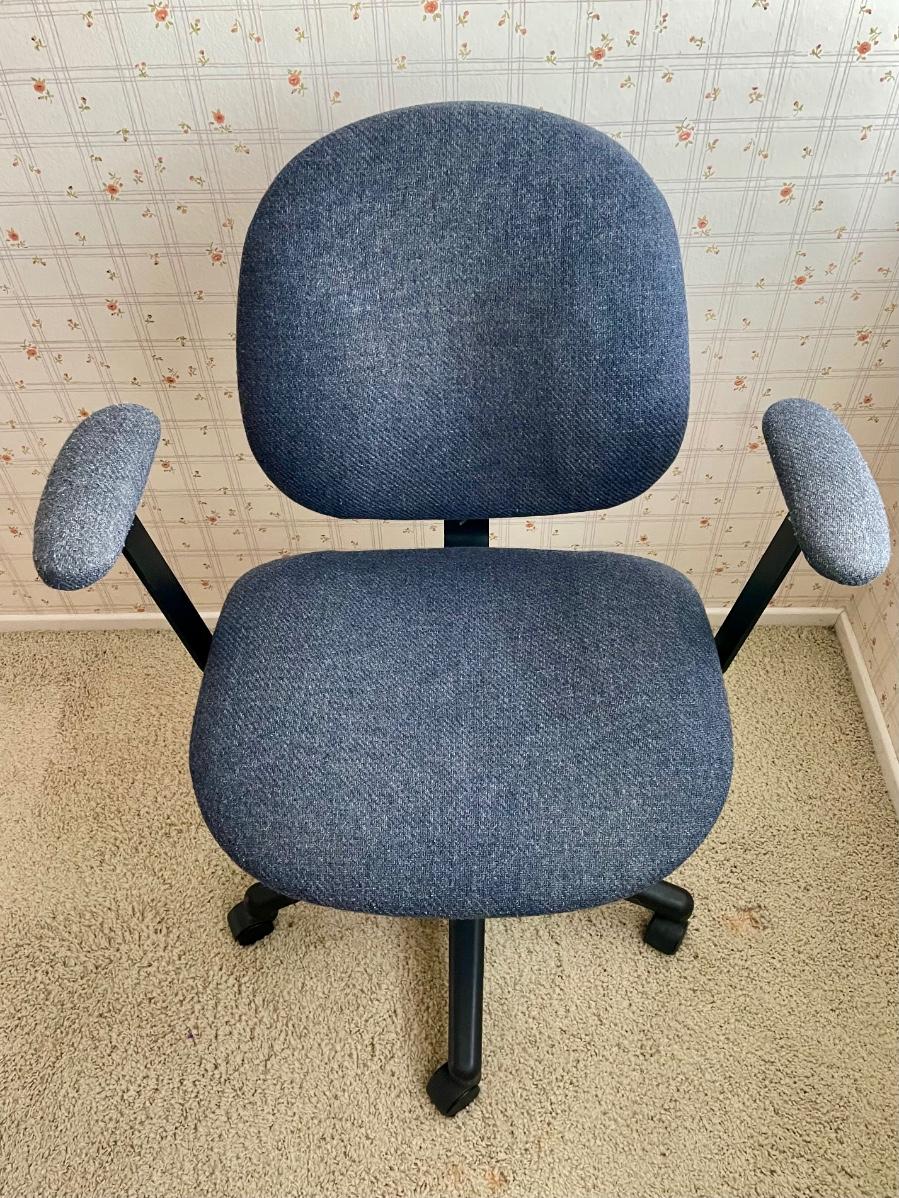 Padded Office Chair with Arms, covered in a blue/gray fabric.
