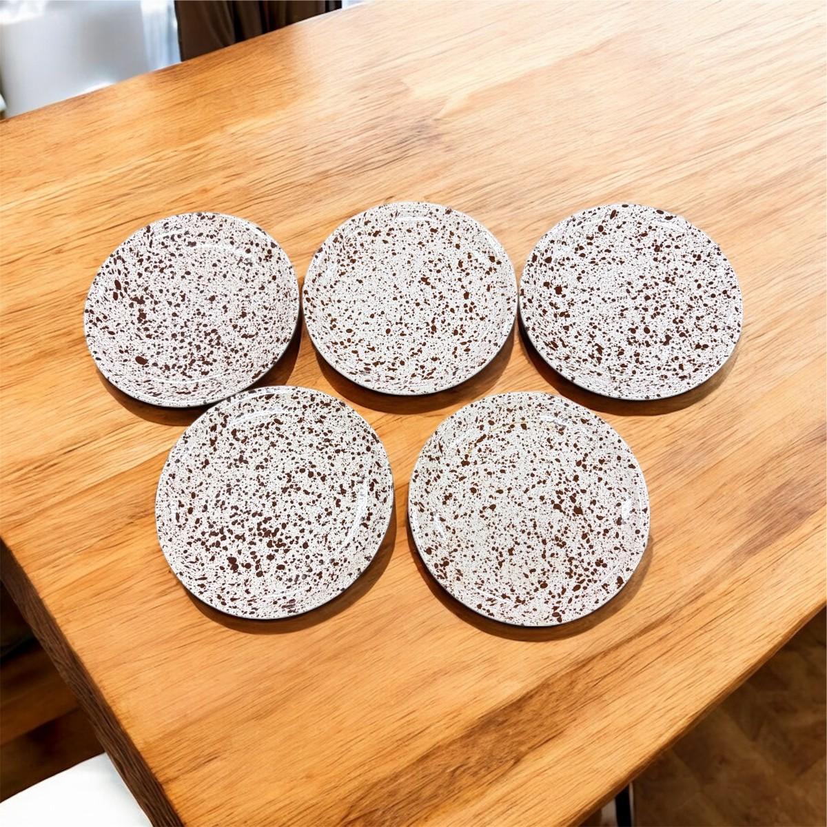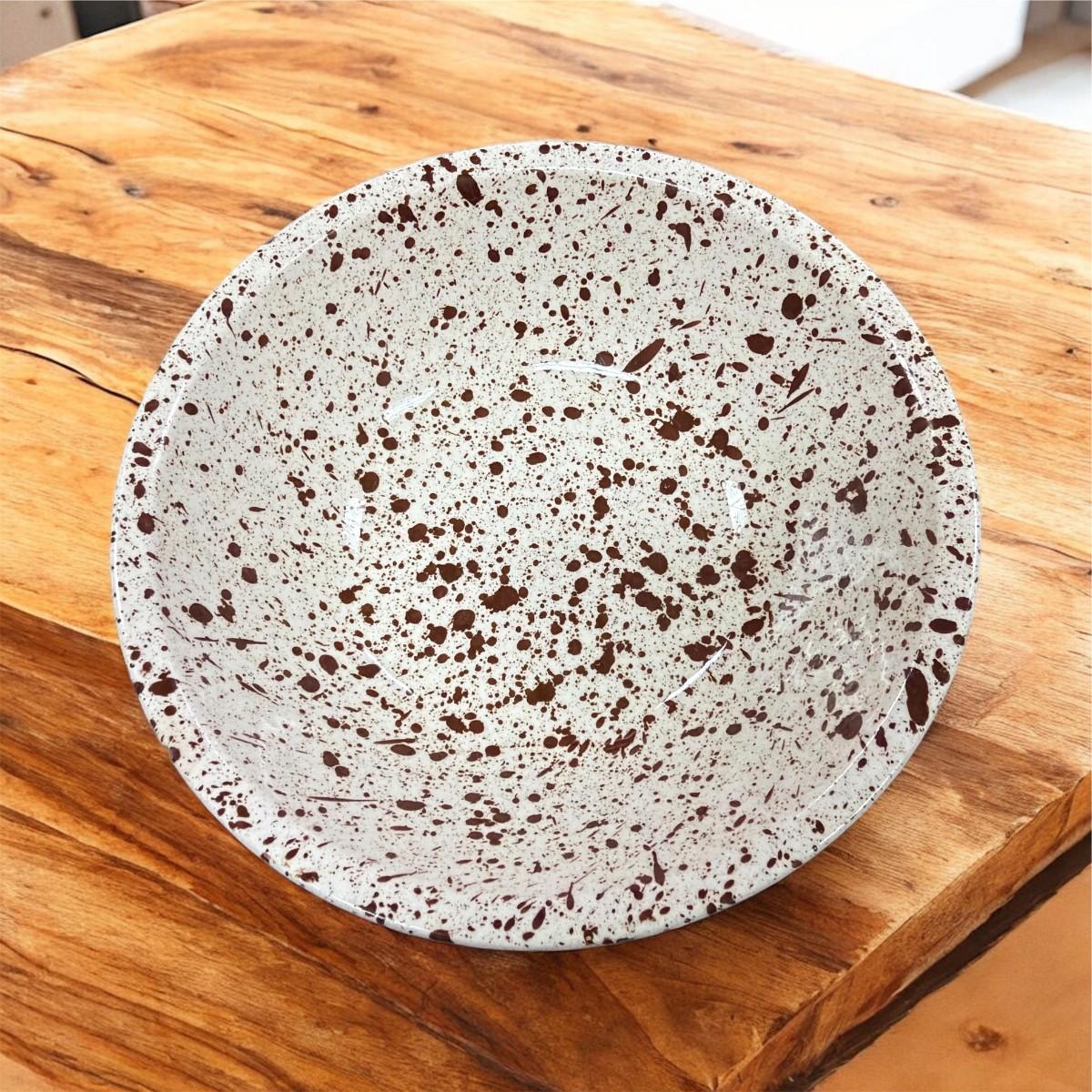 Paden City Pottery Brown Splatterware "Confetti" Dinnerware Total of 9 Pieces. Set includes 5-9.5" Plates, 1- 8" Bowl, !-9" Bowl with small chip on the underside (See Photo), 1- Large 13" Round Platter, 1- Large 14" Oval Platter