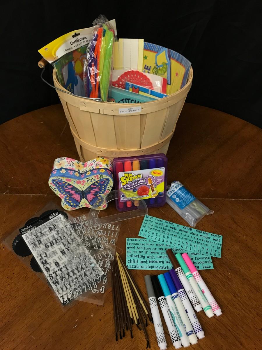 crafts: paint brushes, letter sticker, markers,glue sticks, gel crayons, butterfly box, and more in basket;