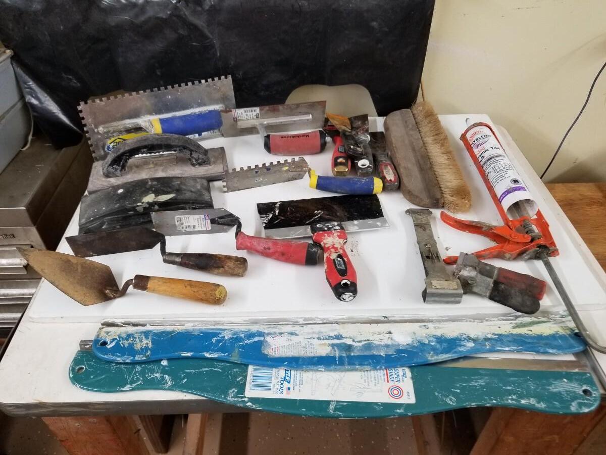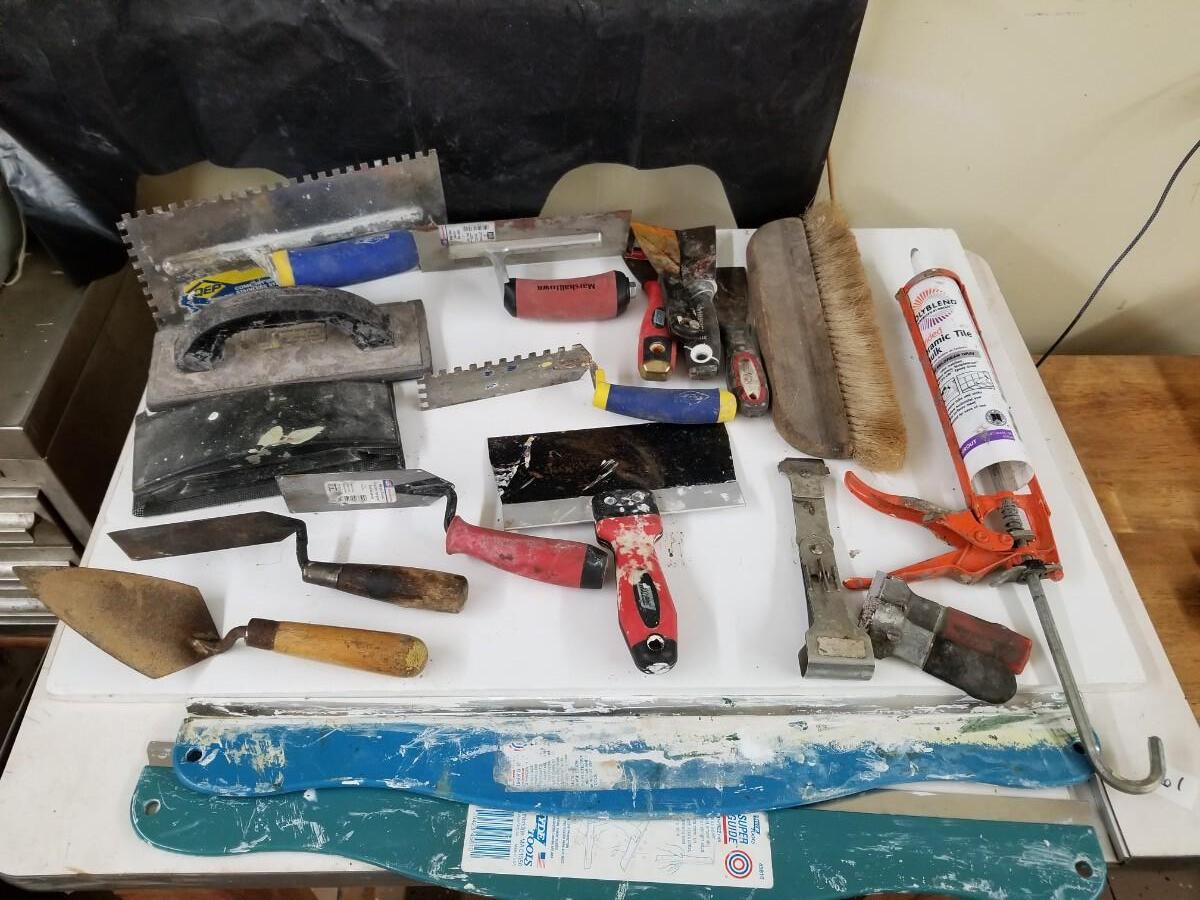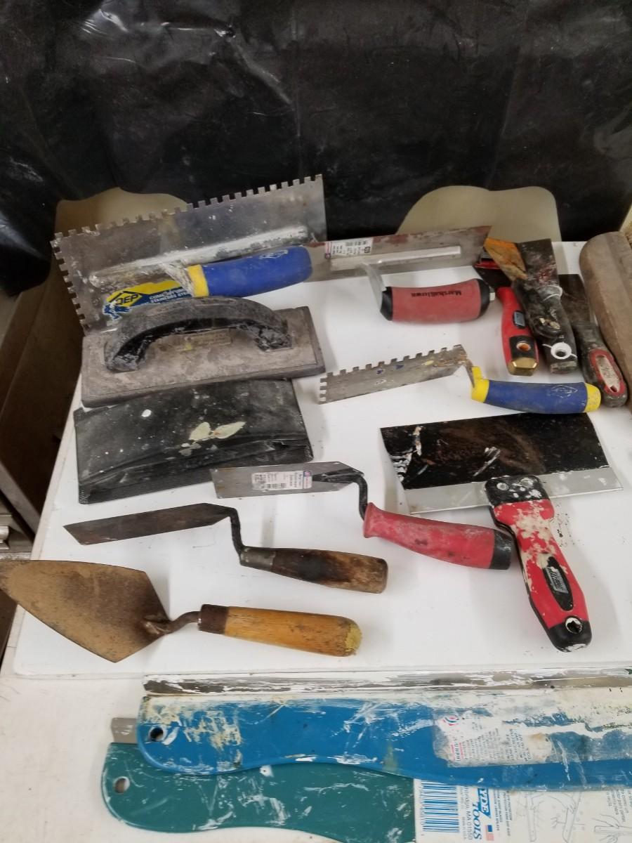 Various hand tools used to lay tile, paint, concrete finishing, etc. Comes with everything seen here. See pictures for more details.
