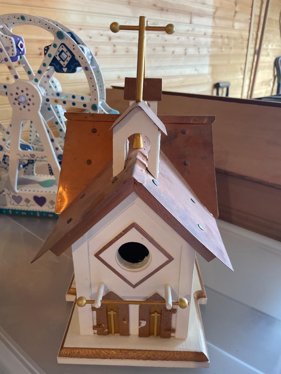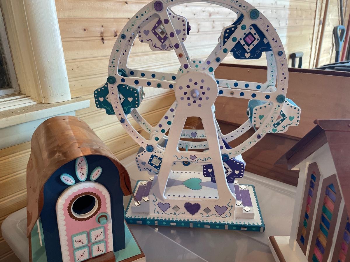 Painted bird houses & small wheel
