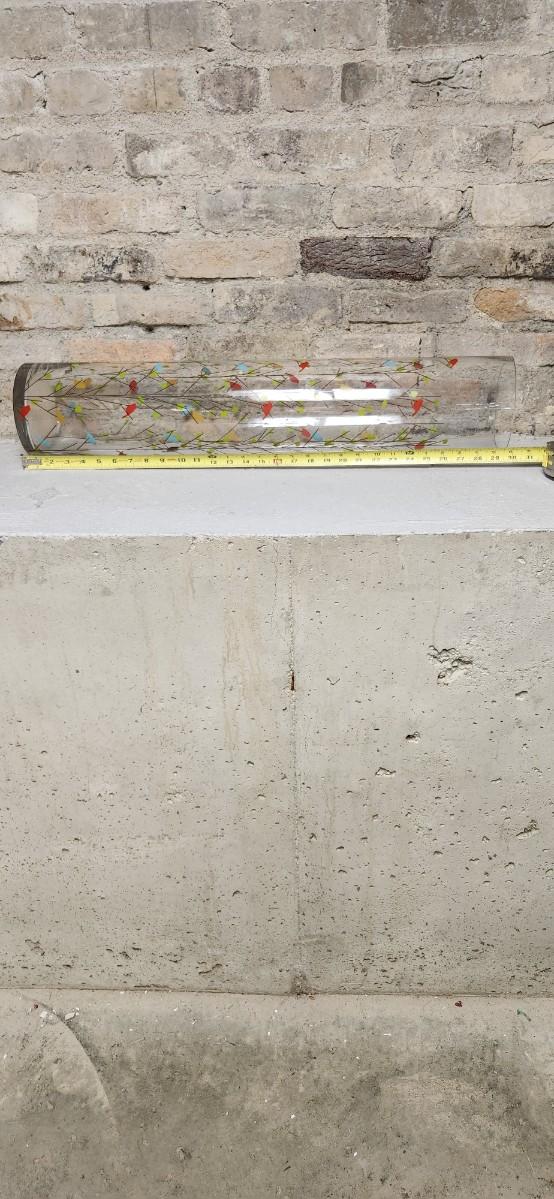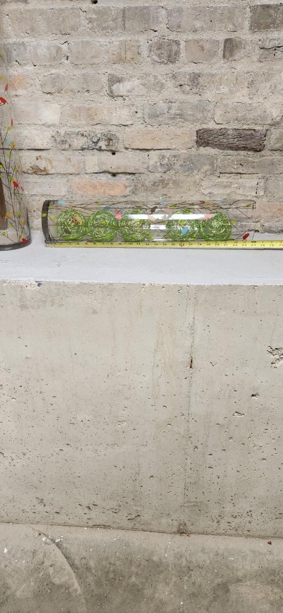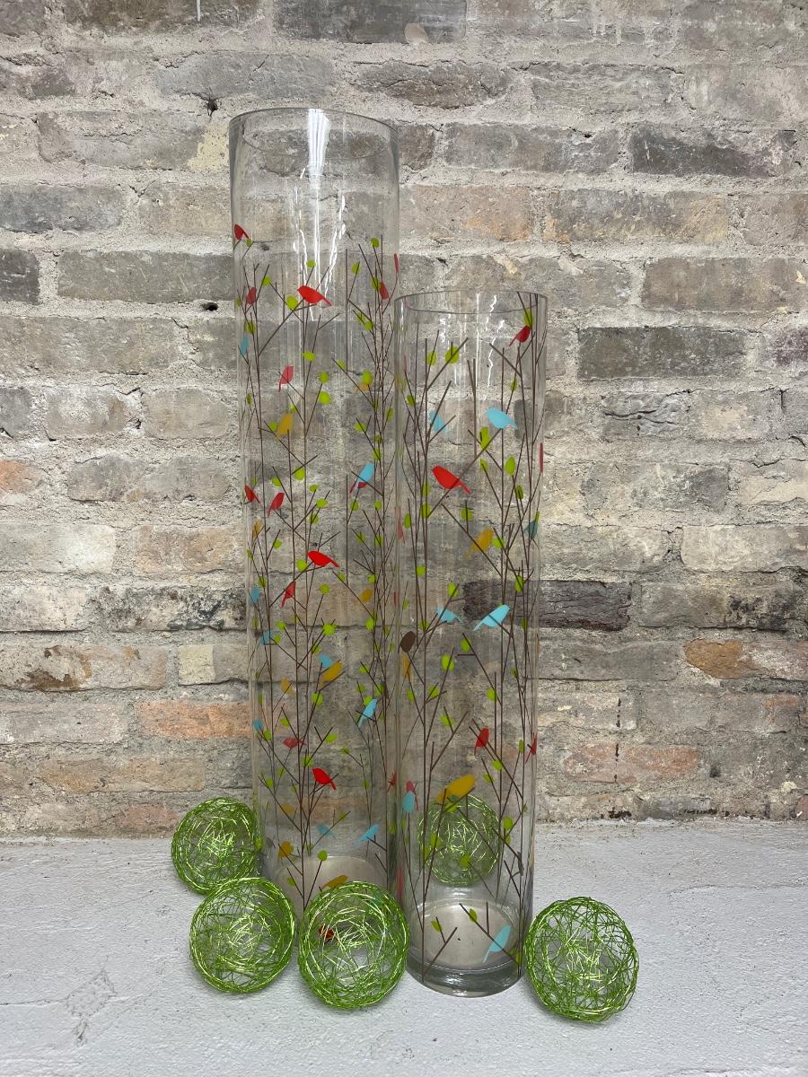 Pair of painted glass vases 30” and 24” tall, and six lime green decorative wire balls