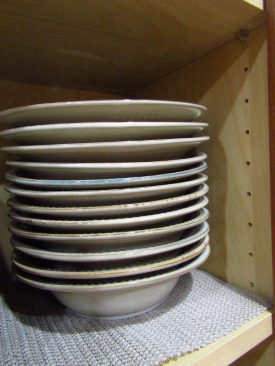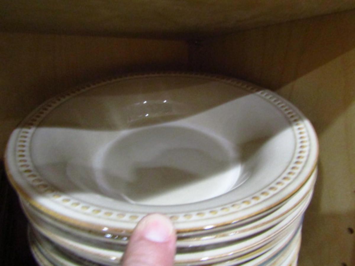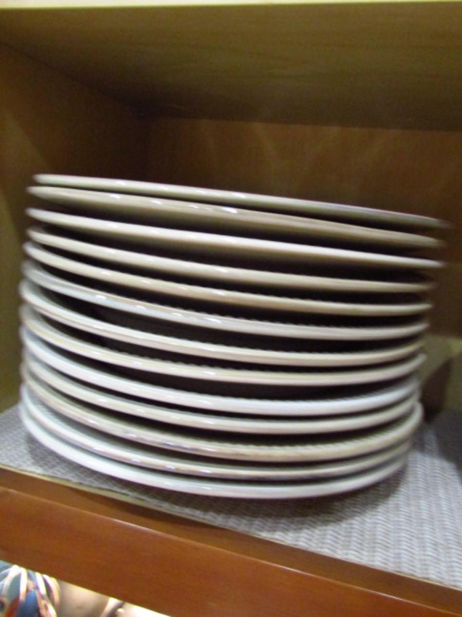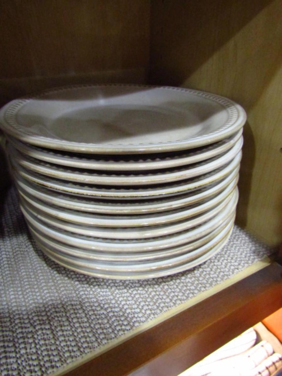Painted Ceramic Dinnerware from Pier 1 Imports- Spice Route Sesame Pattern- 36 Round Pieces (Kitchen). Dinner plates (10 3/4")- 13 pieces. Salad plates (8 1/2")- 11 pieces. Bowls (8 1/4" wide, 2" deep)- 12 pieces. In used condition- may be occasional chip or crack. Plate stands not included.