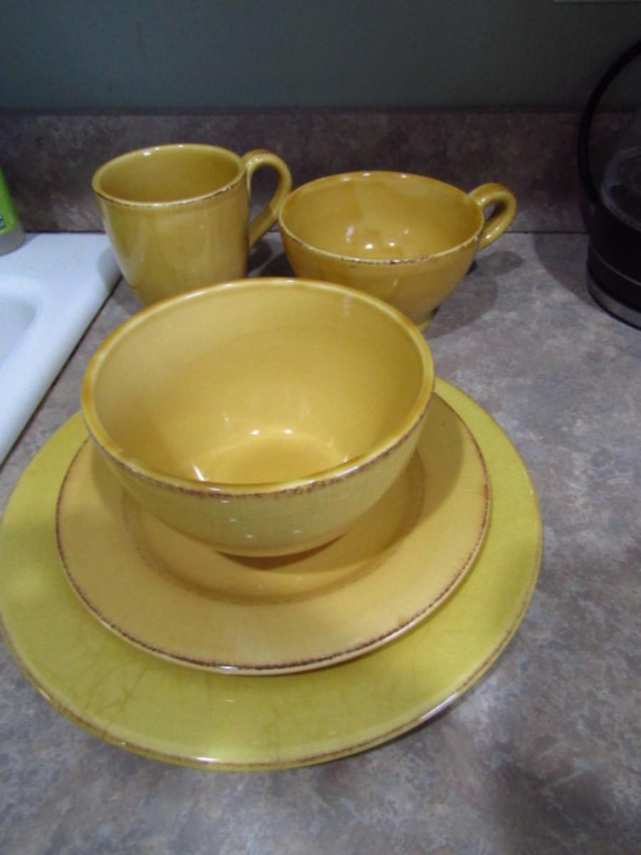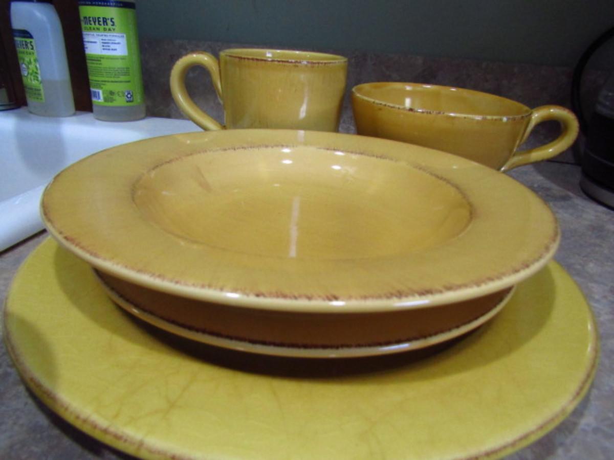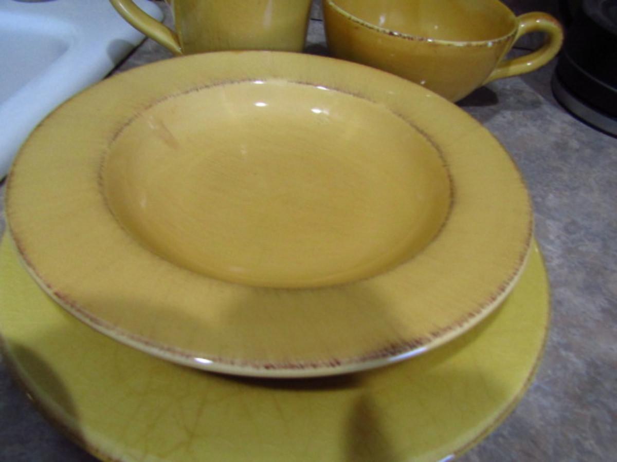 Painted Ceramic Dinnerware from Pier 1 Imports- Toscana Gold Pattern- Approx 24 Pieces (Apt). 4 each of dinner plate, bread plate, salad/soup bowl, cereal bowl, mug, and cafe ole' style mug. In used condition- please expect occasional chipping/crazing.