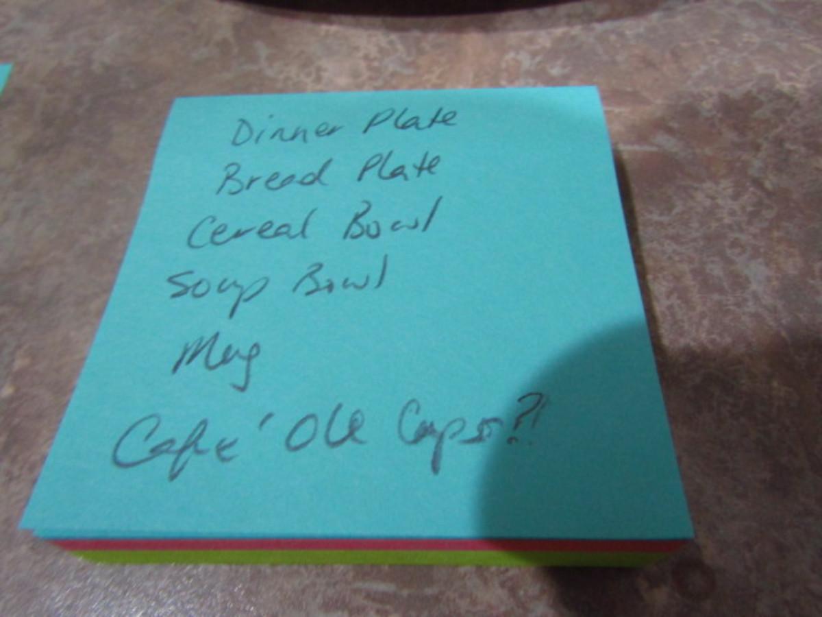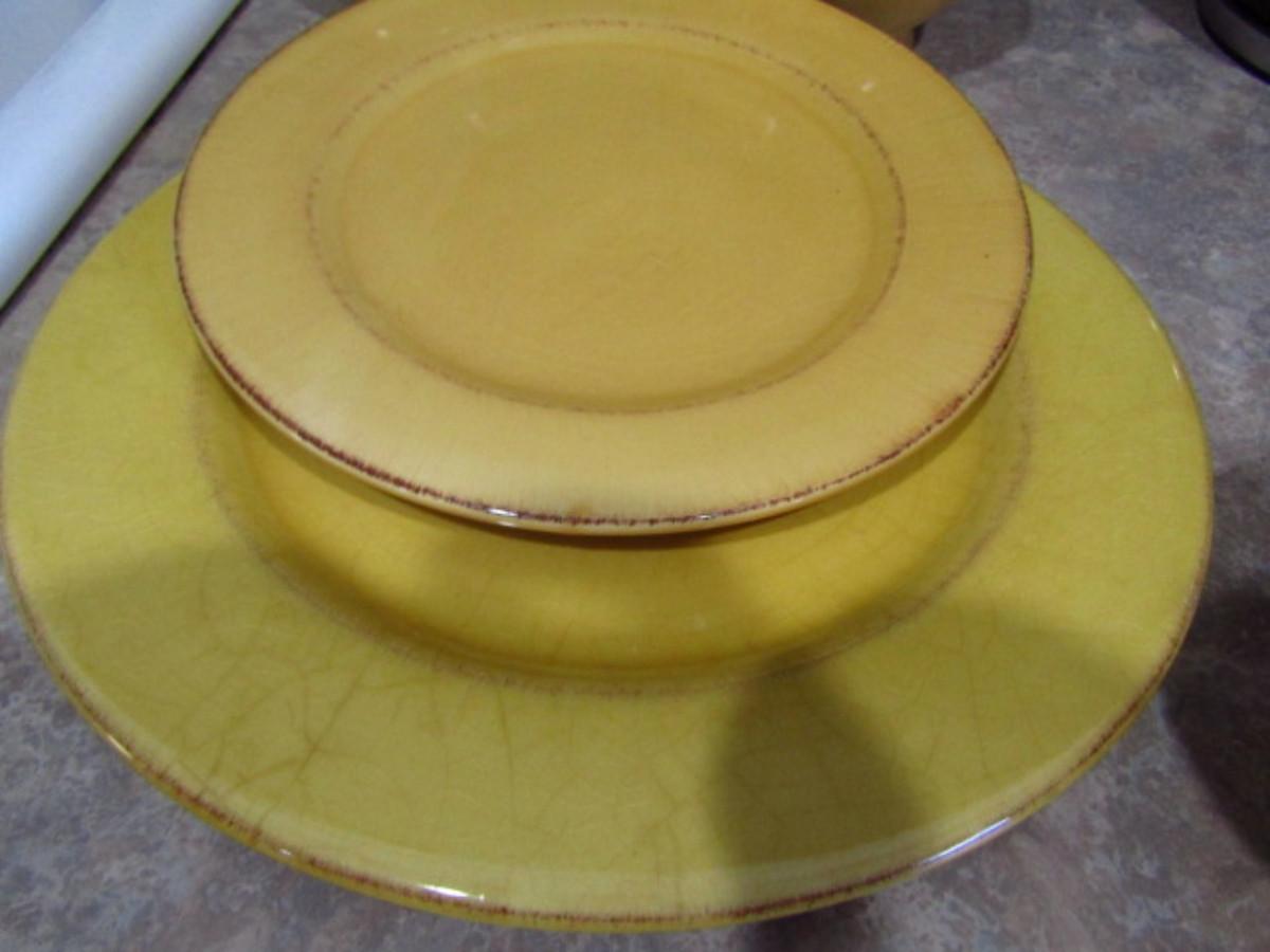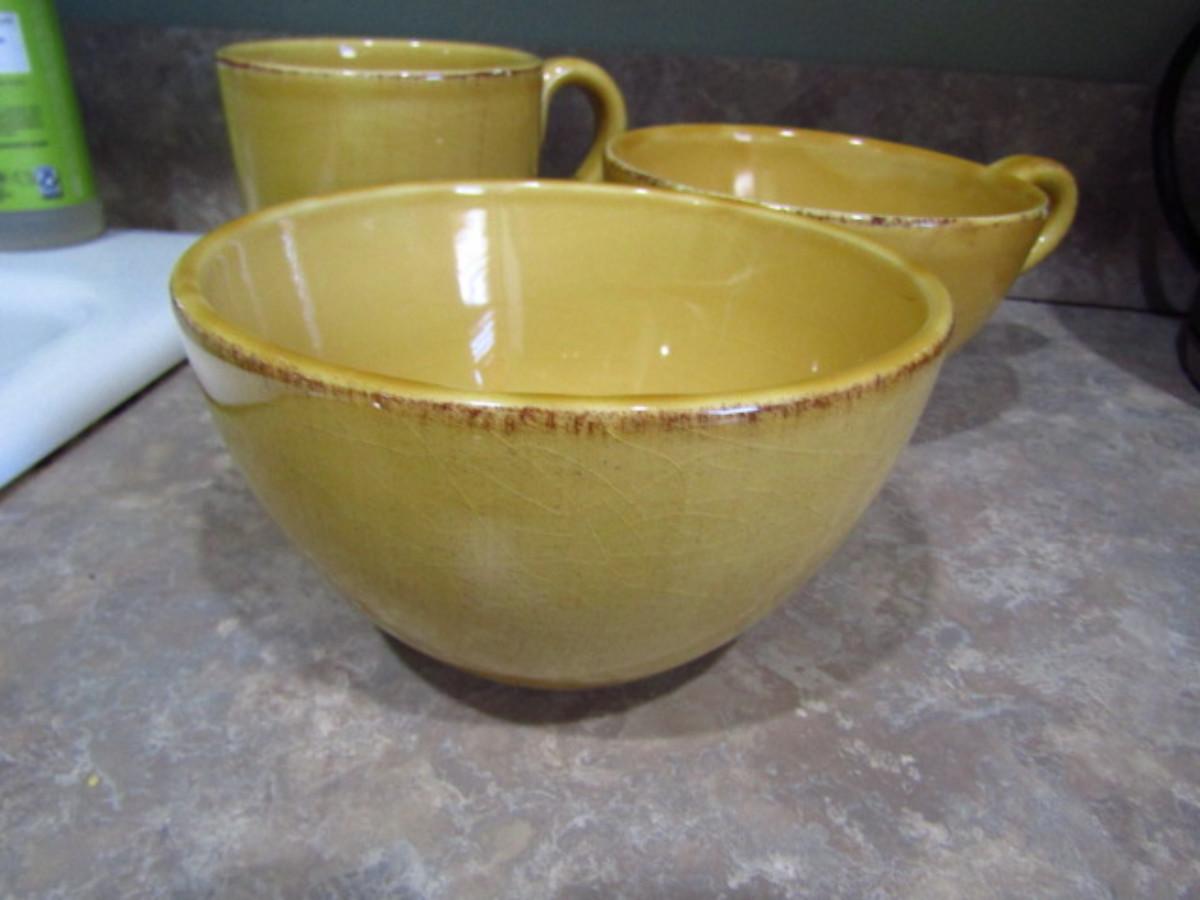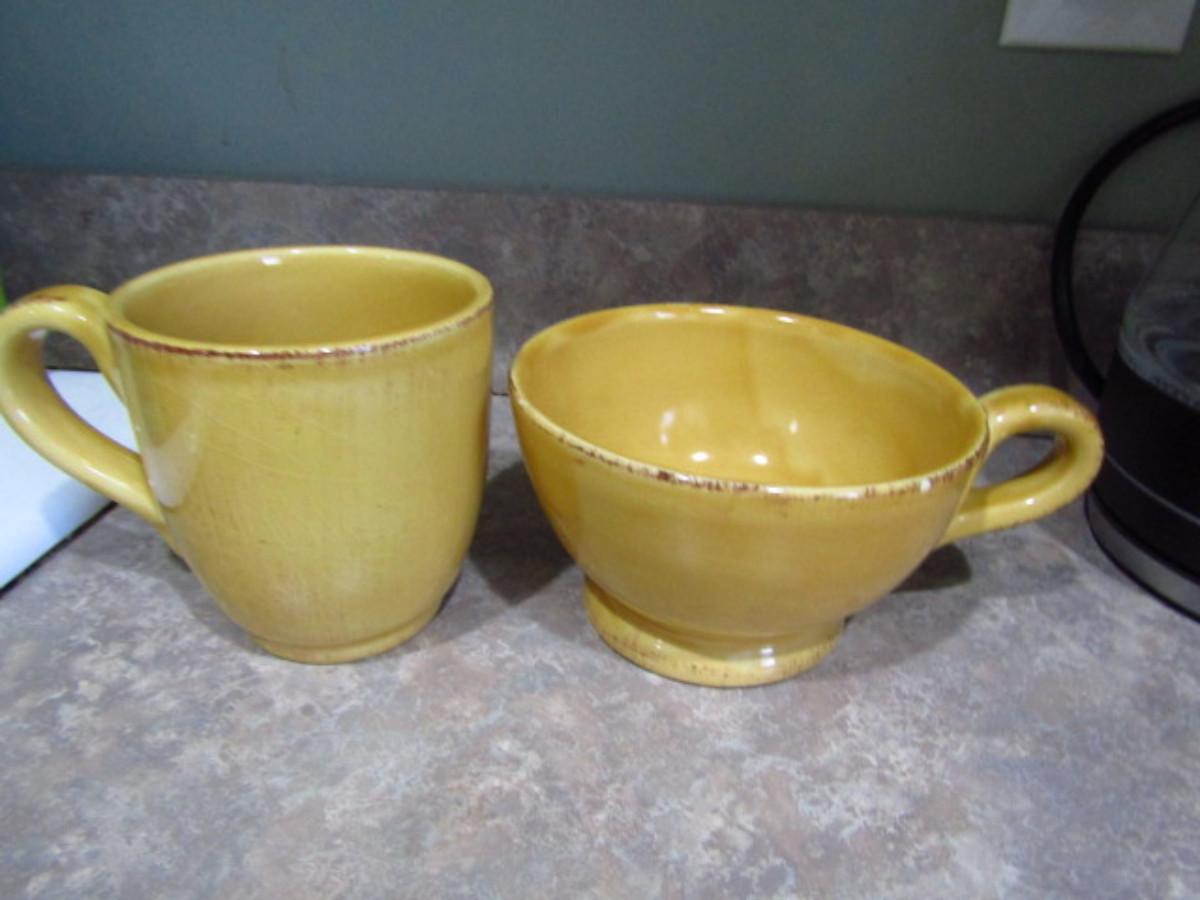 Painted Ceramic Dinnerware from Pier 1 Imports- Toscana Gold Pattern- Approx 24 Pieces (Apt). 4 each of dinner plate, bread plate, salad/soup bowl, cereal bowl, mug, and cafe ole' style mug. In used condition- please expect occasional chipping/crazing.