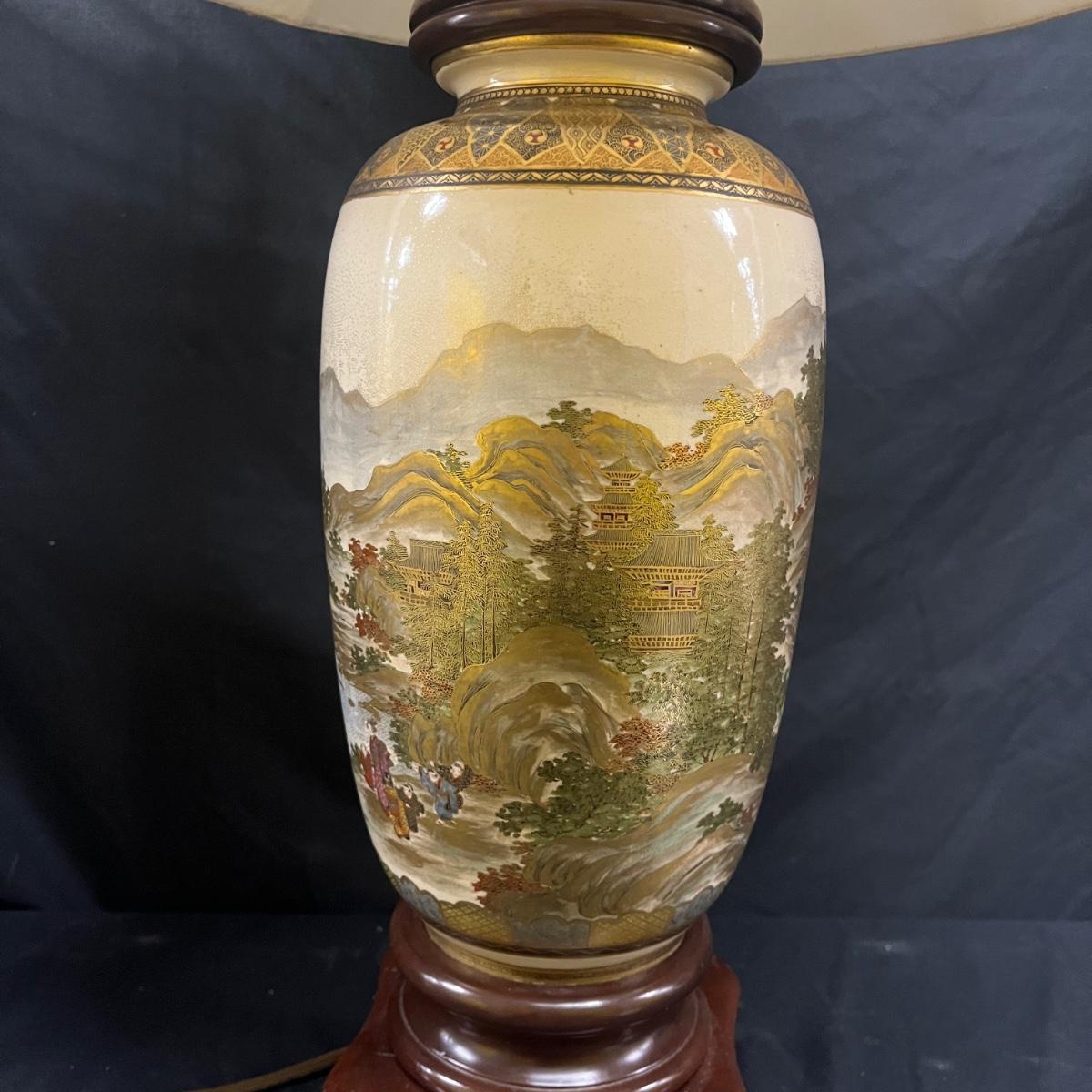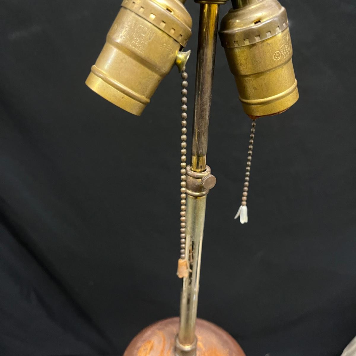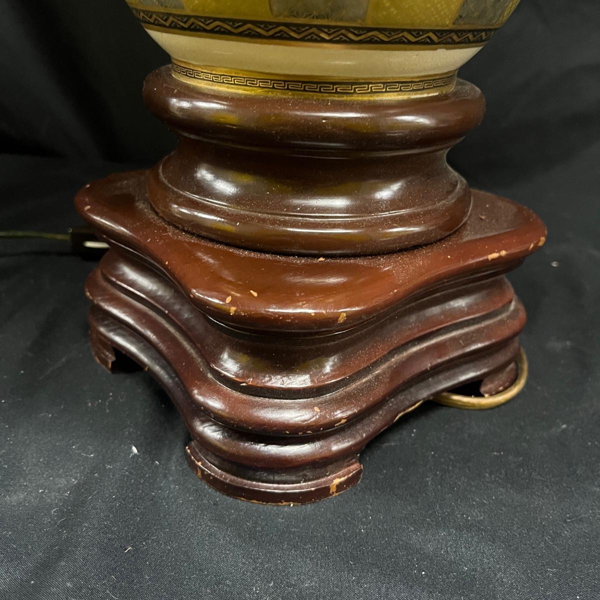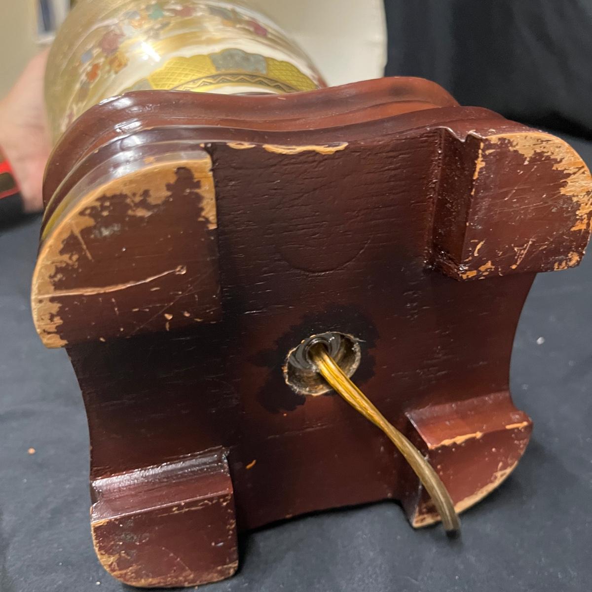 This table lamp has a wooden base with ceramic body that appears to be a village painted on it. Lamp has two bulb receptacles that powered on when plugged in. Lamp measures 5.5” x 5.5” x 31”H without shade. Lamp has inline on/off switch.