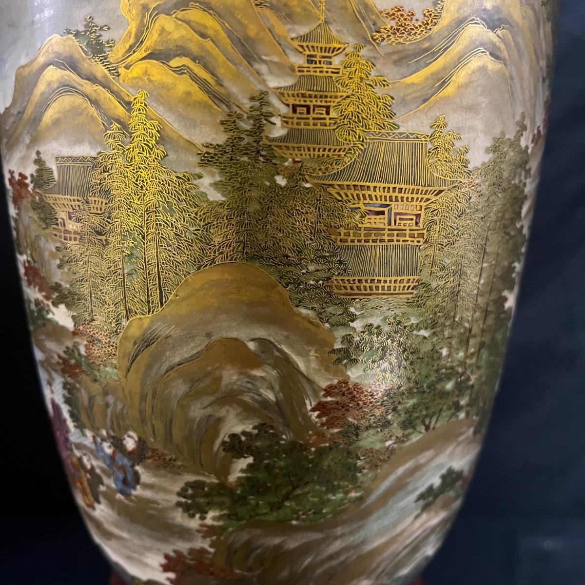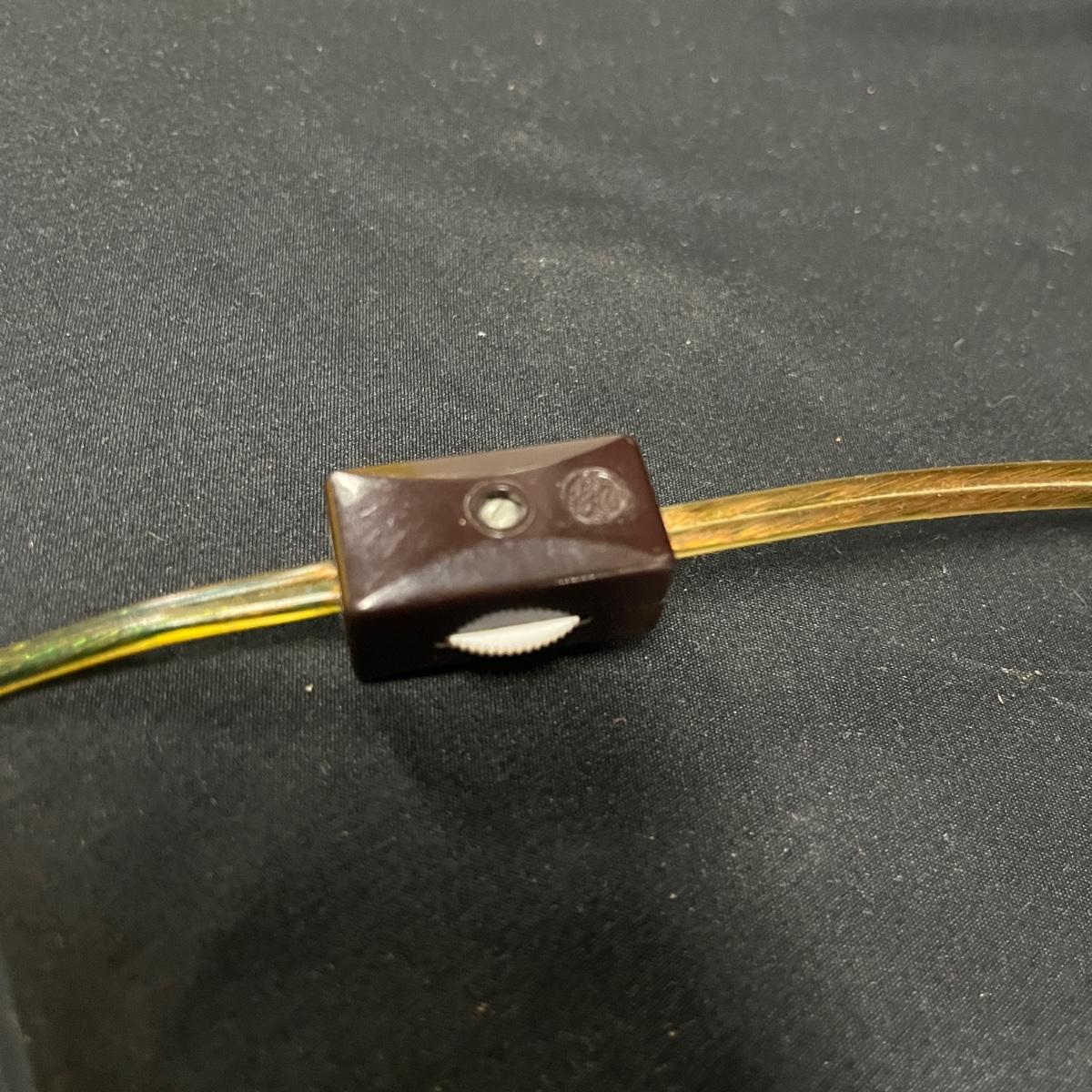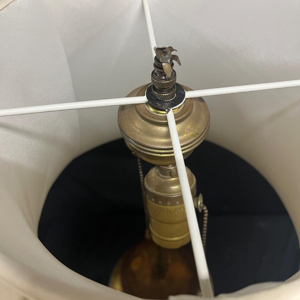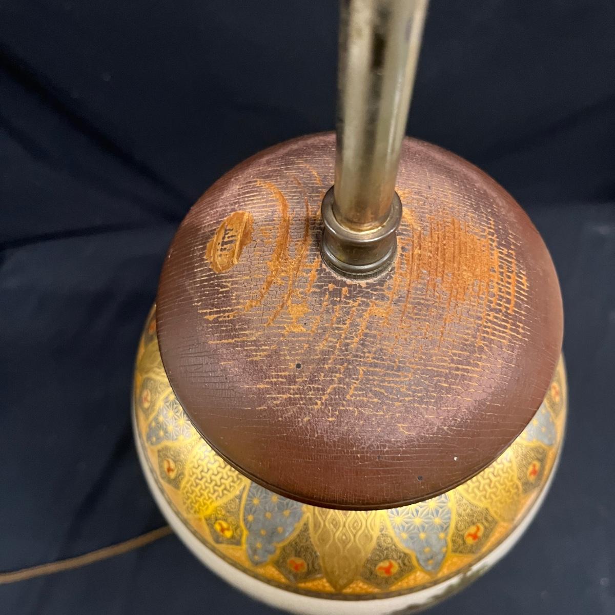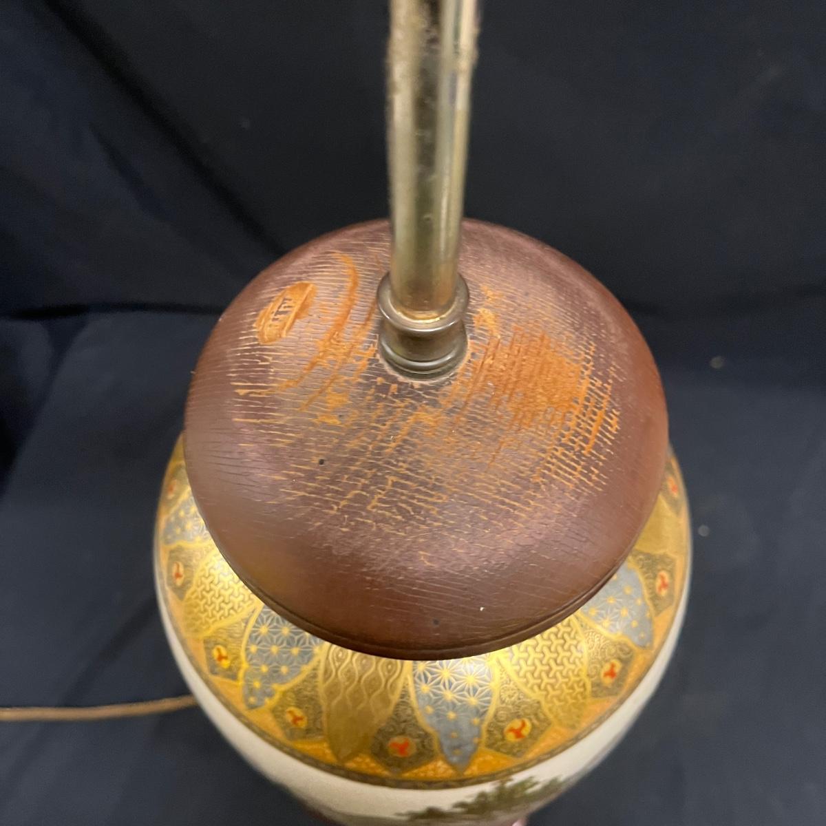 This table lamp has a wooden base with ceramic body that appears to be a village painted on it. Lamp has two bulb receptacles that powered on when plugged in. Lamp measures 5.5” x 5.5” x 31”H without shade. Lamp has inline on/off switch.