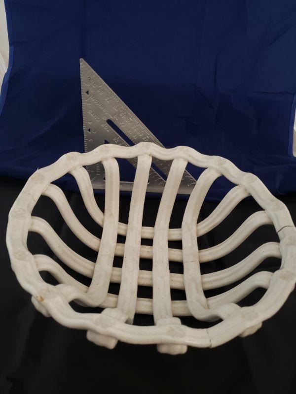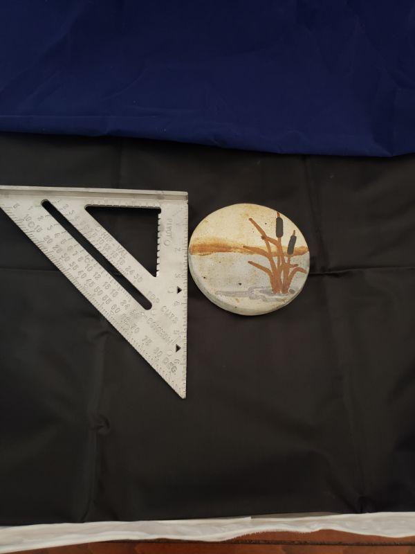 Circular clay tablet has an image of cattail plants in a lake by what looks like a sun set.