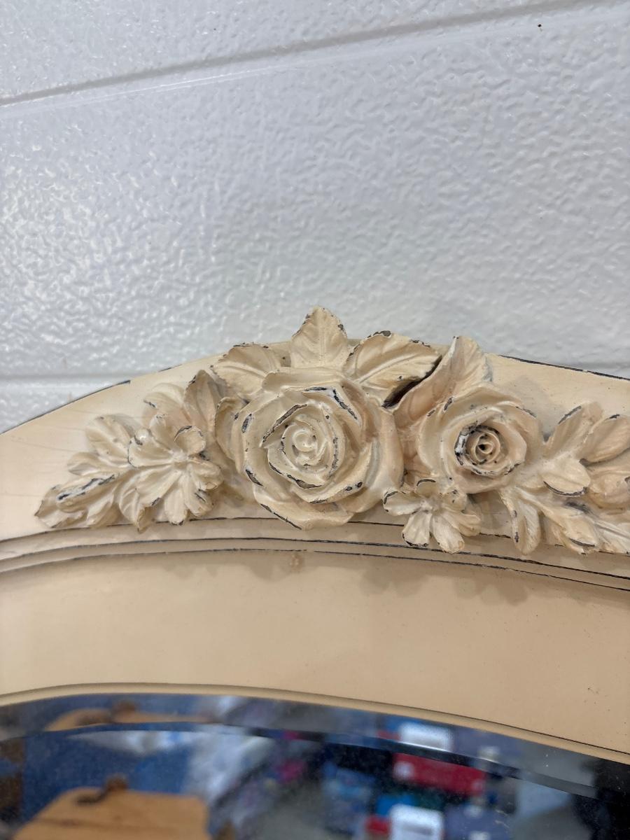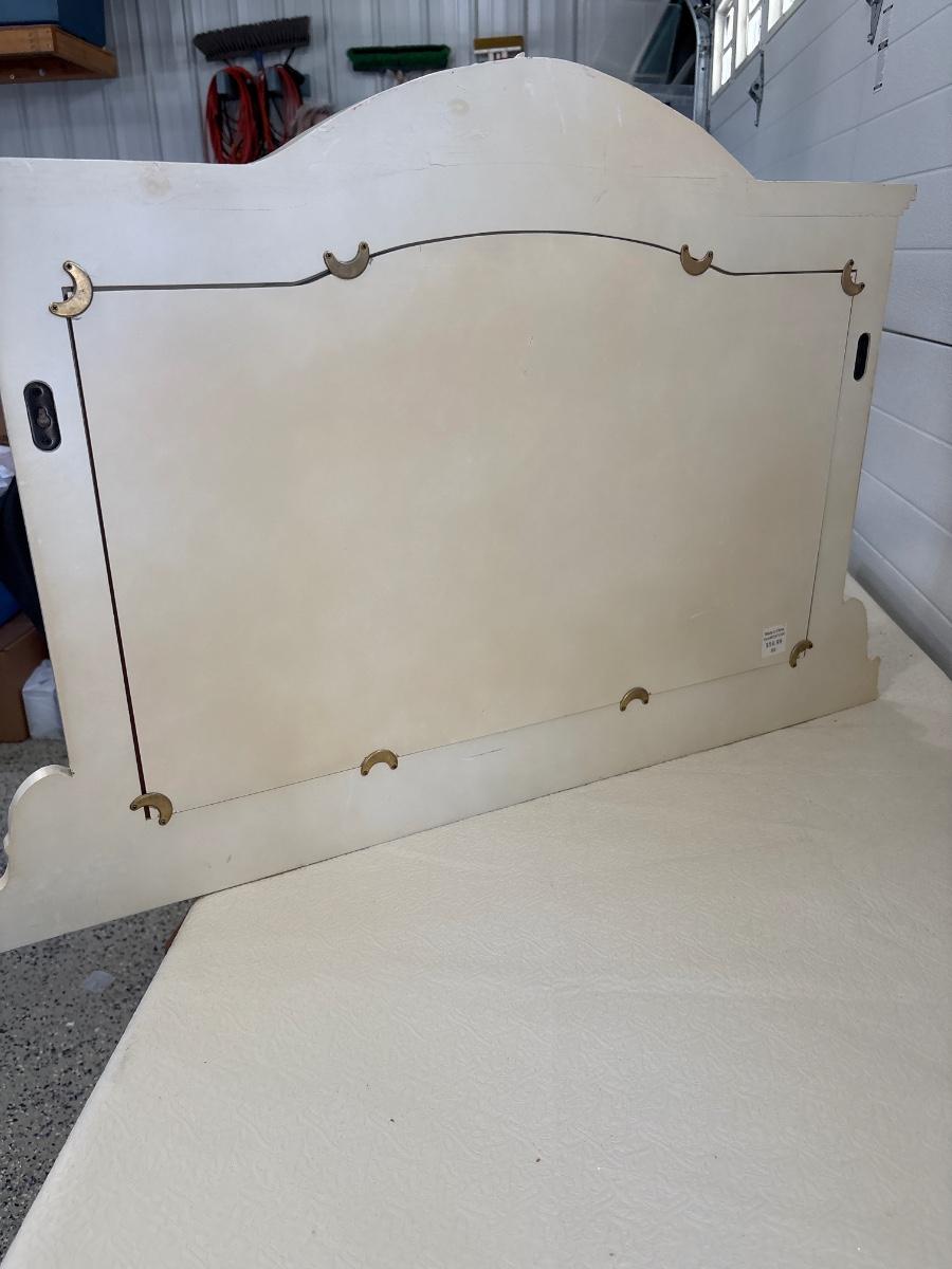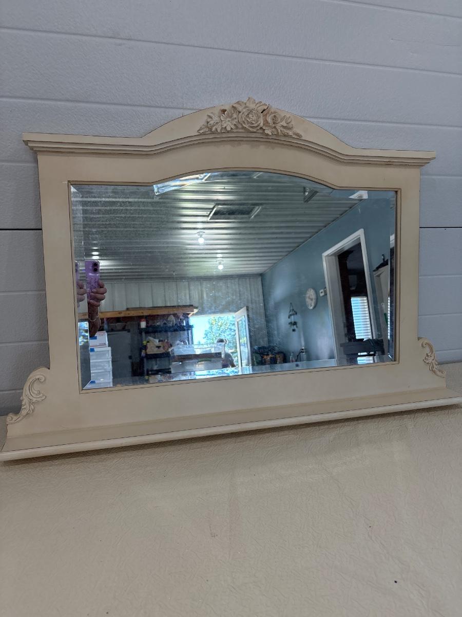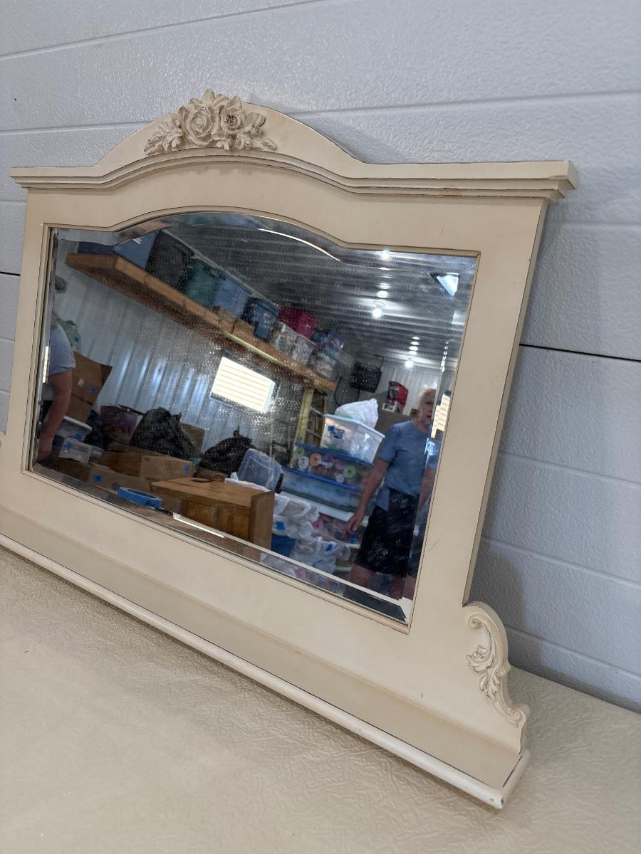 Measures 36 inches wide by 24 inches height. Cream colored white wood with deviled mirror shelf..