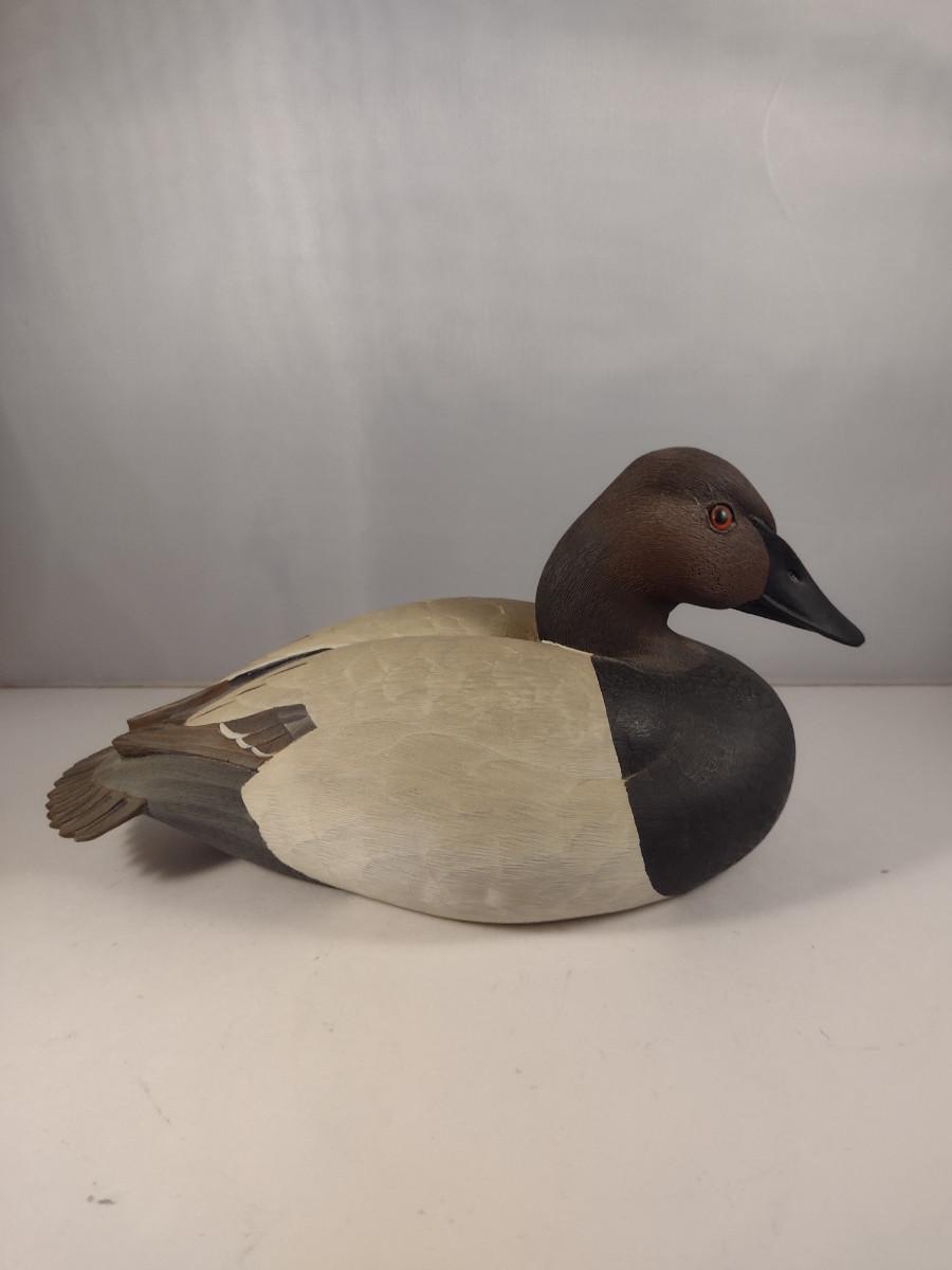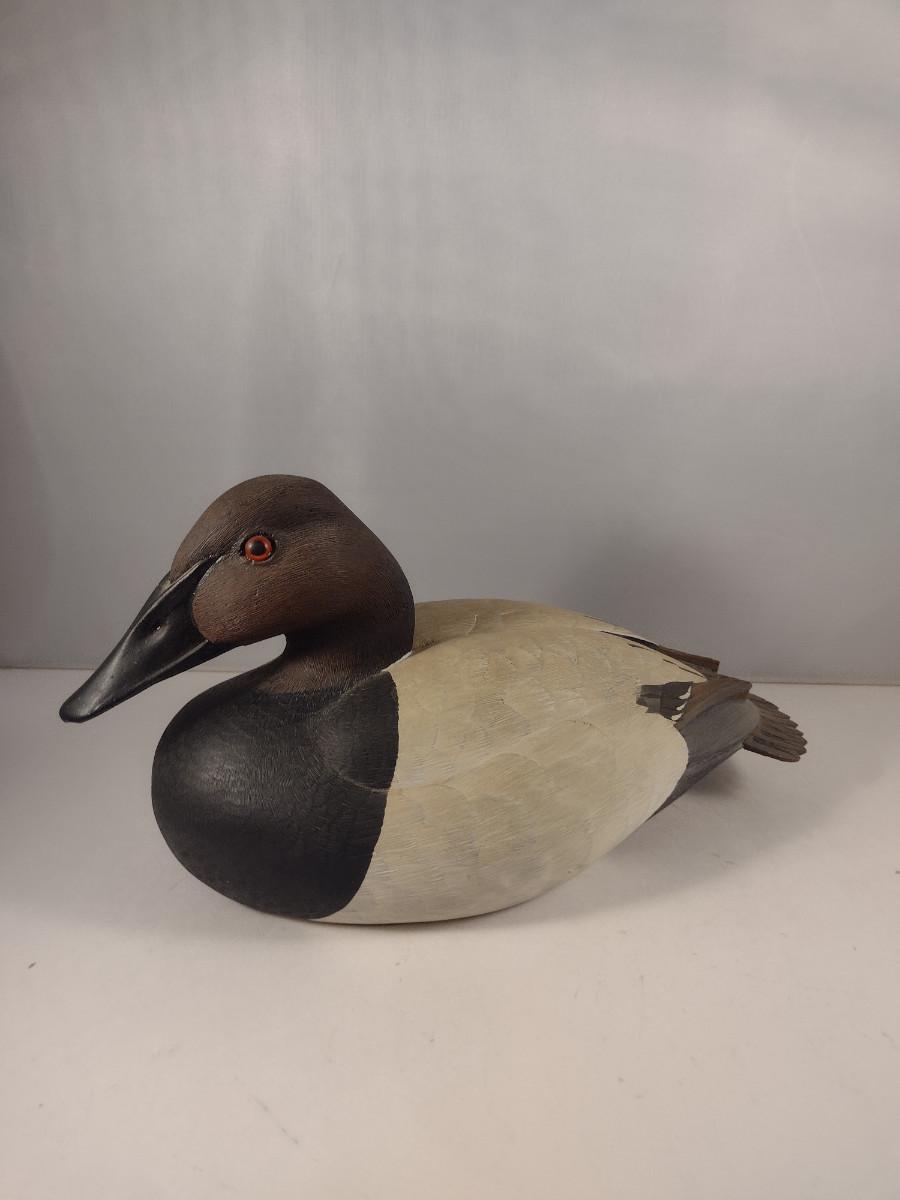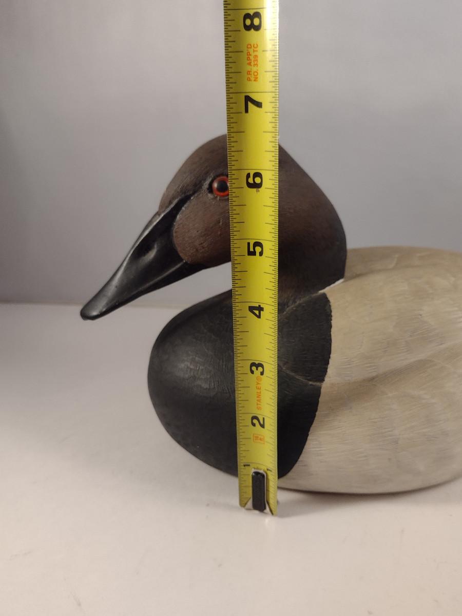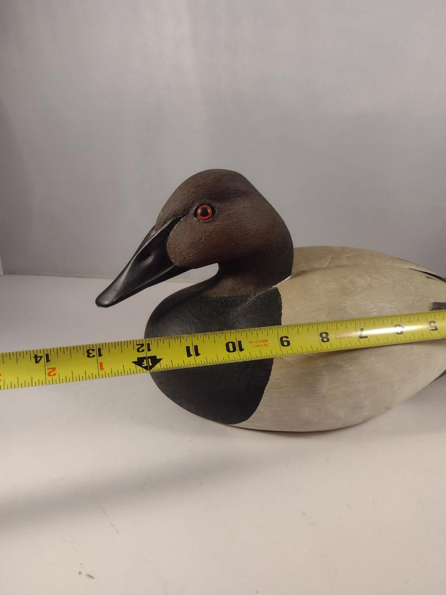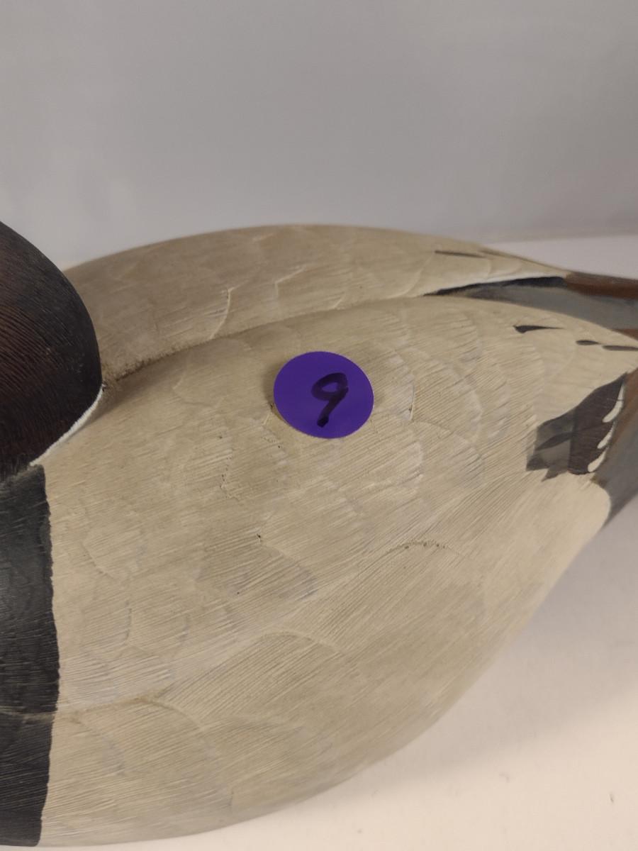 Painted Duck Decoy (#9). Maker's mark is not discernable. Item measures approx 6 1/2" tall, 13" long.