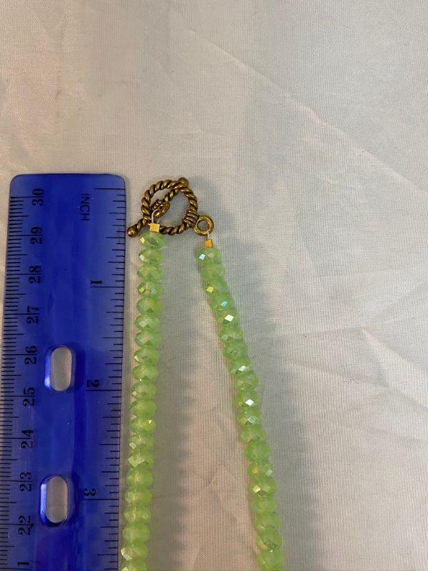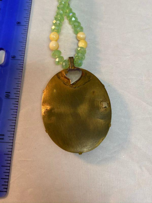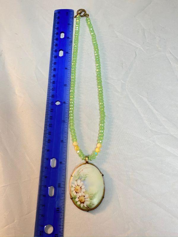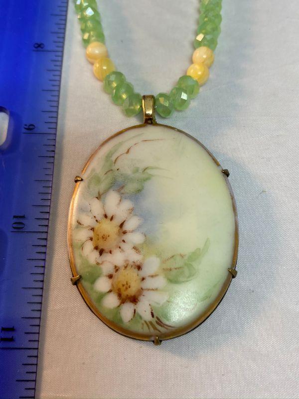 Painted flower pendant necklace. Pendant has the look of antique flower flower painted china, similar to Limoges or old Bavarian porcelain. Age unknown. Necklace is pale green prism beads.