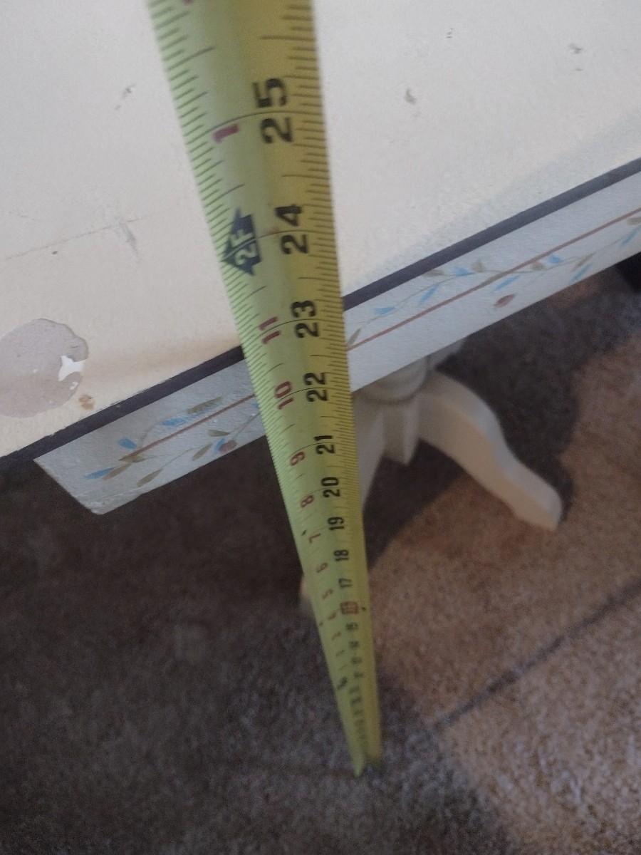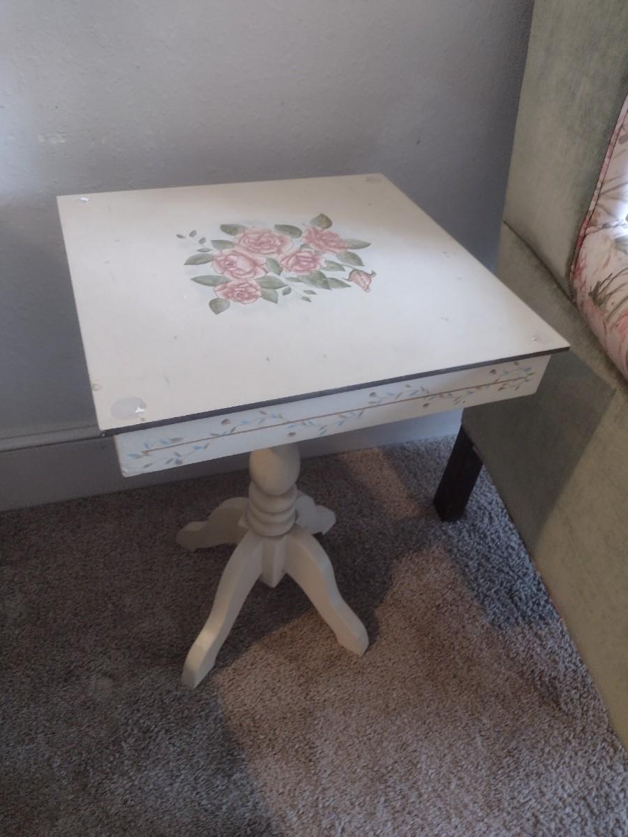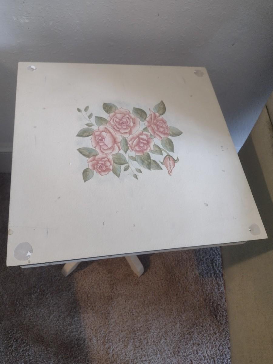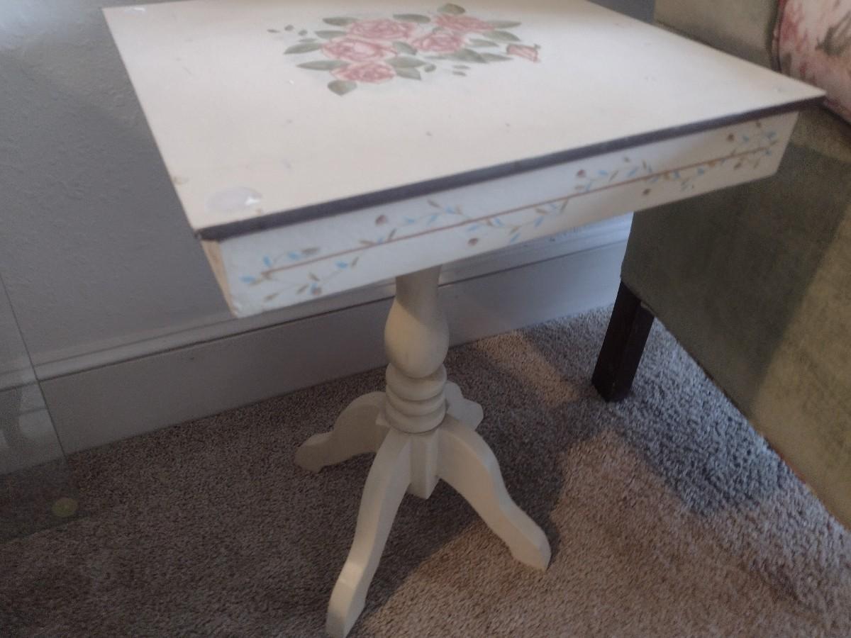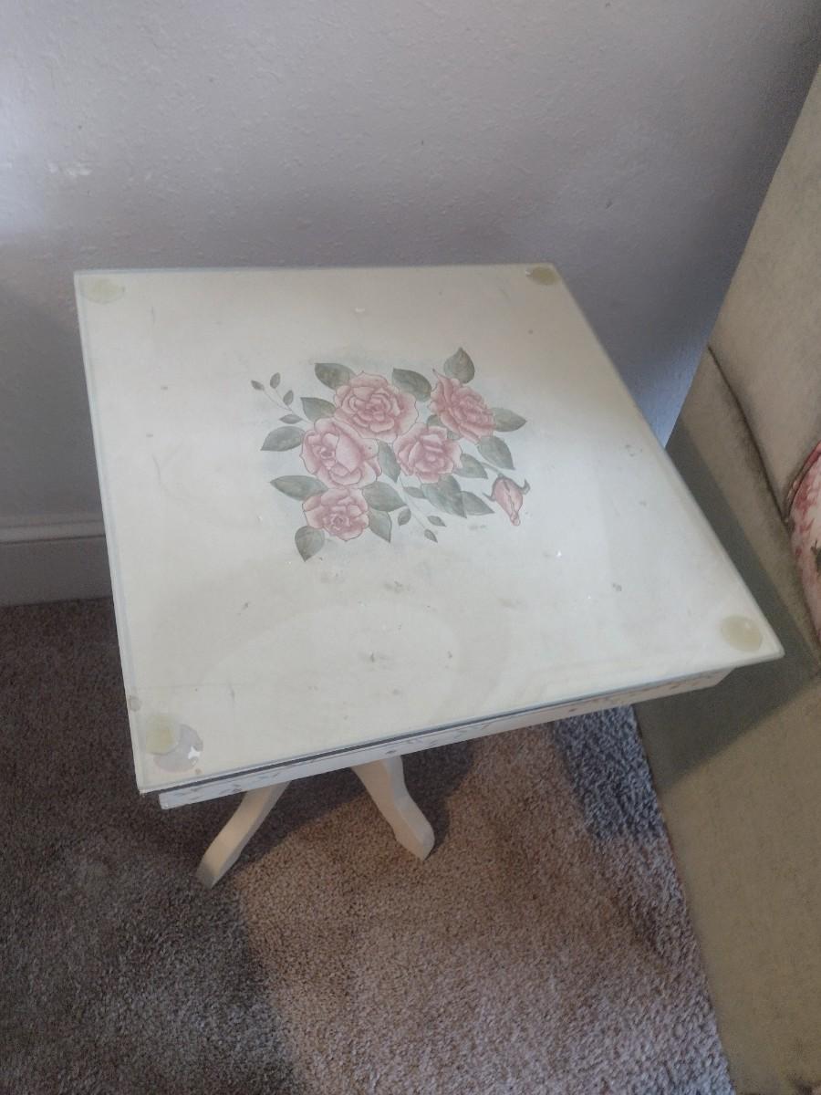 Painted French Country Design Accent Table. Has some paint missing where glass top sits. Upstairs item.