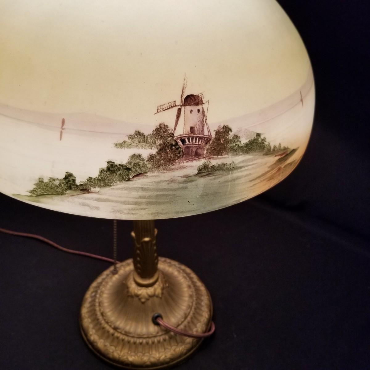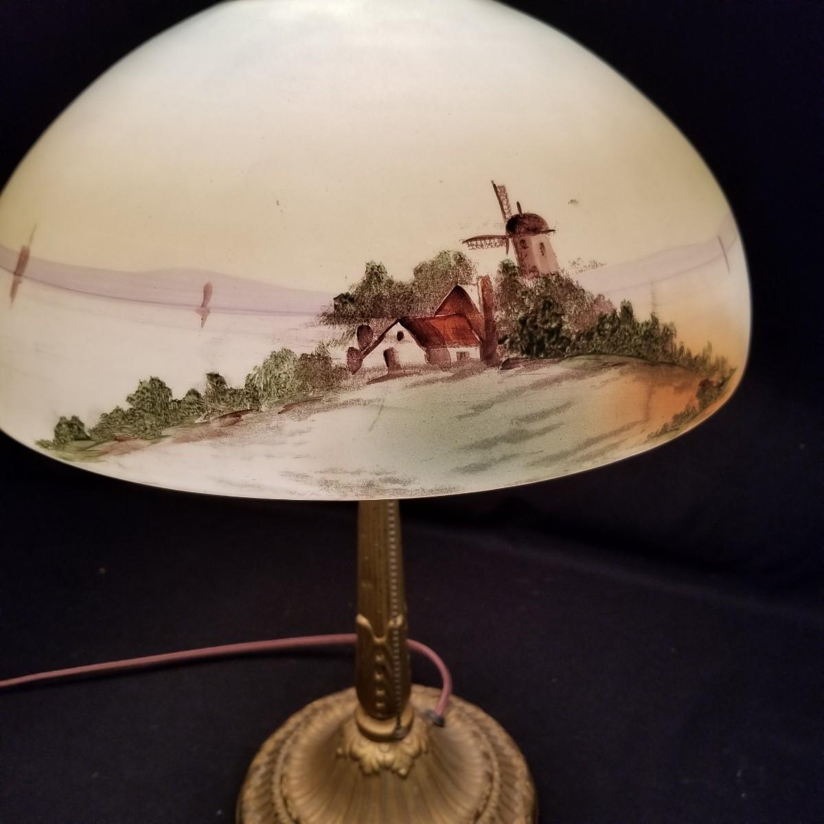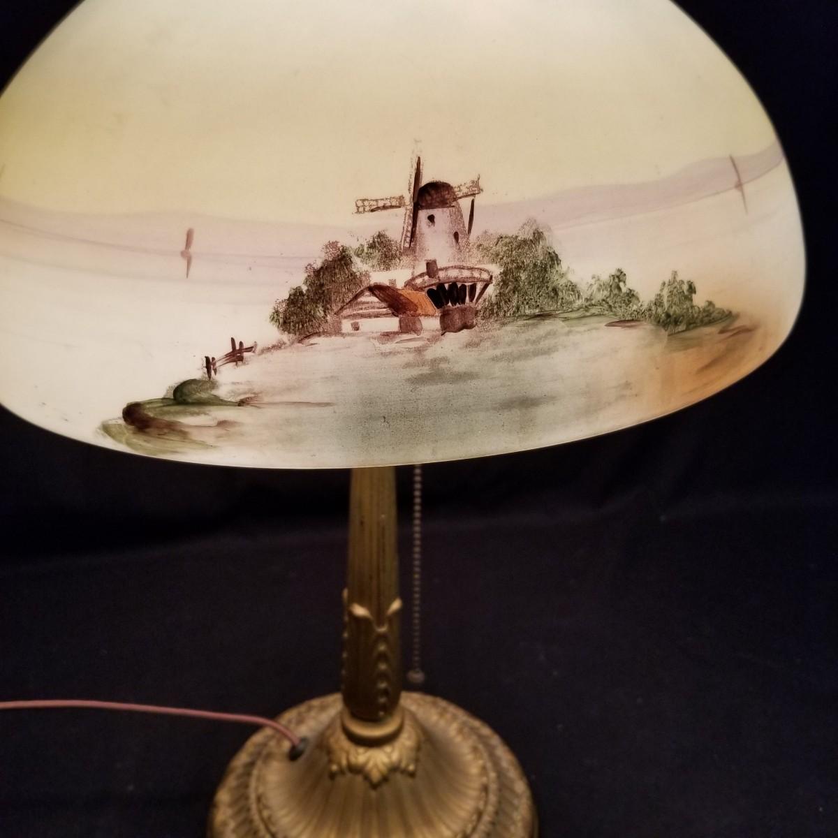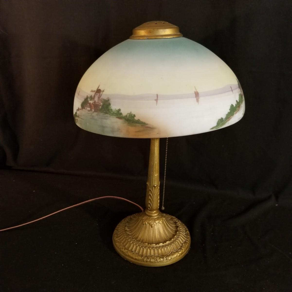 Table lamp has opaque glass shade with windmill scenes painted on it. It has a heavy cast ornate golden base, a pull chain, and a newer cord. Lamp is 18" high and shade is 13" diameter. Turned on when tested. Very good condition. Shipping available.