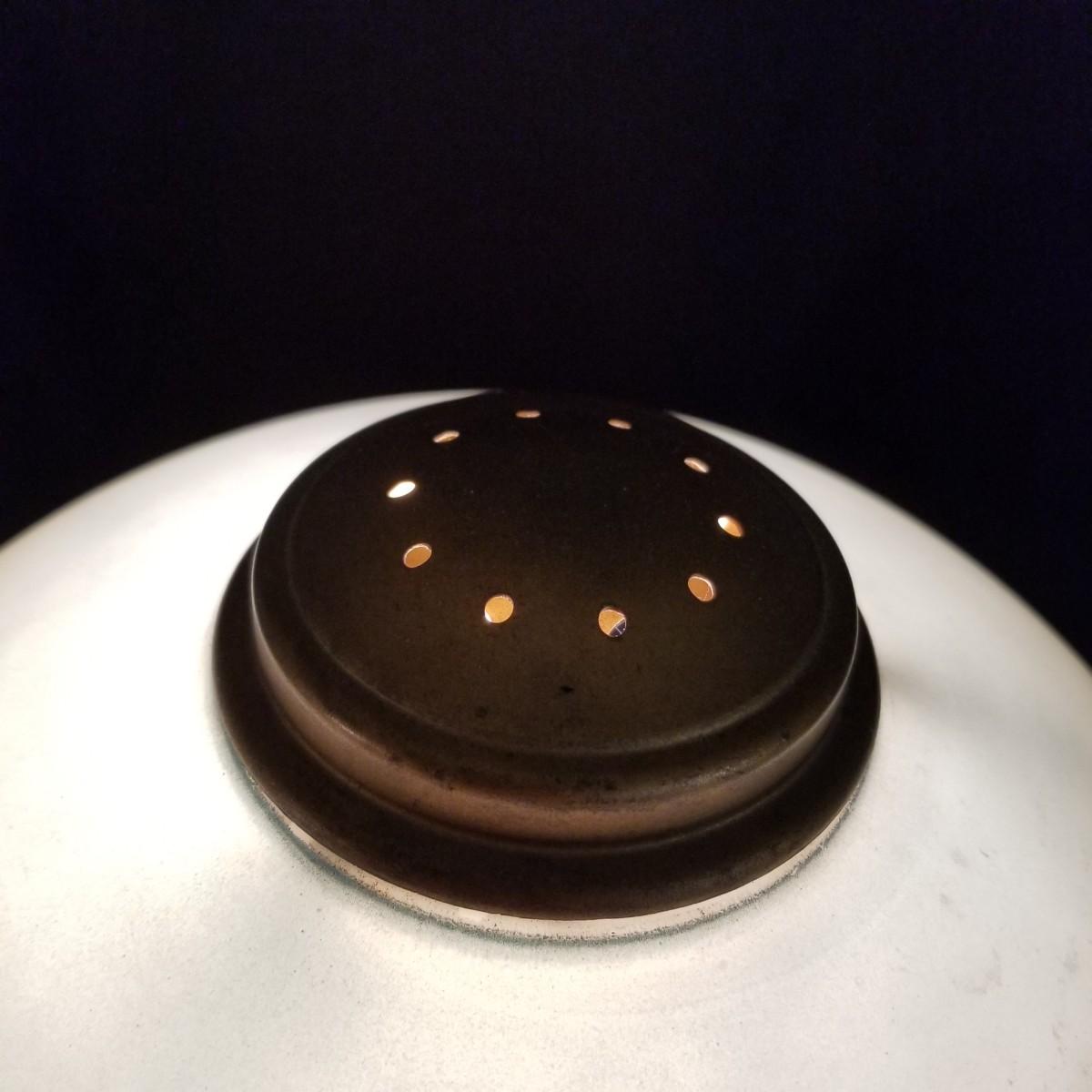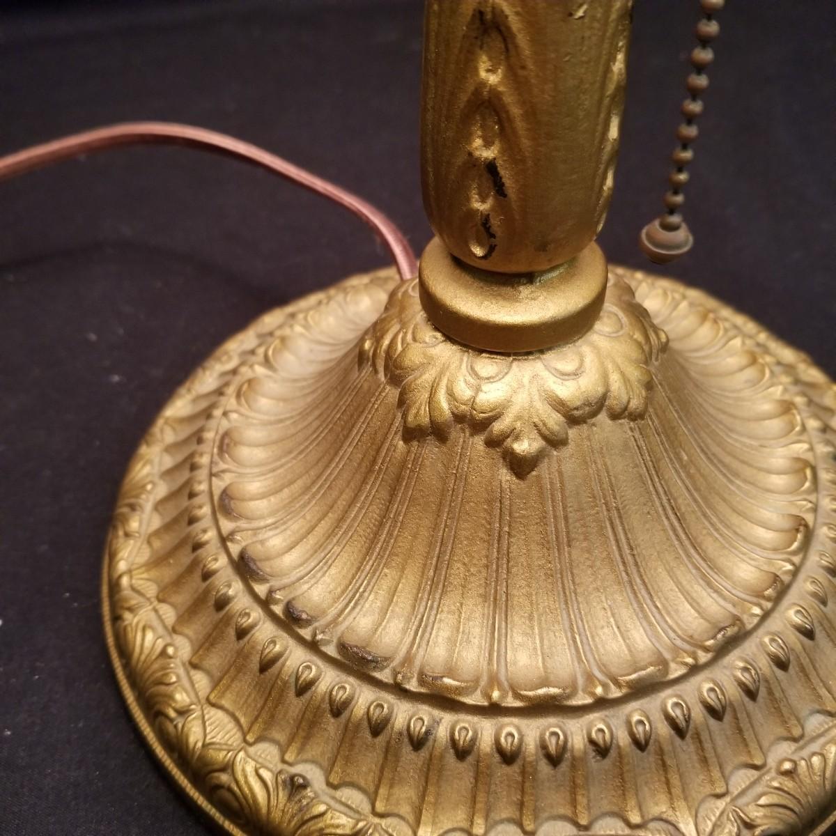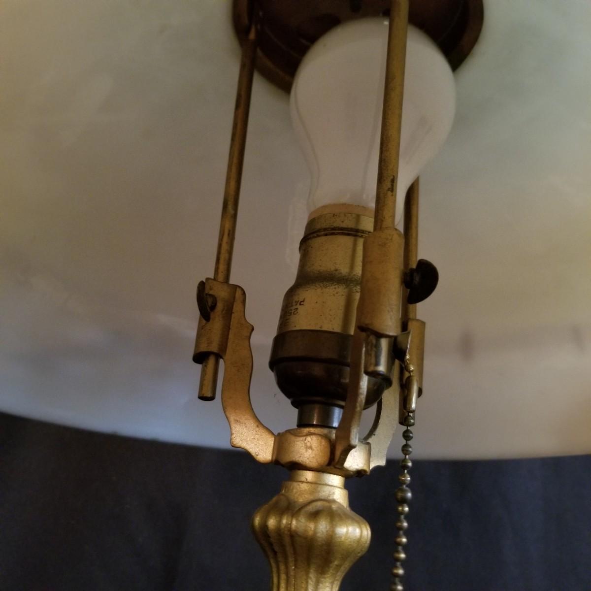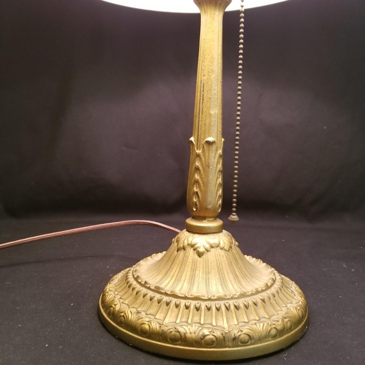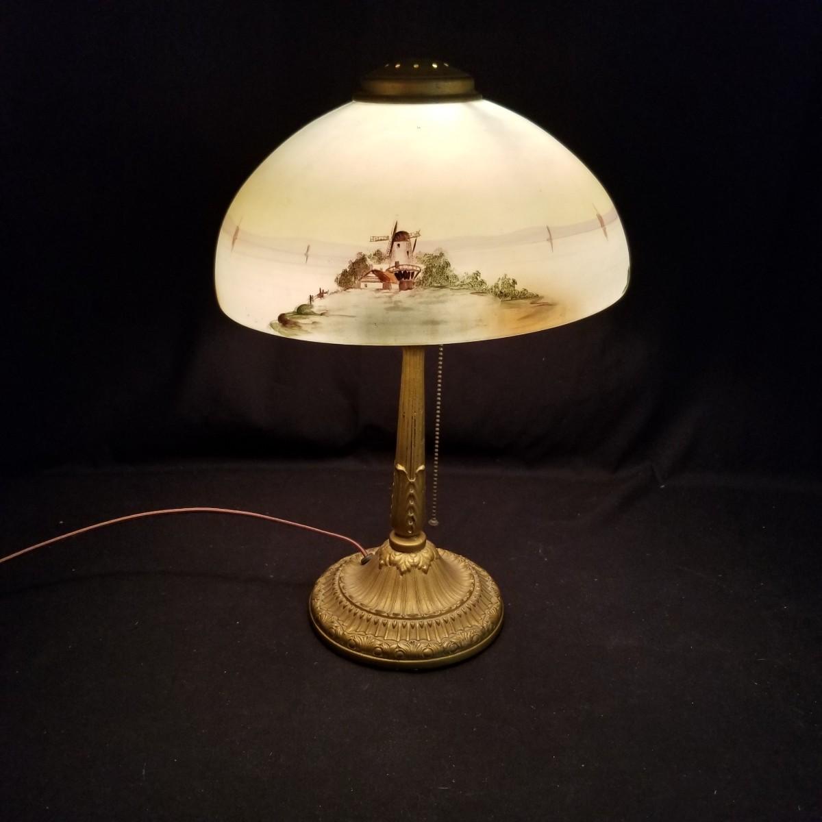 Table lamp has opaque glass shade with windmill scenes painted on it. It has a heavy cast ornate golden base, a pull chain, and a newer cord. Lamp is 18" high and shade is 13" diameter. Turned on when tested. Very good condition. Shipping available.