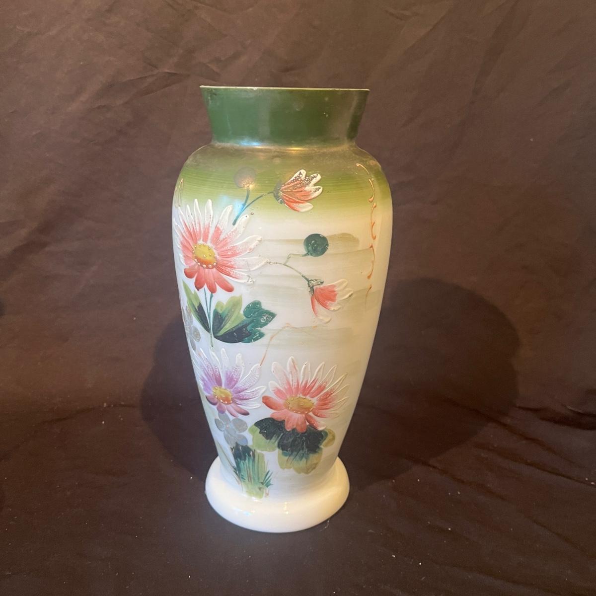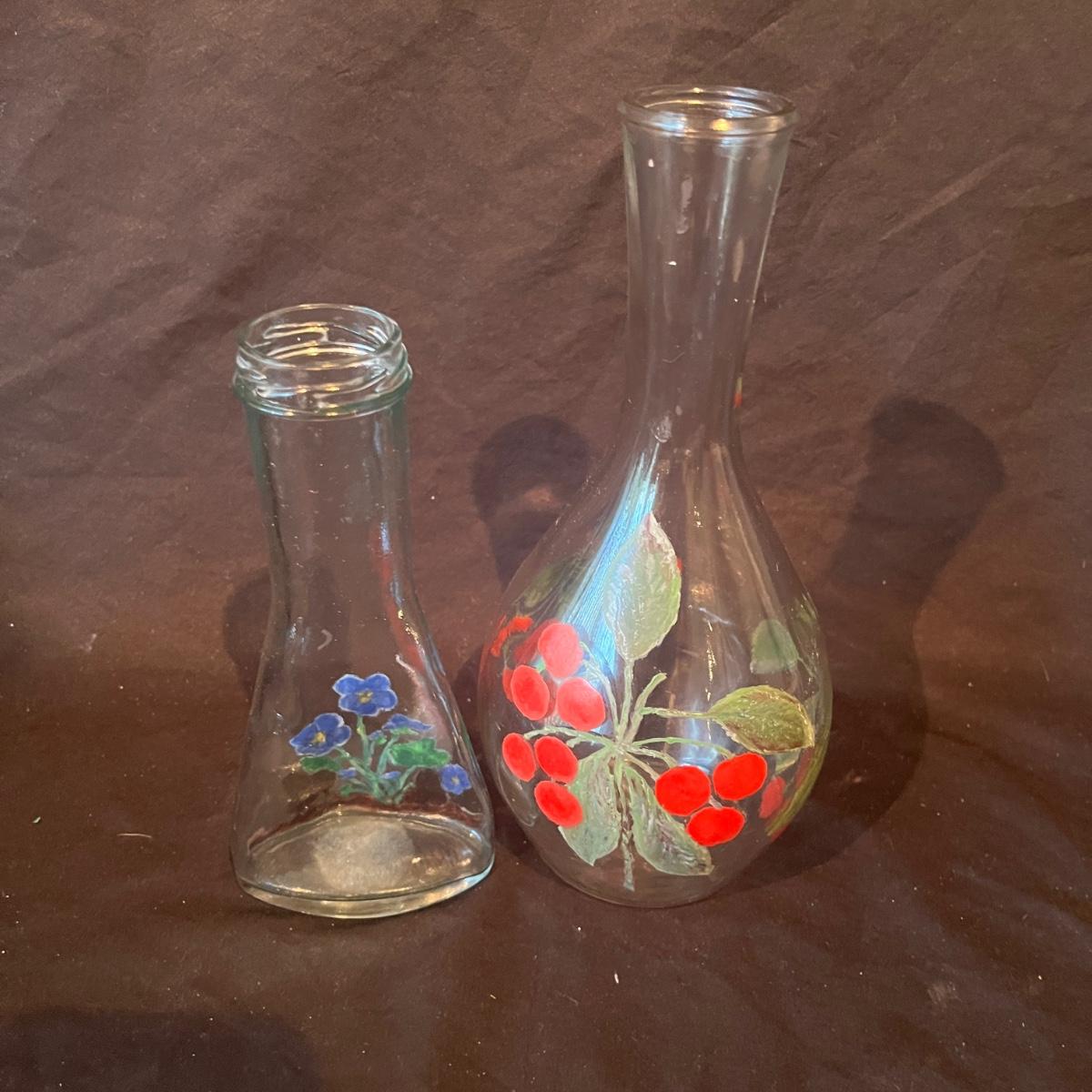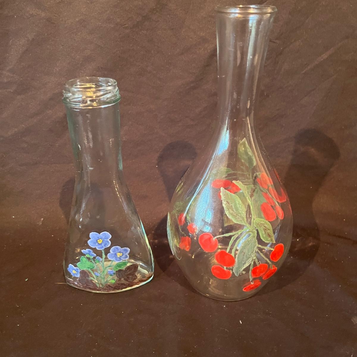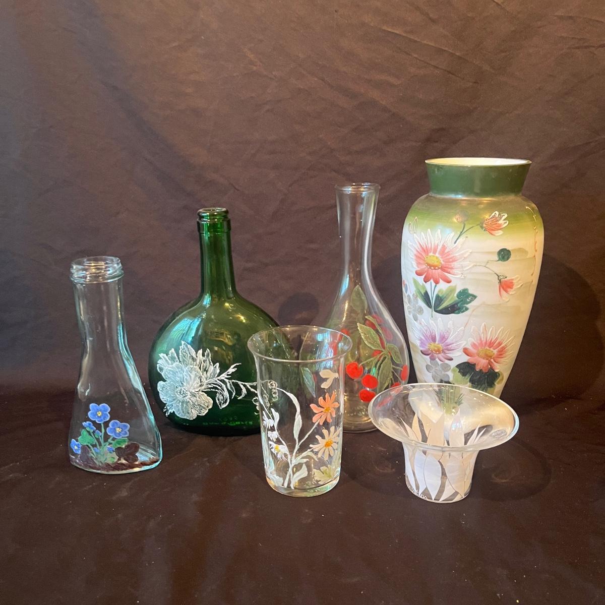 Lot contains six painted glass vases including three repurposed bottles, two glass style vases and a white glass urn shaped vase. White vase measures 5”D x 10” H. All pieces are signed except white vase.