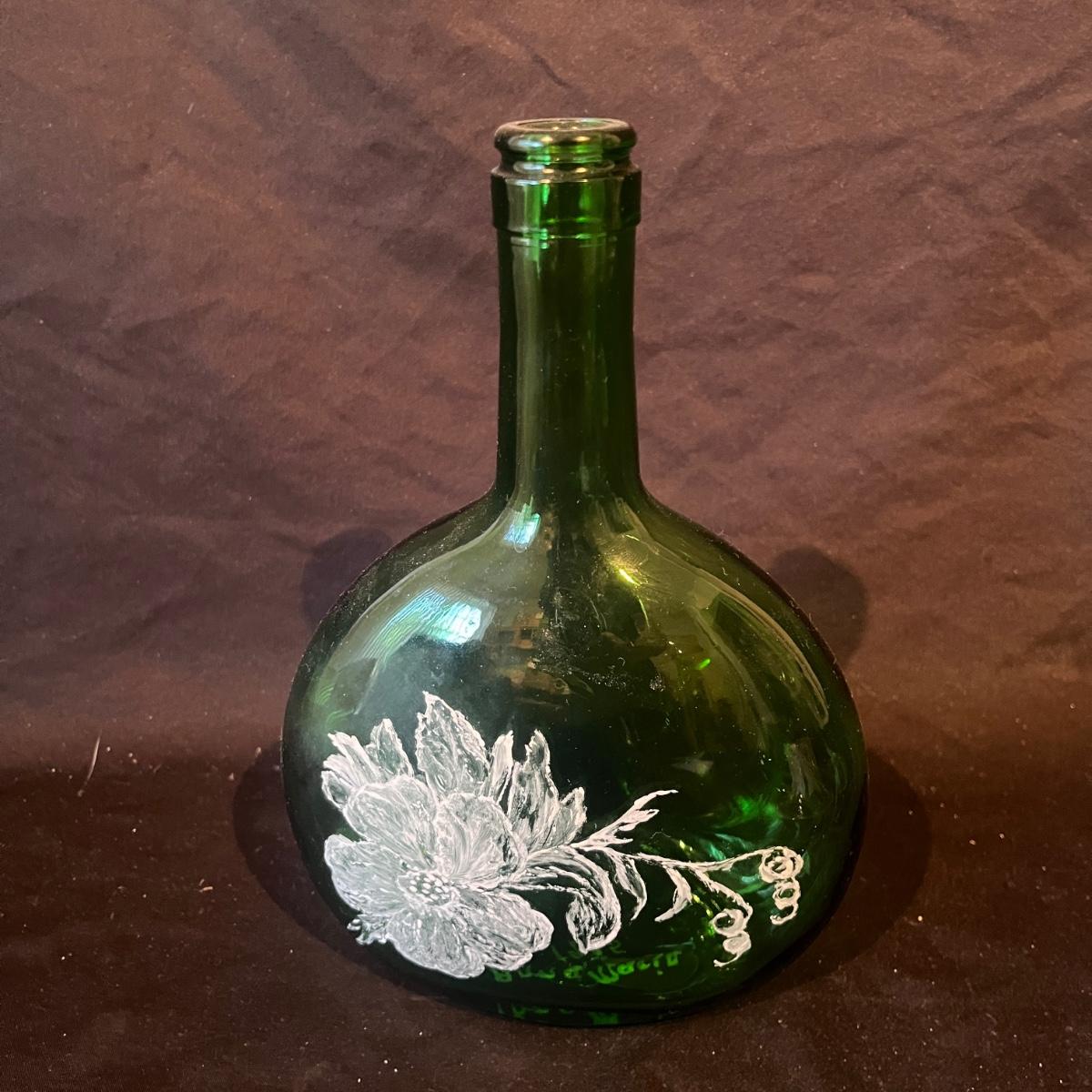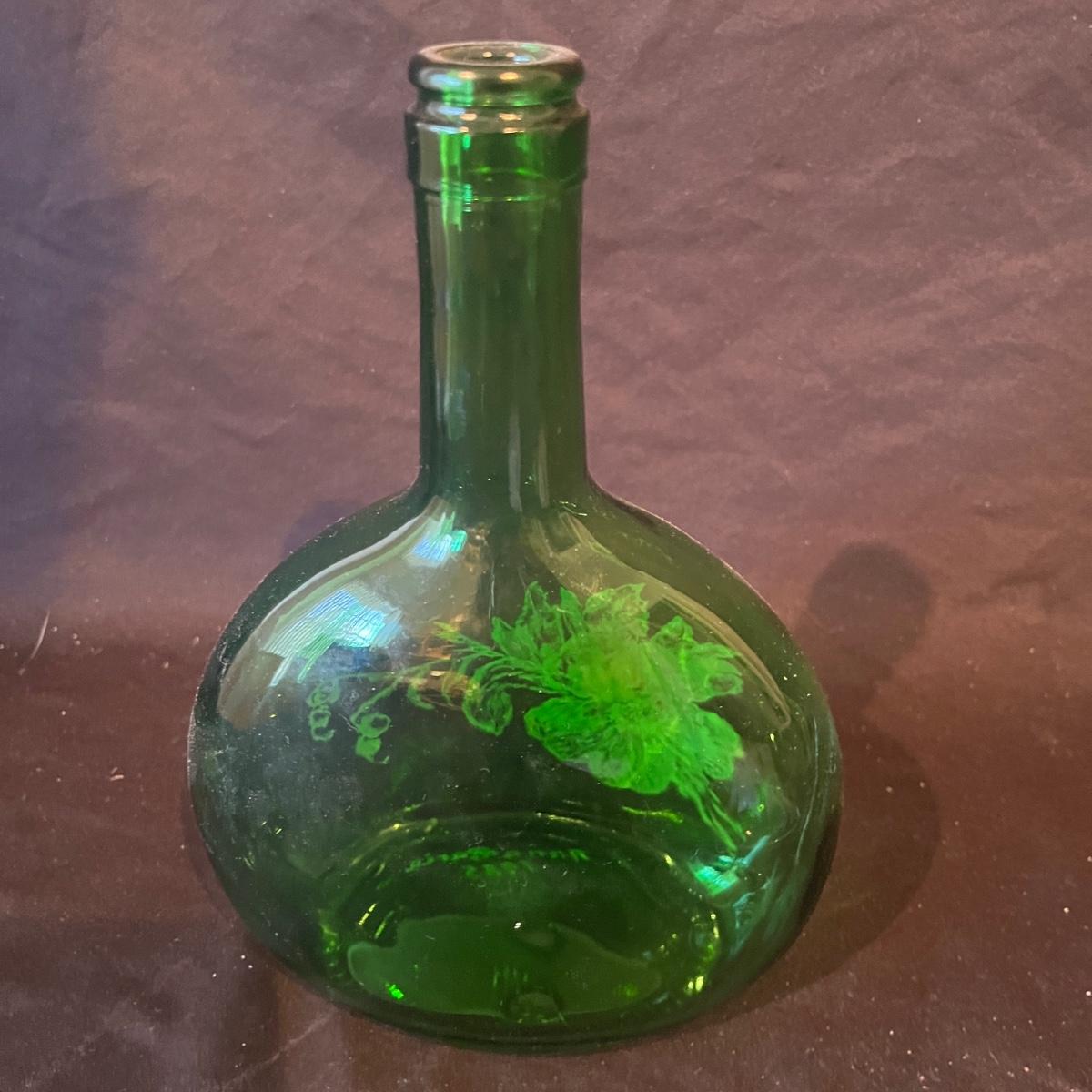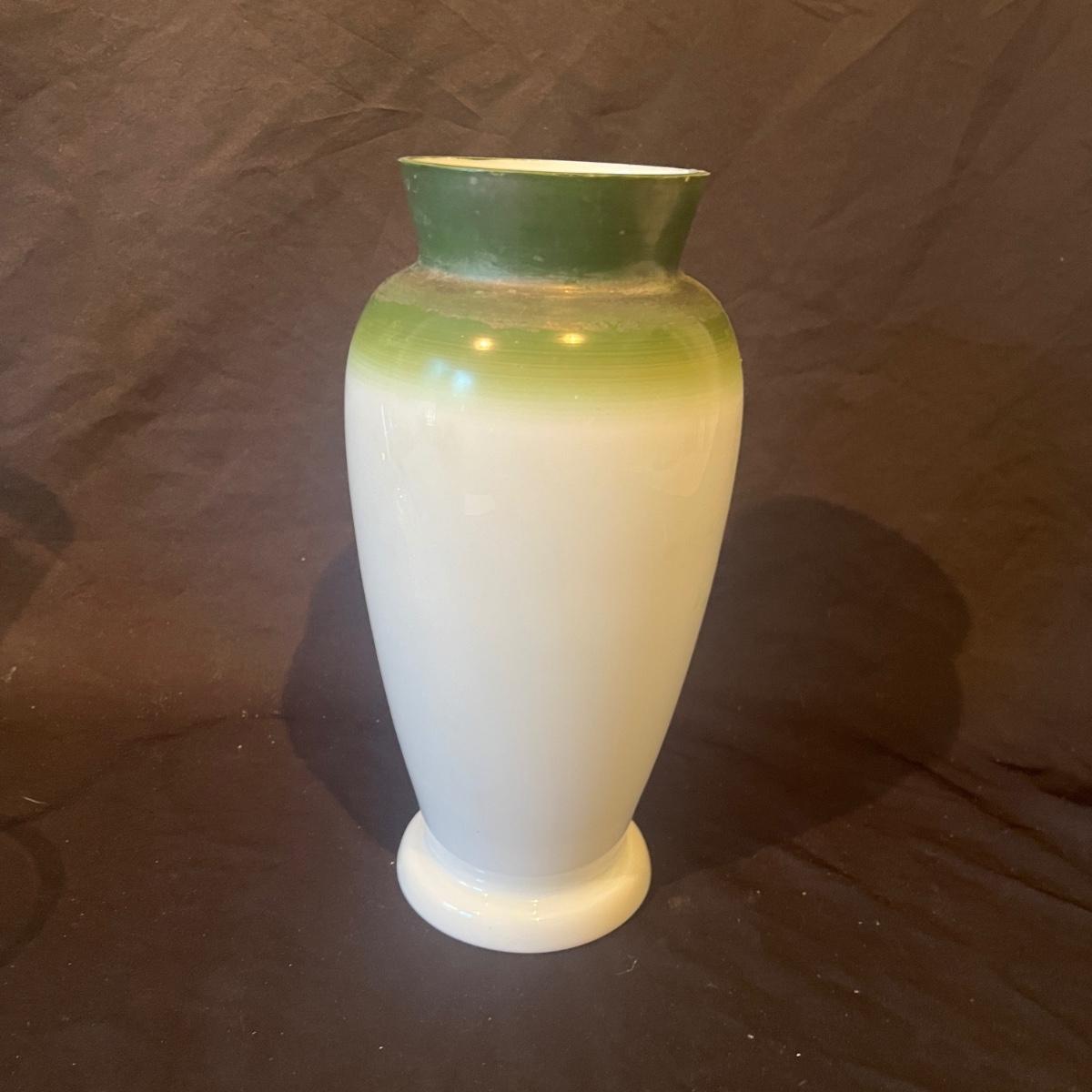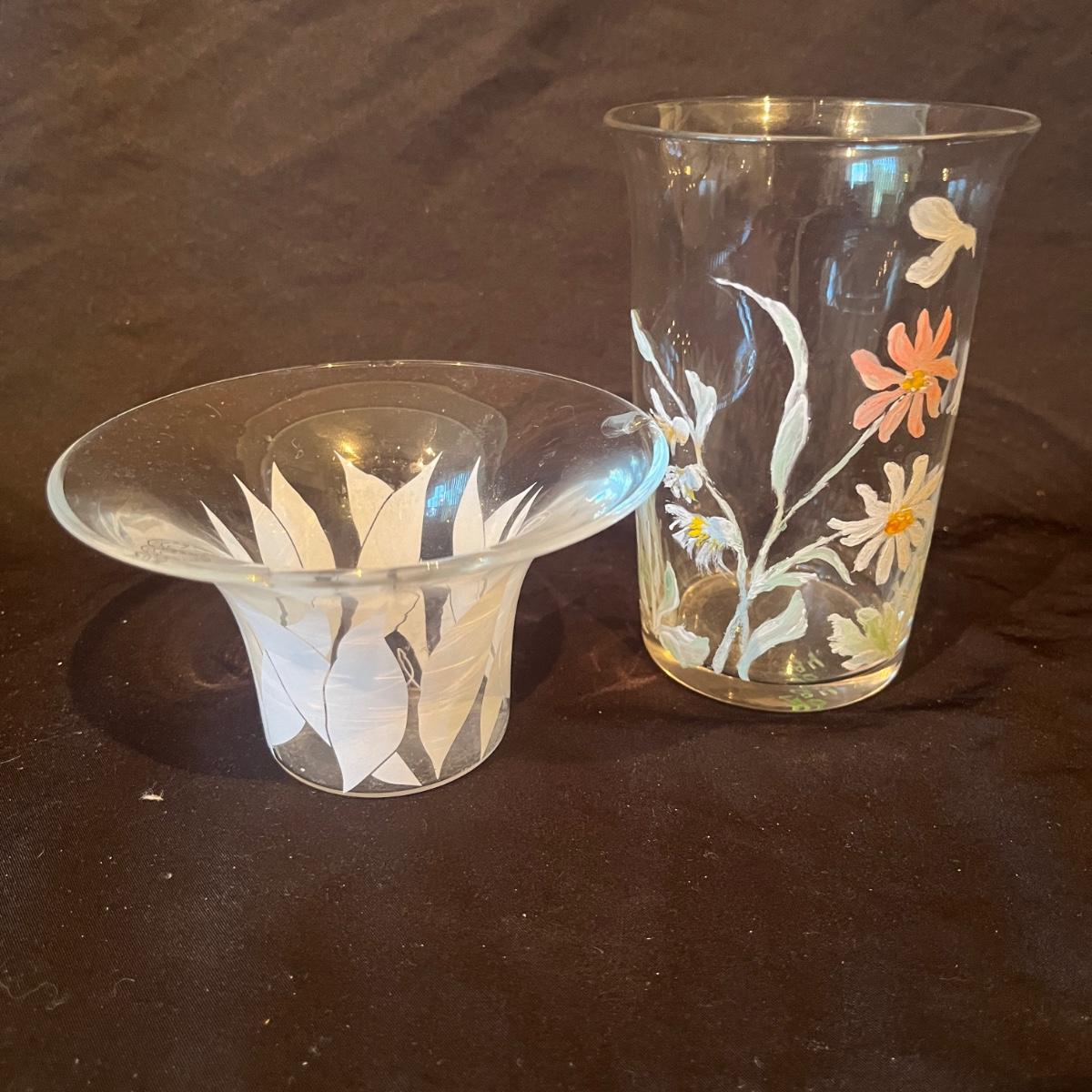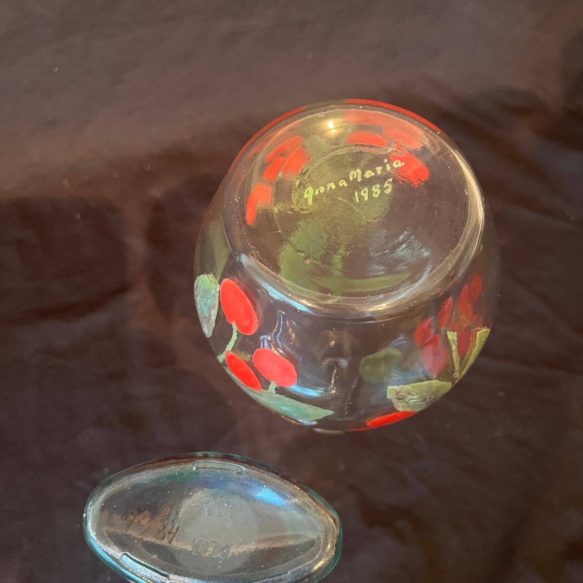 Lot contains six painted glass vases including three repurposed bottles, two glass style vases and a white glass urn shaped vase. White vase measures 5”D x 10” H. All pieces are signed except white vase.