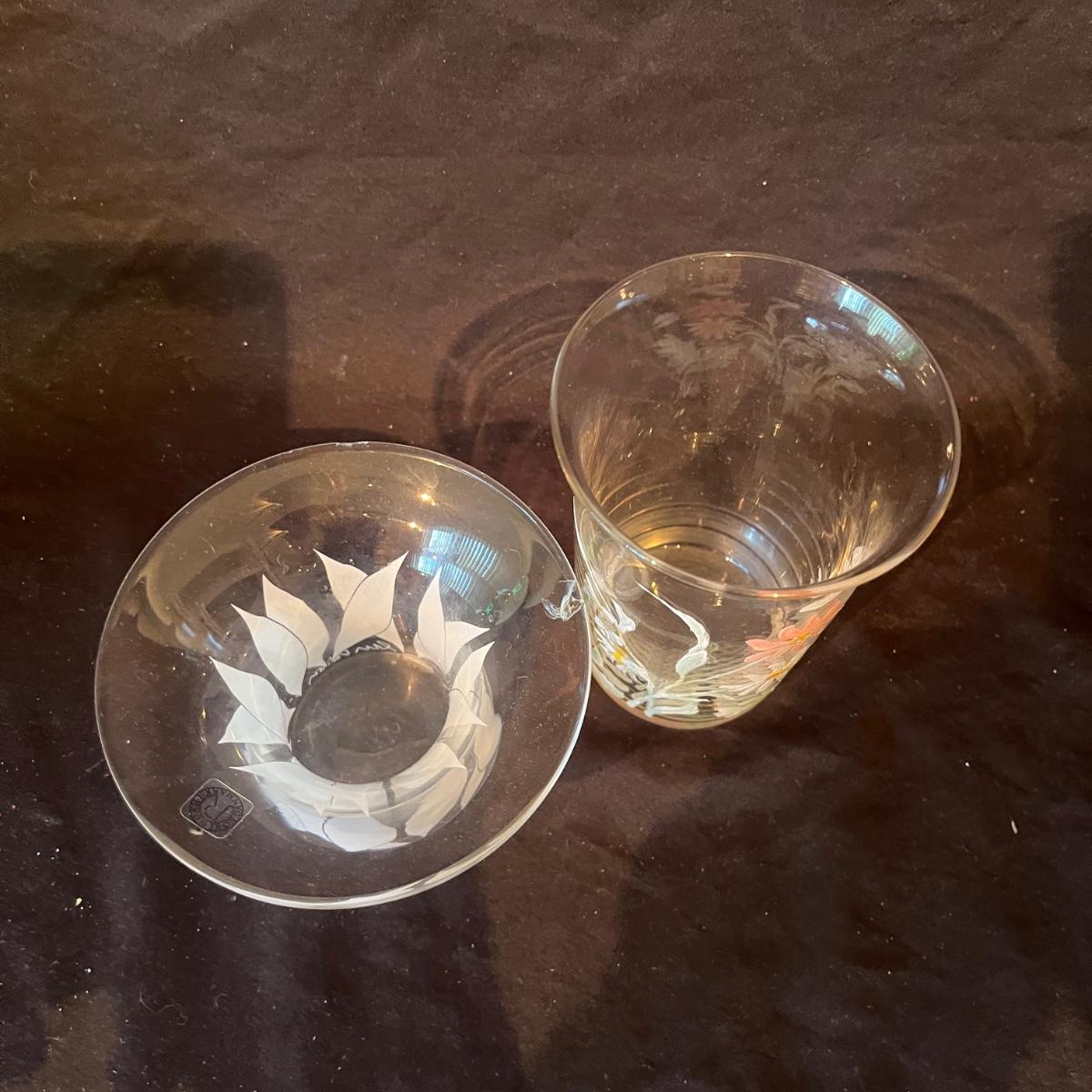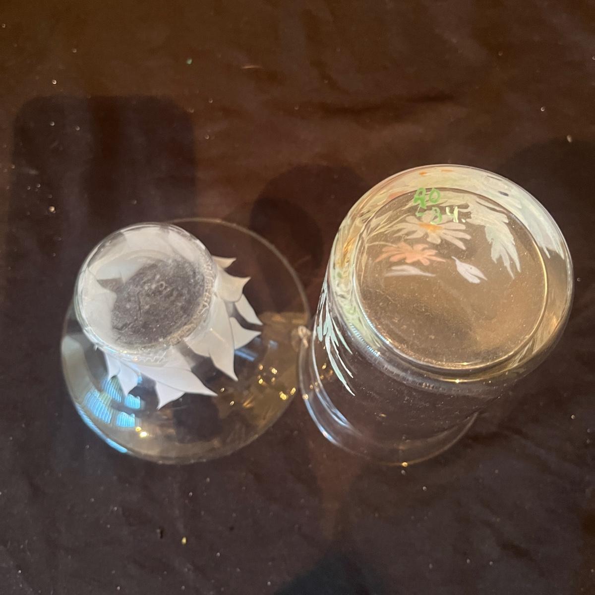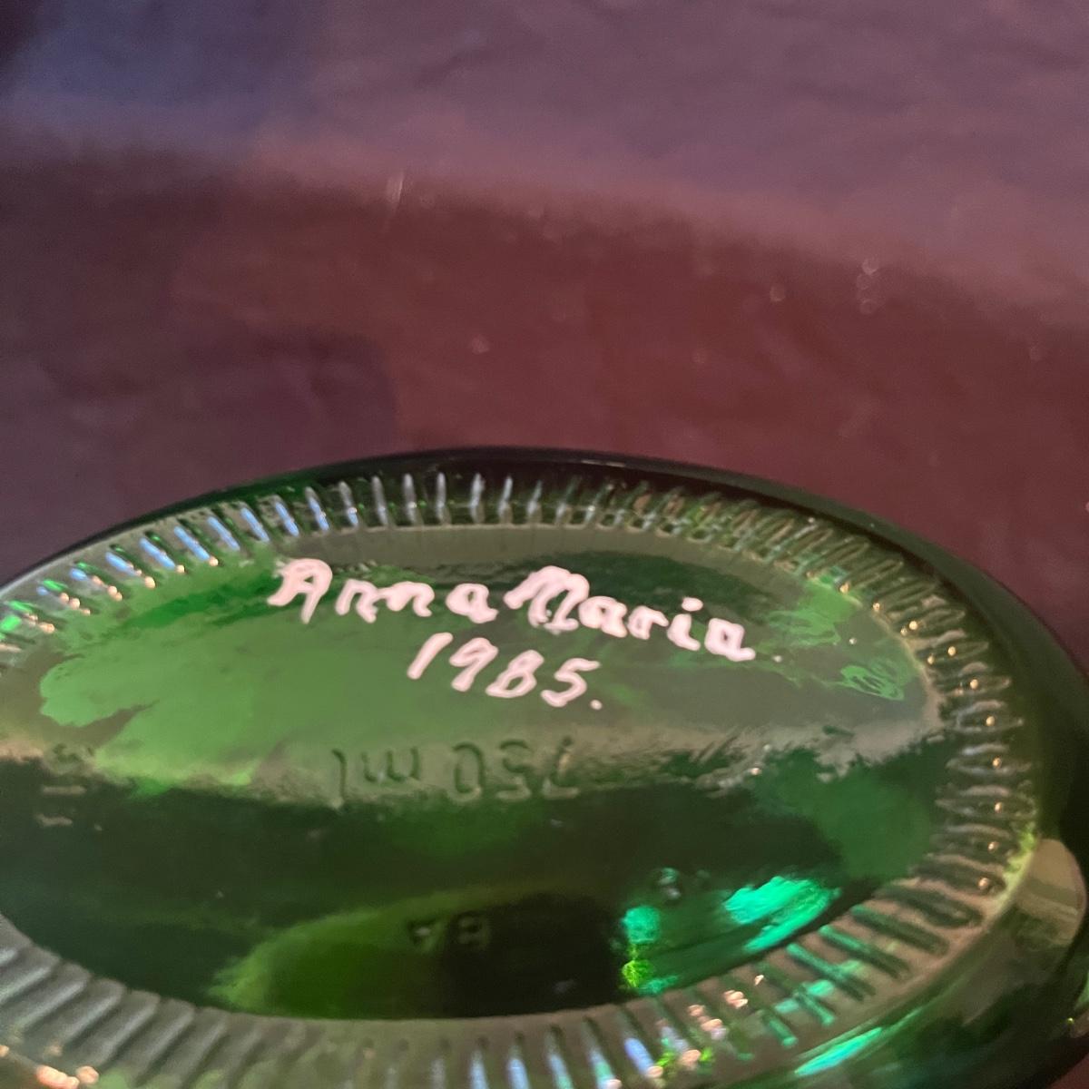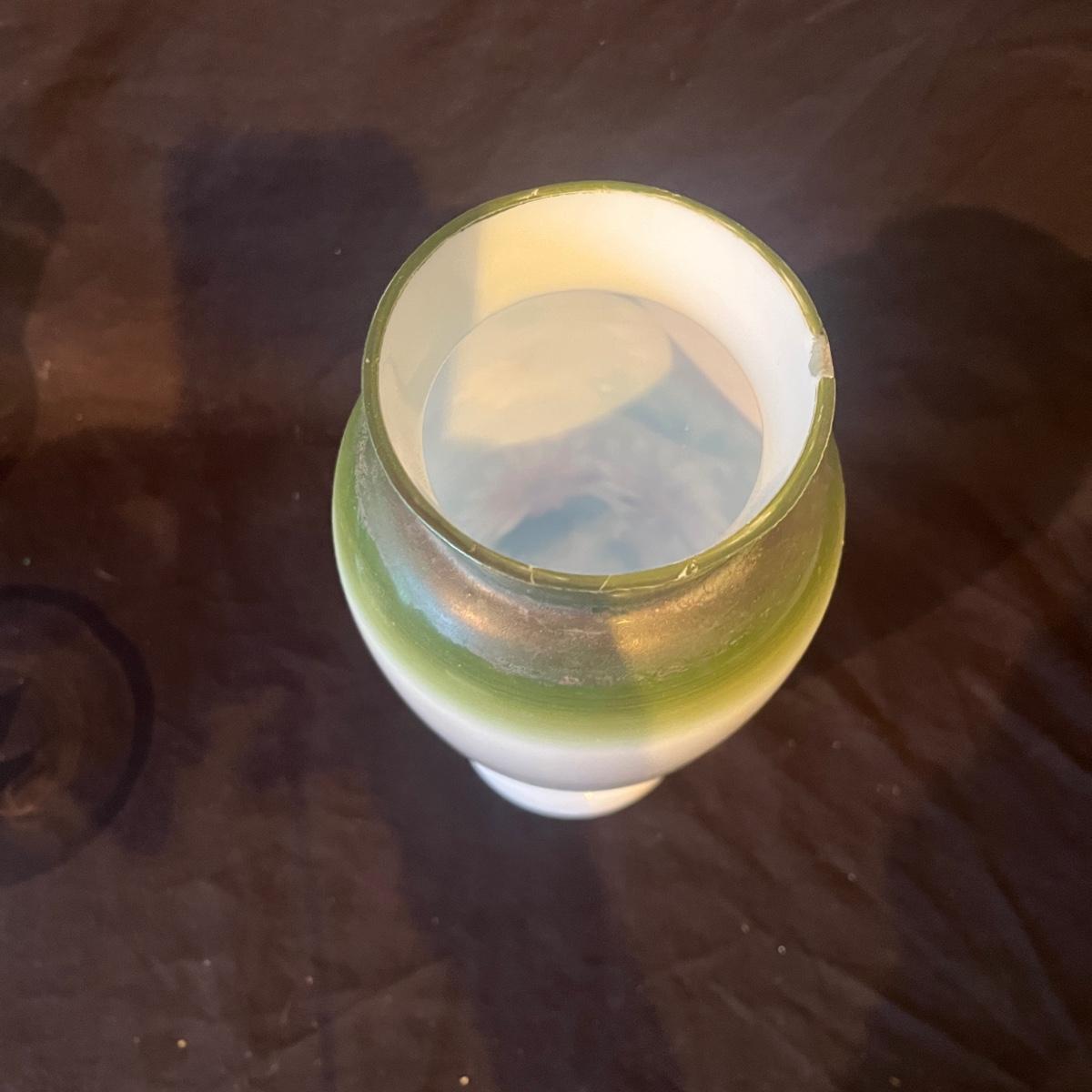 Lot contains six painted glass vases including three repurposed bottles, two glass style vases and a white glass urn shaped vase. White vase measures 5”D x 10” H. All pieces are signed except white vase.