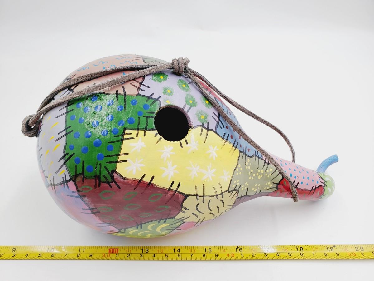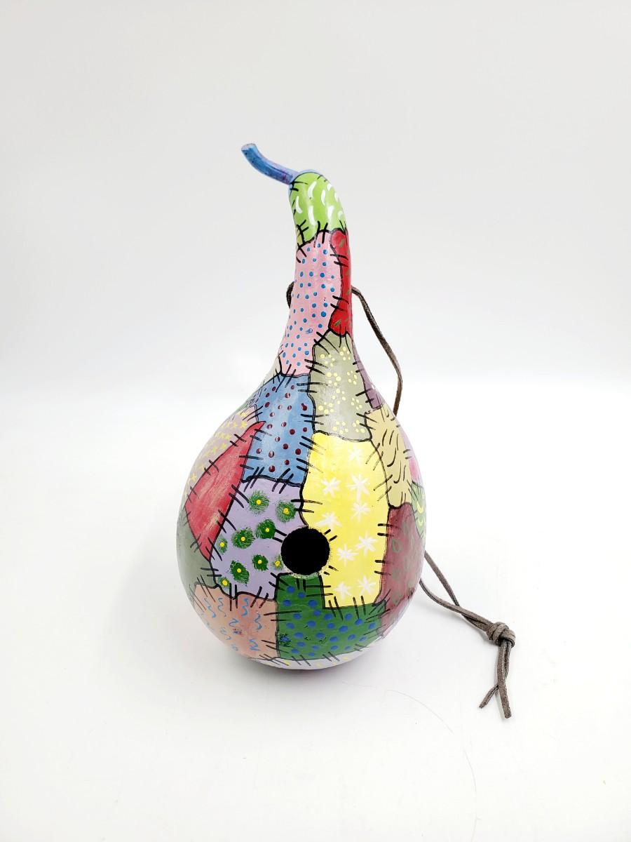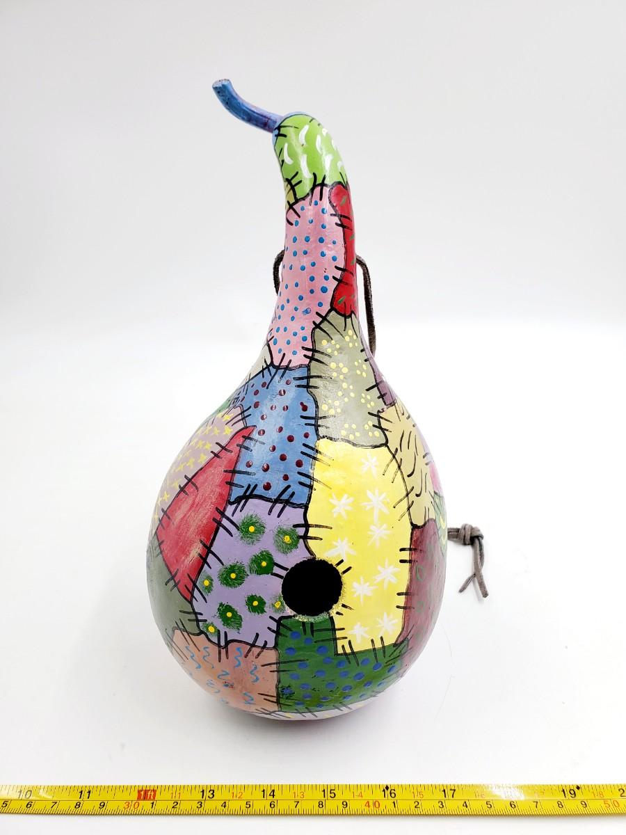 Colorfully painted, patchwork pattern gourd birdhouse with leather hanging strap. Very colorful and in good condition.