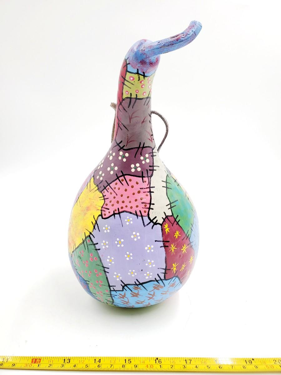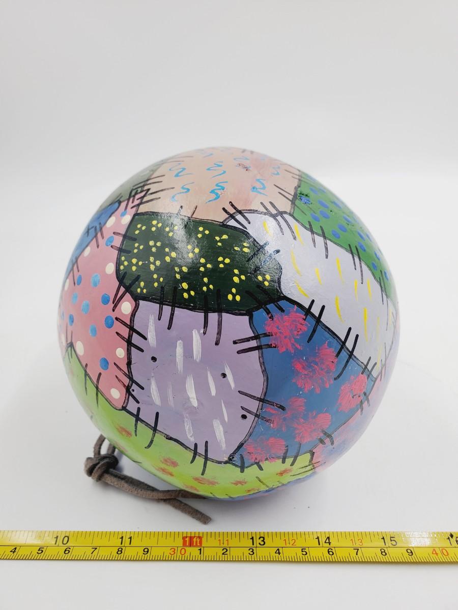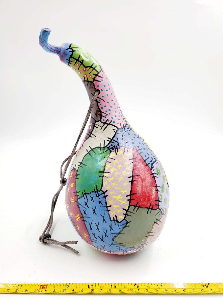 Colorfully painted, patchwork pattern gourd birdhouse with leather hanging strap. Very colorful and in good condition.