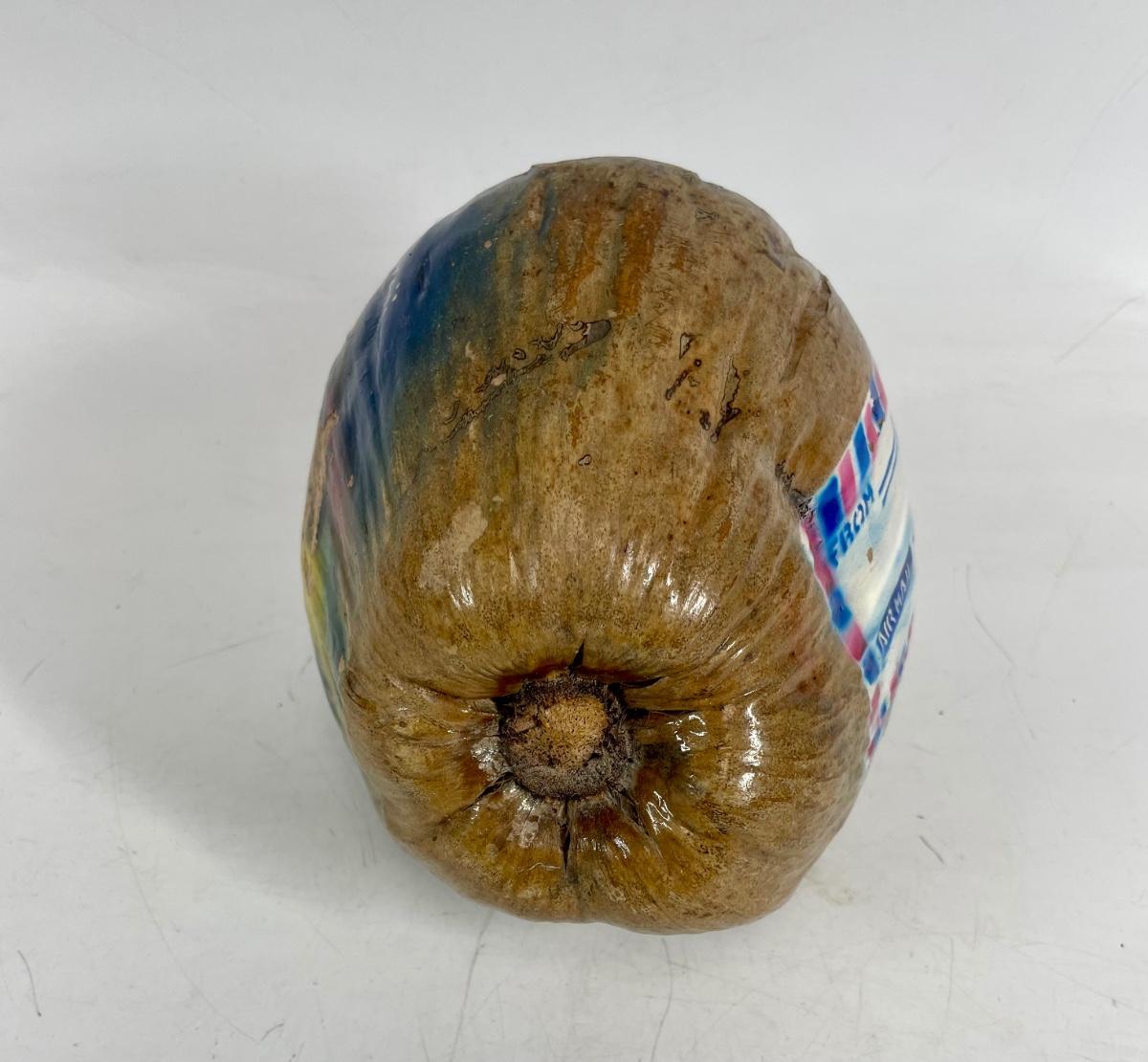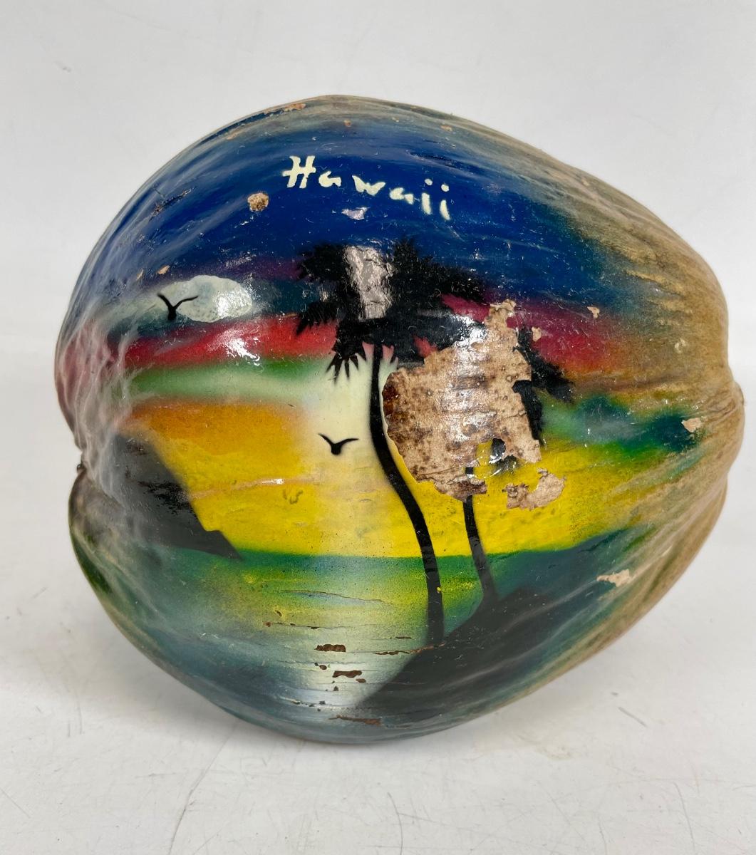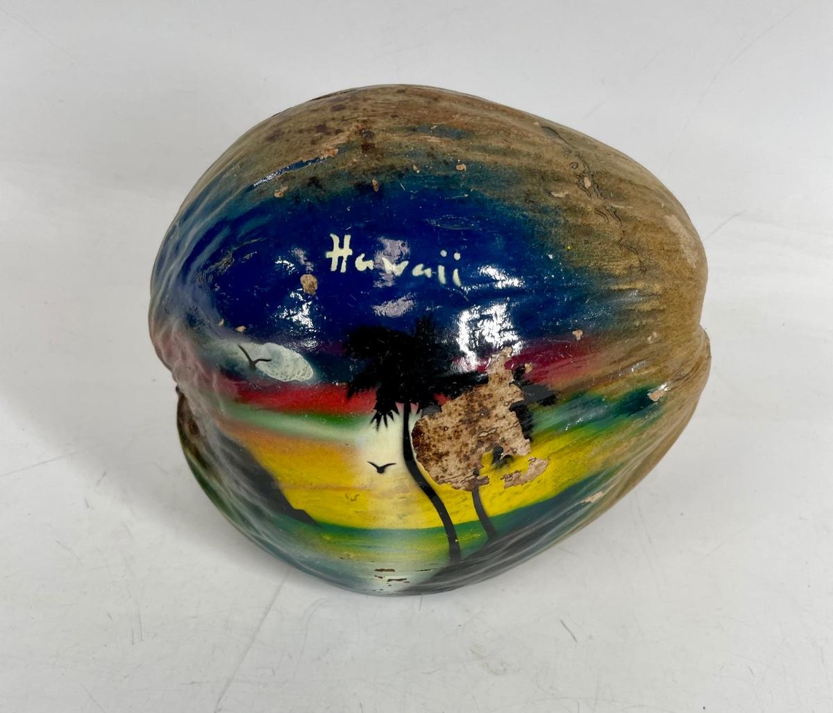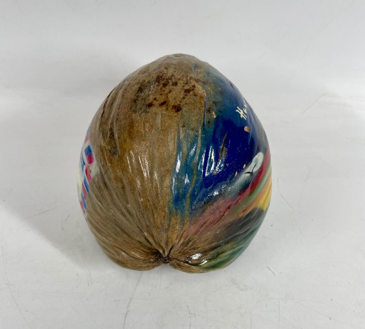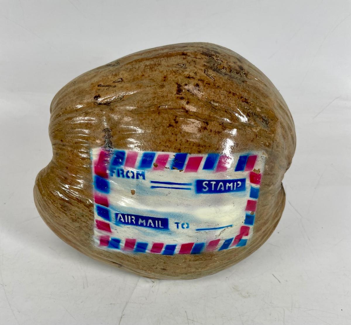 Coconut souvenir with painted island scene on one side and postage/address label on the other. Some of the painted scene has flaked off.