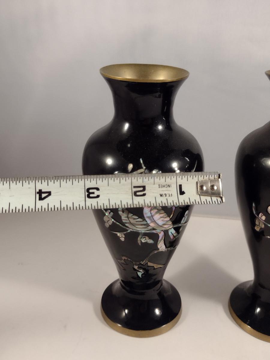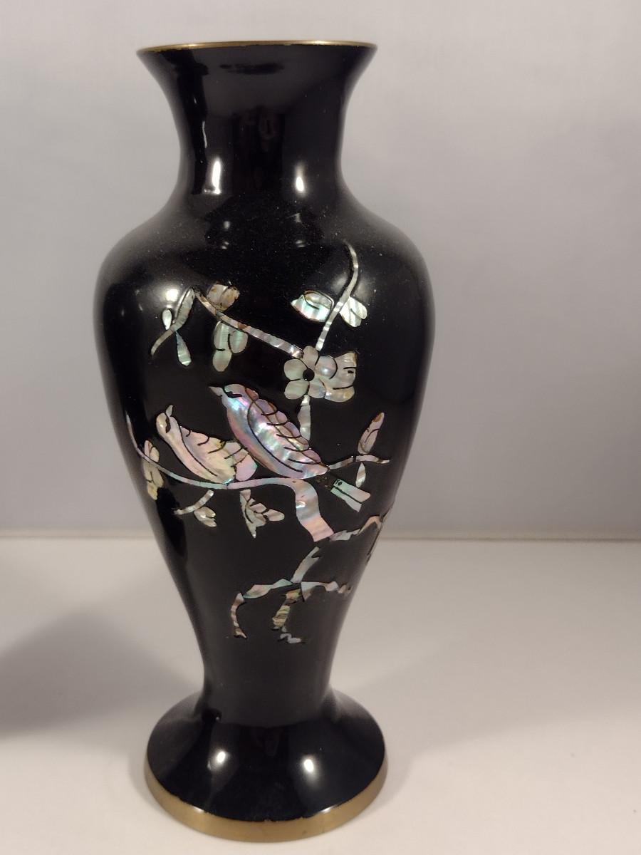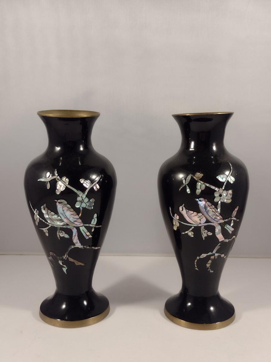 Painted Metal Vases with Mother of Pearl Inlay. Items are slightly mismatched and measure approx 7" tall.