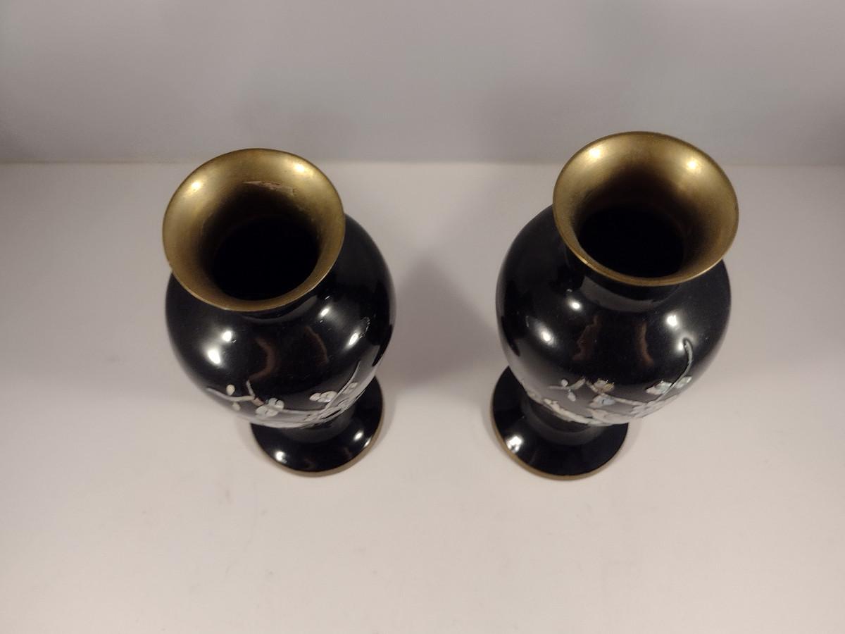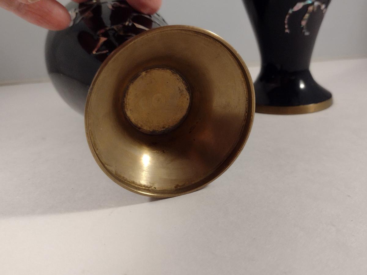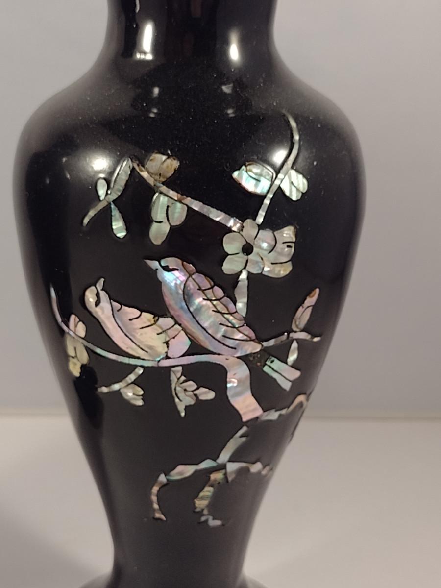Painted Metal Vases with Mother of Pearl Inlay. Items are slightly mismatched and measure approx 7" tall.