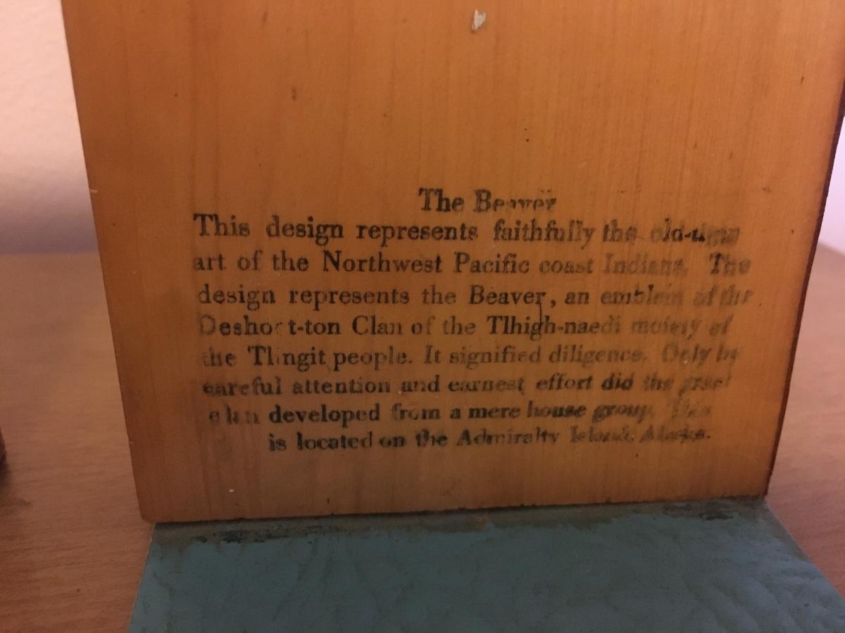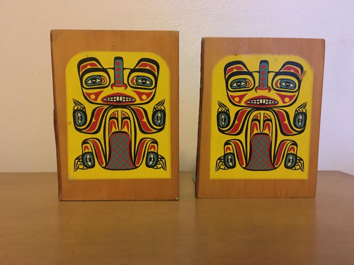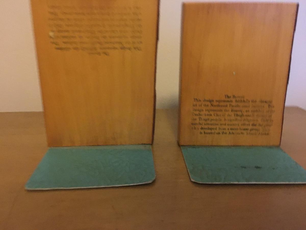 Wood bookends painted with the Beaver symbol of the Tlinlit Northwest Indians.