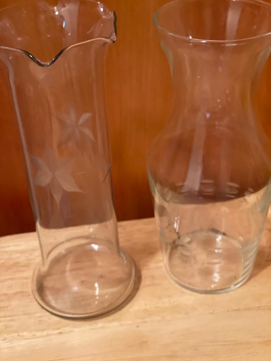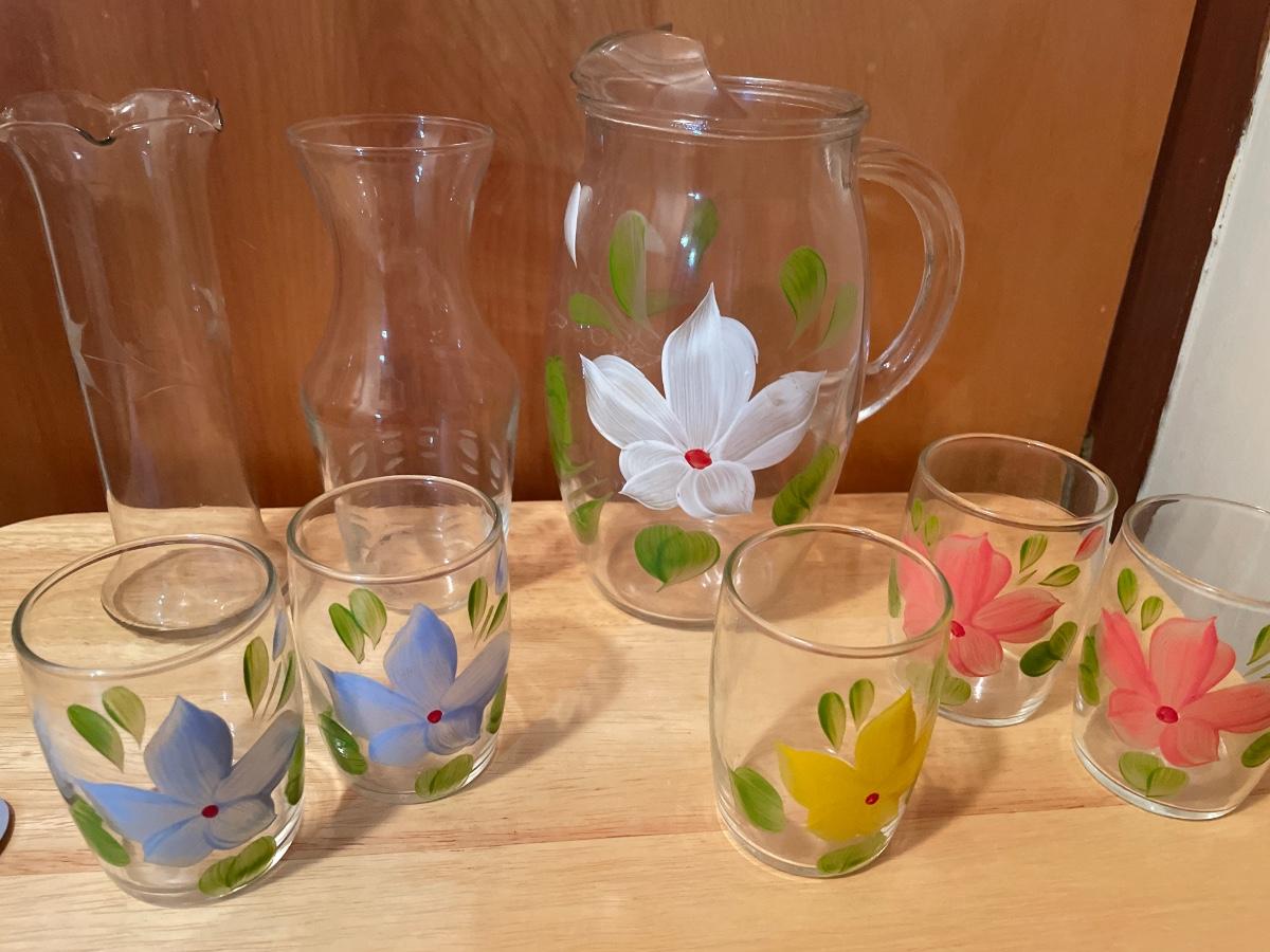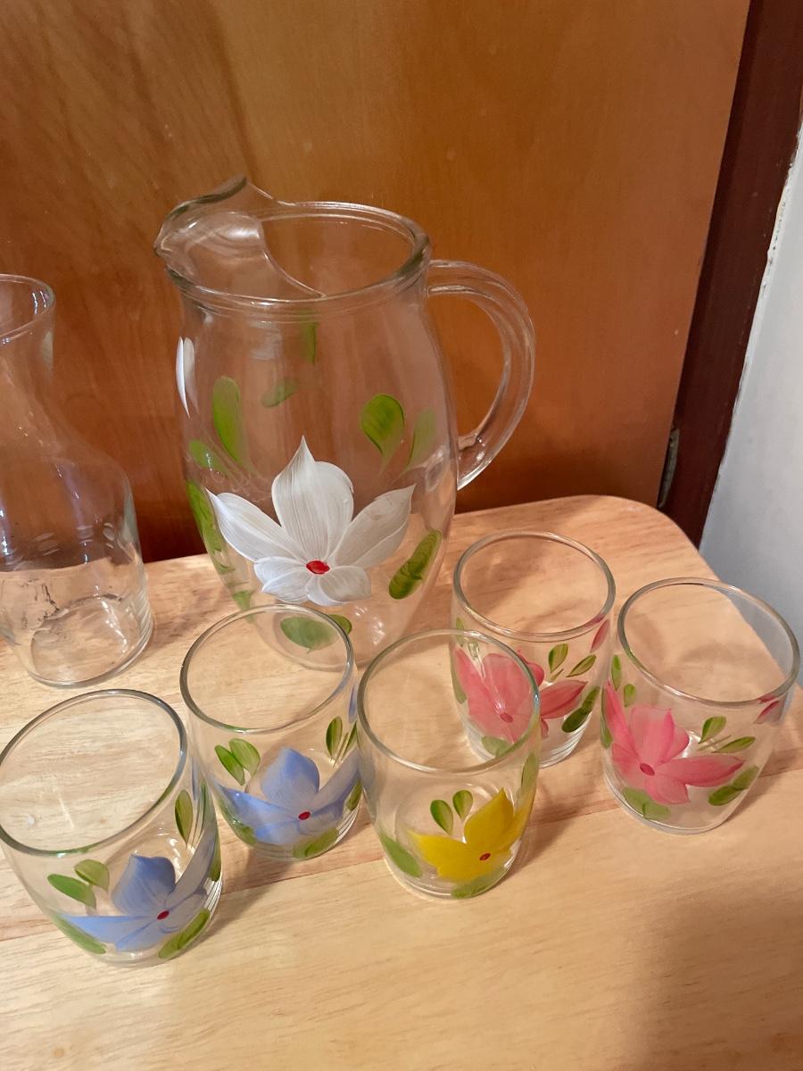 Painted pitcher and glass set with etched vases