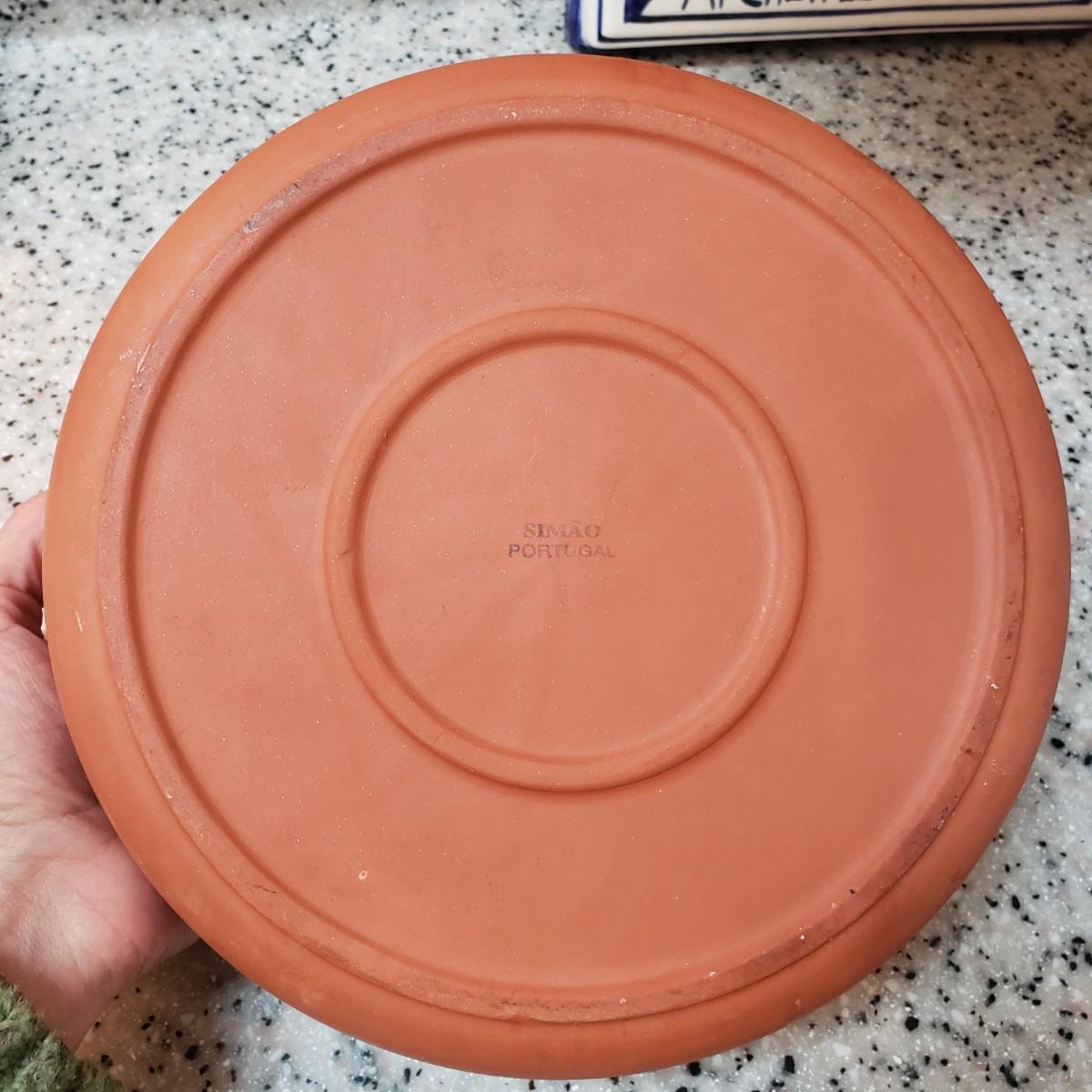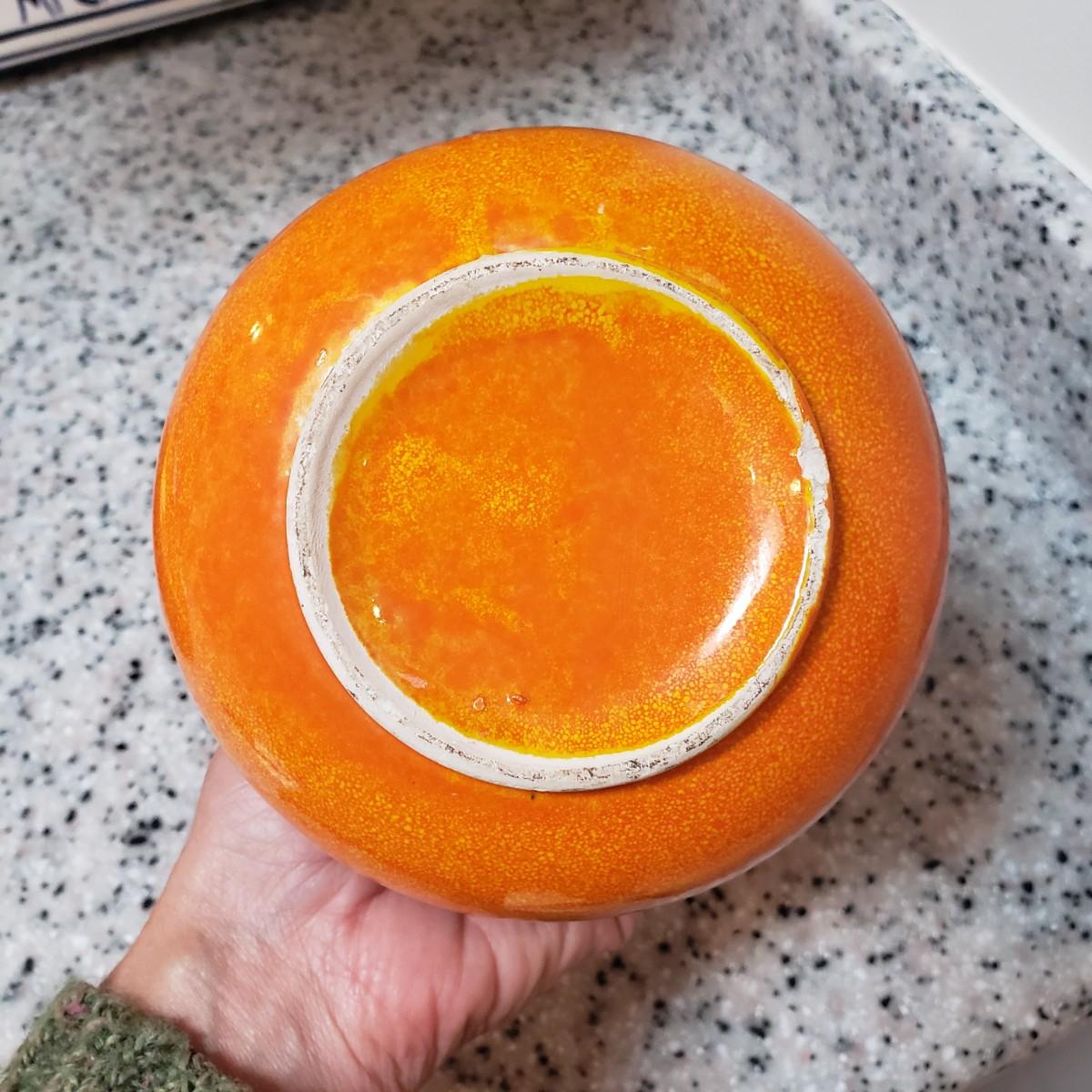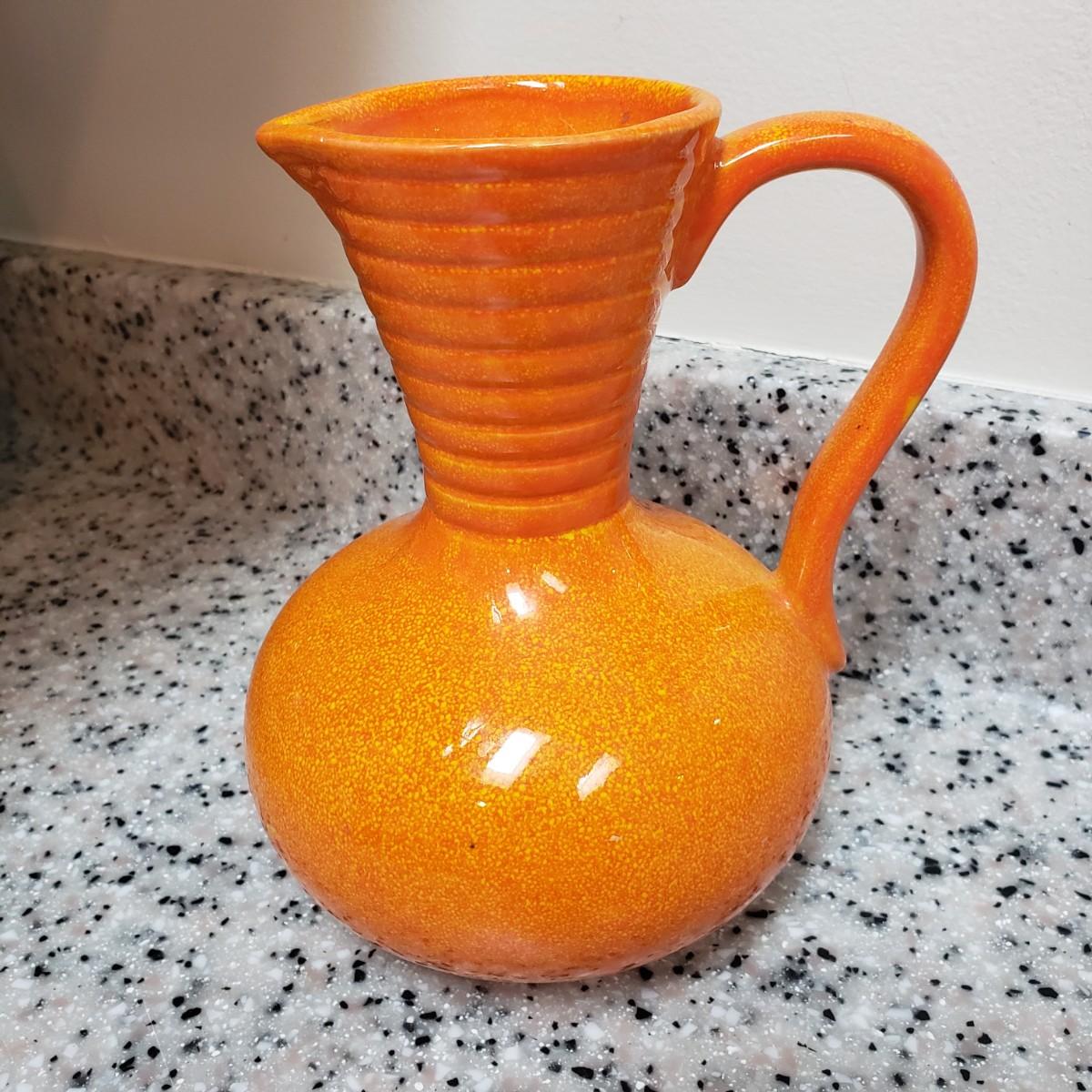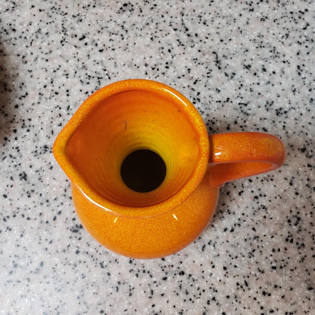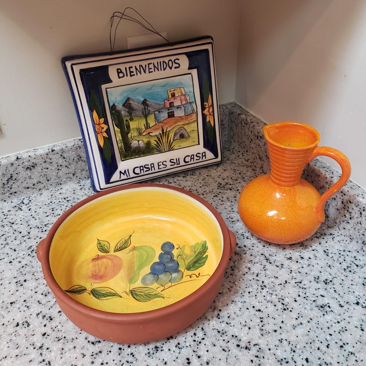 This lot contains three pieces of brightly painted pottery. The Simao baking dish measures 10"D across and was made in Portugal. There is some crazing, see picture. The Casa wall hanging has two sets of holes for mounting it on a wall. It currently has wire for hanging. The orange and yellow speckled pitcher measures 5" x 7"H.