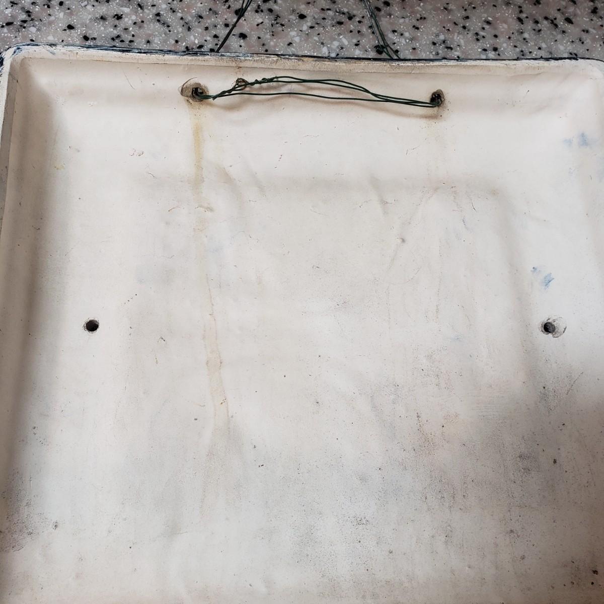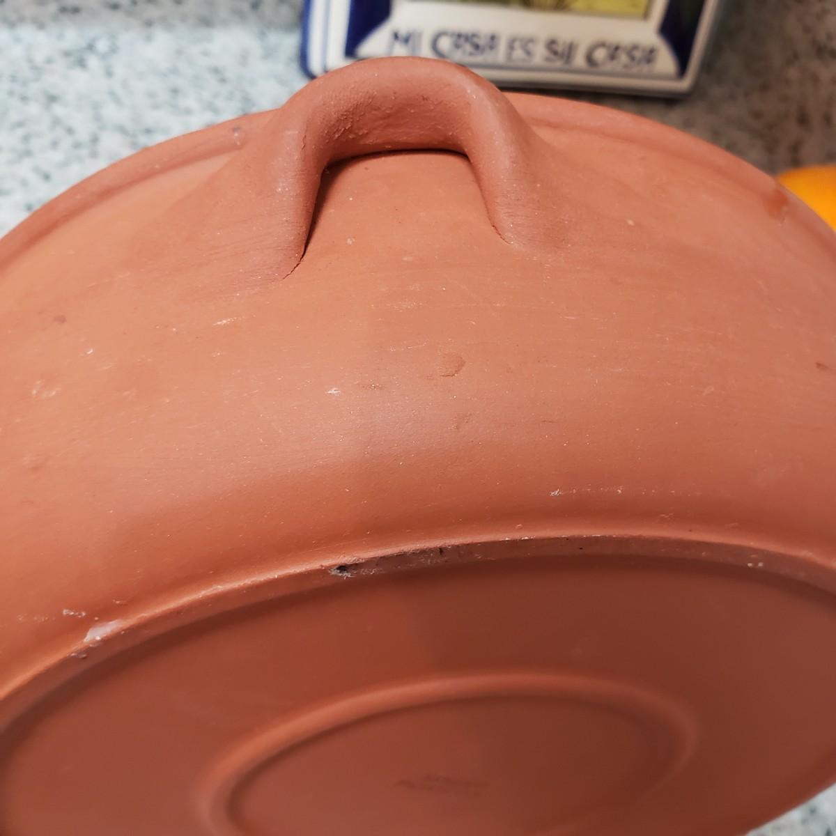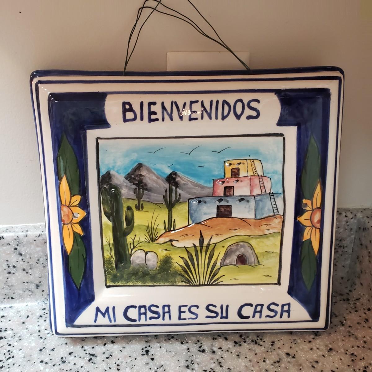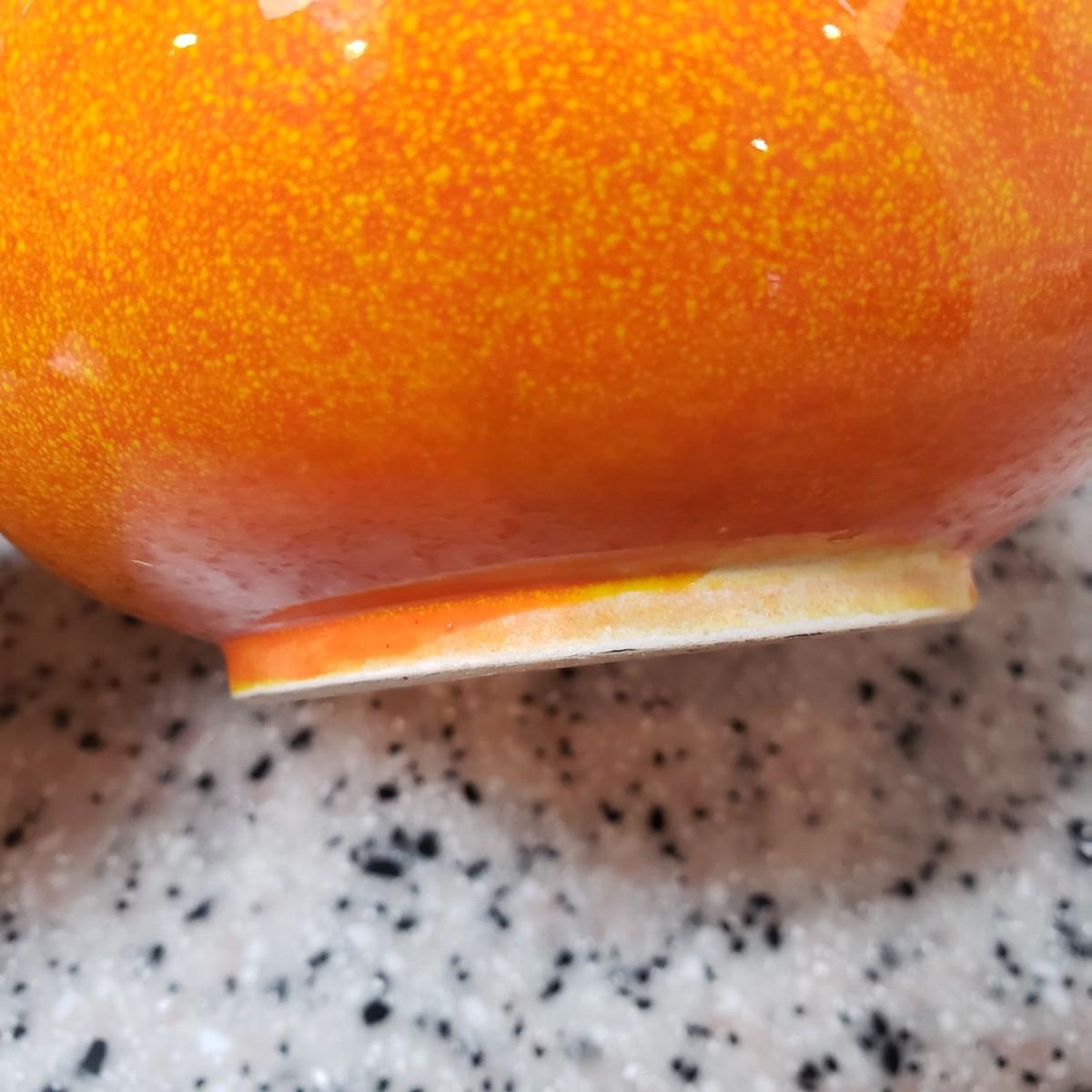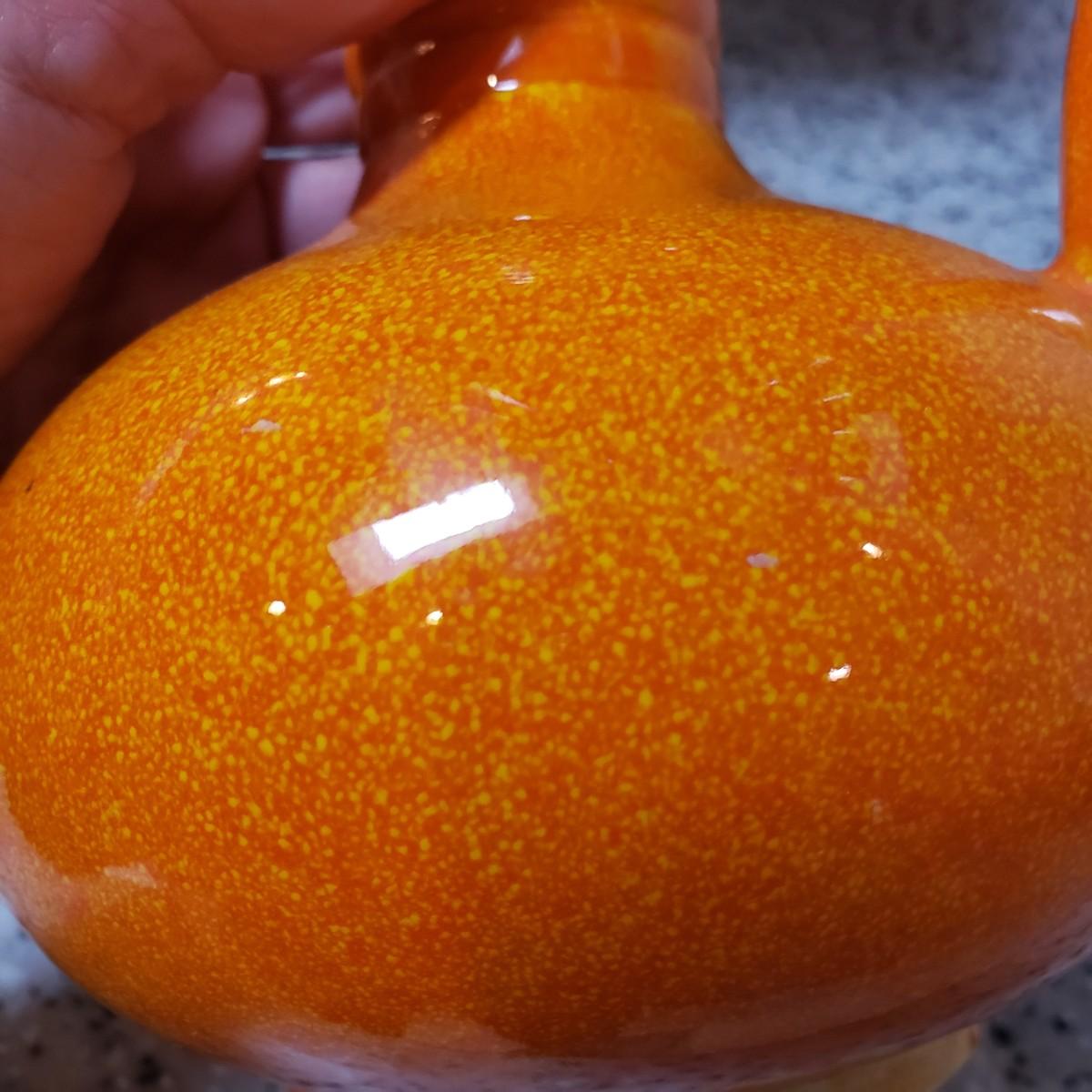 This lot contains three pieces of brightly painted pottery. The Simao baking dish measures 10"D across and was made in Portugal. There is some crazing, see picture. The Casa wall hanging has two sets of holes for mounting it on a wall. It currently has wire for hanging. The orange and yellow speckled pitcher measures 5" x 7"H.