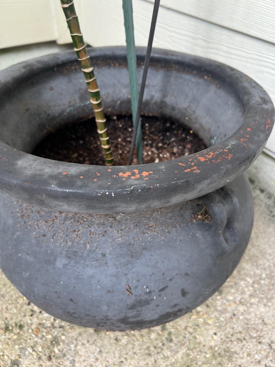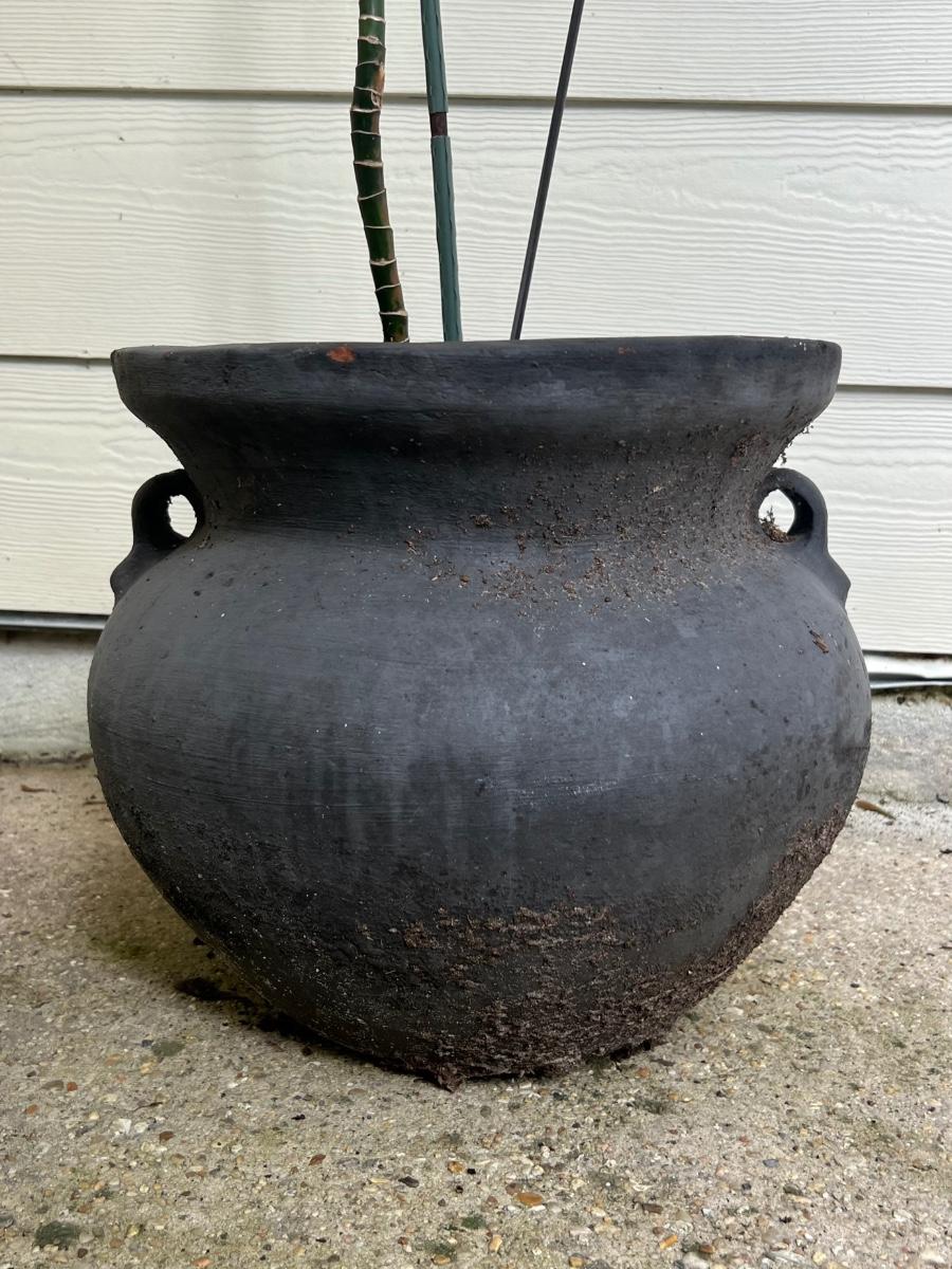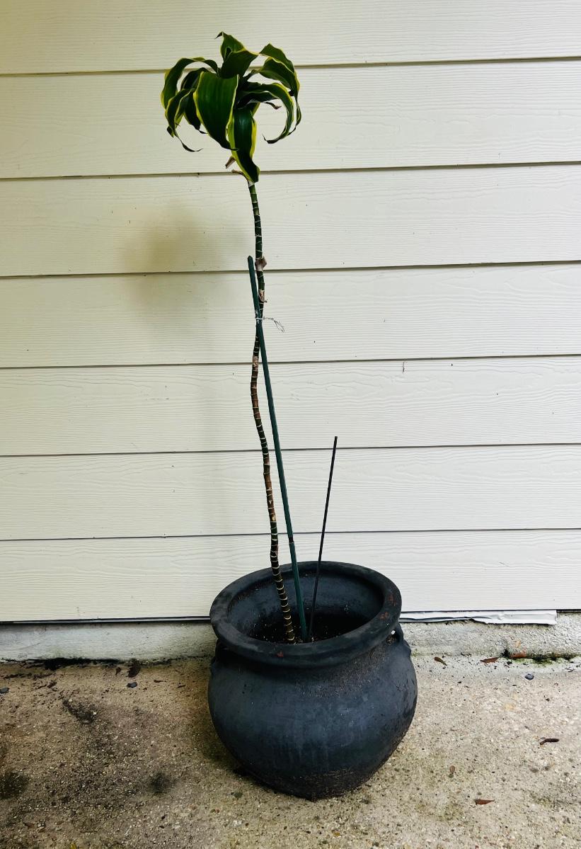 Terra-cotta planter that is painted black with potted plant. Planter measures. 13 inches tall 14 inches wide. Combine height with plant at approximately 49 inches tall.