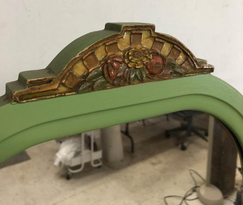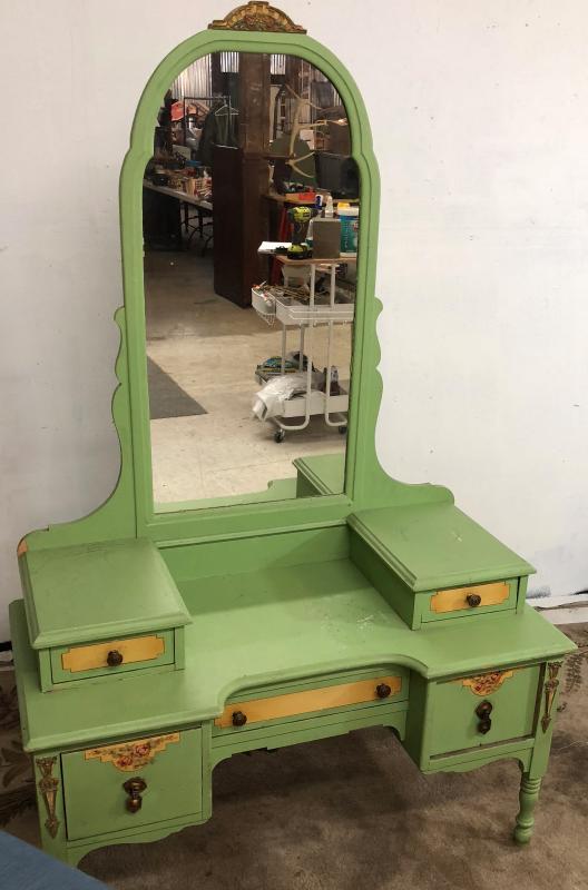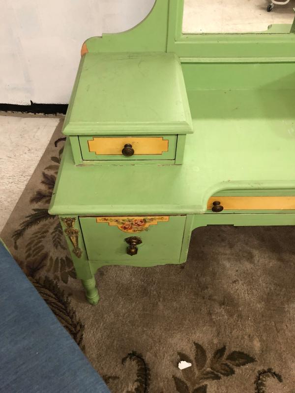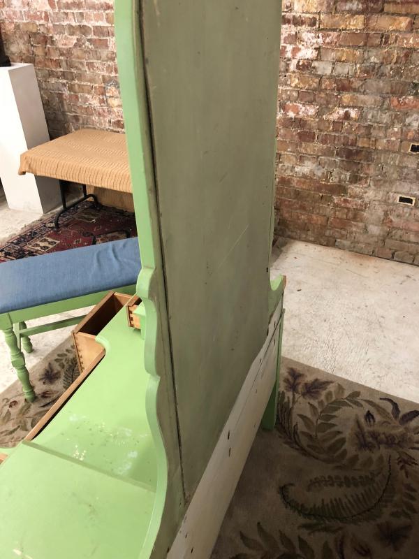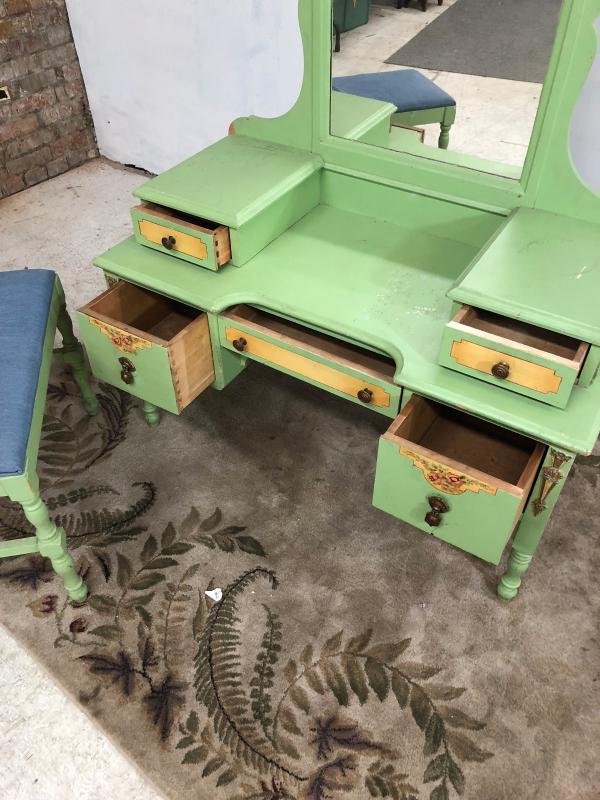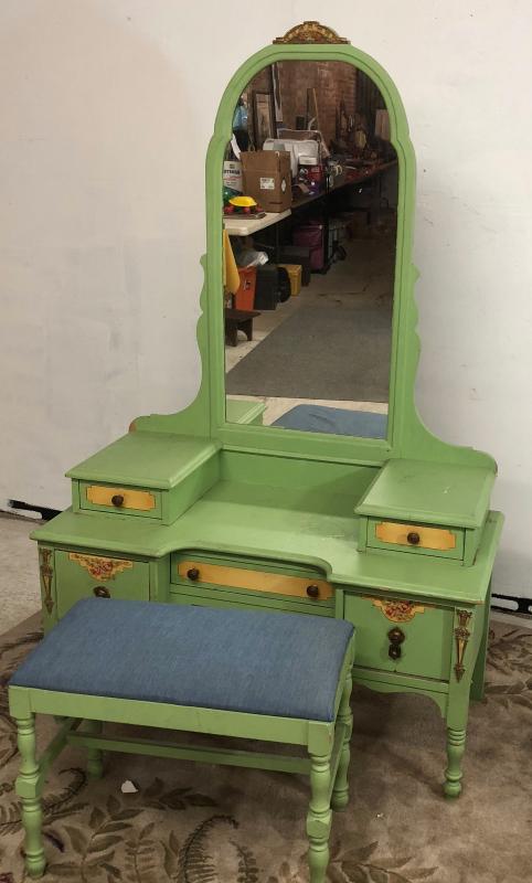 Painted vanity with stool and mirror. C.1930 cottage furniture. Measures 41" x 20", 68" tall to top of mirror.