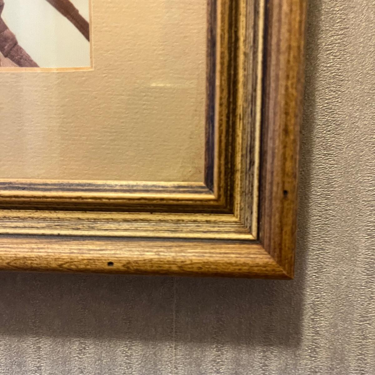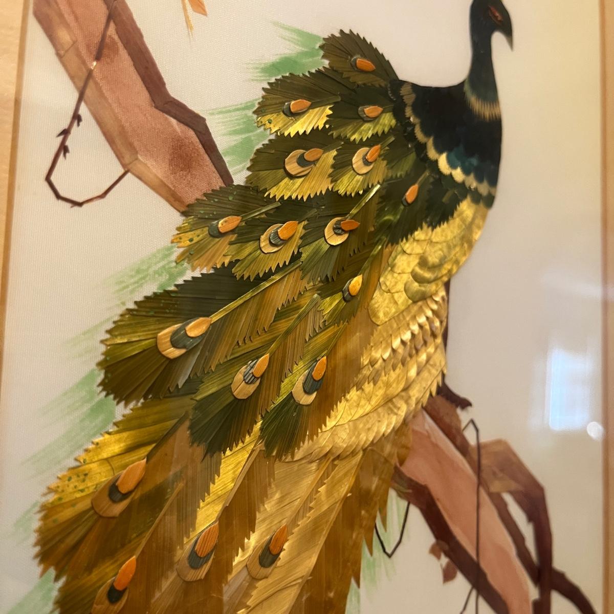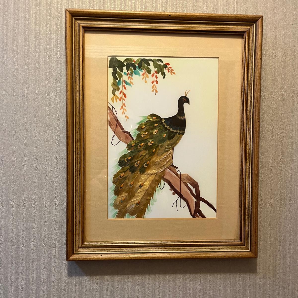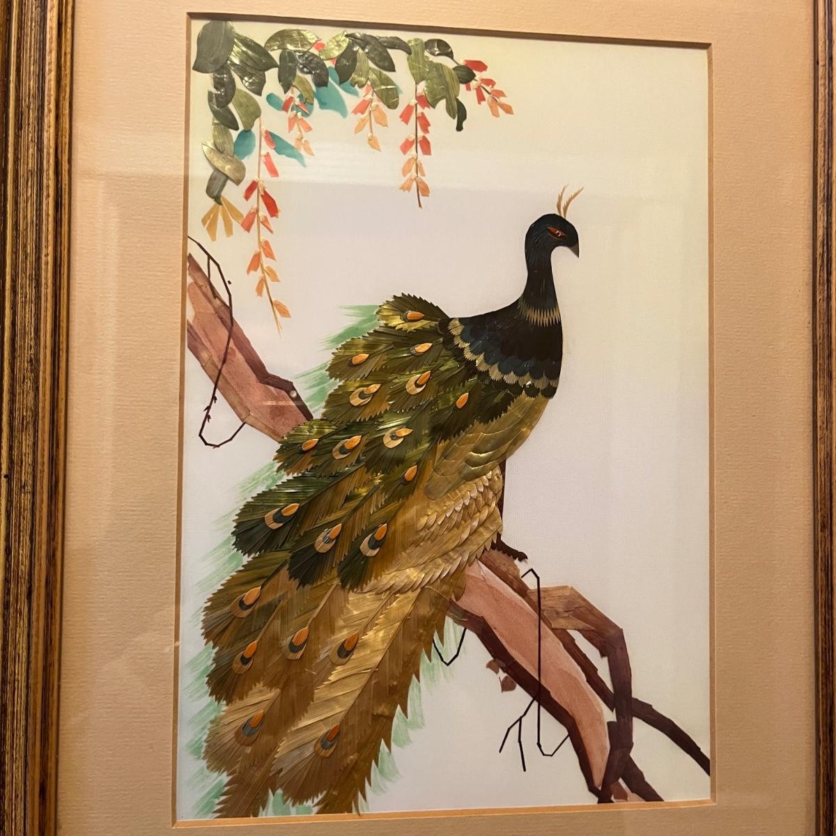 Lot includes a wooden framed, matted and under glass piece of what appears to be painted wheat stalk art of a peacock on a branch. Frame measures 11” x 14”H.
