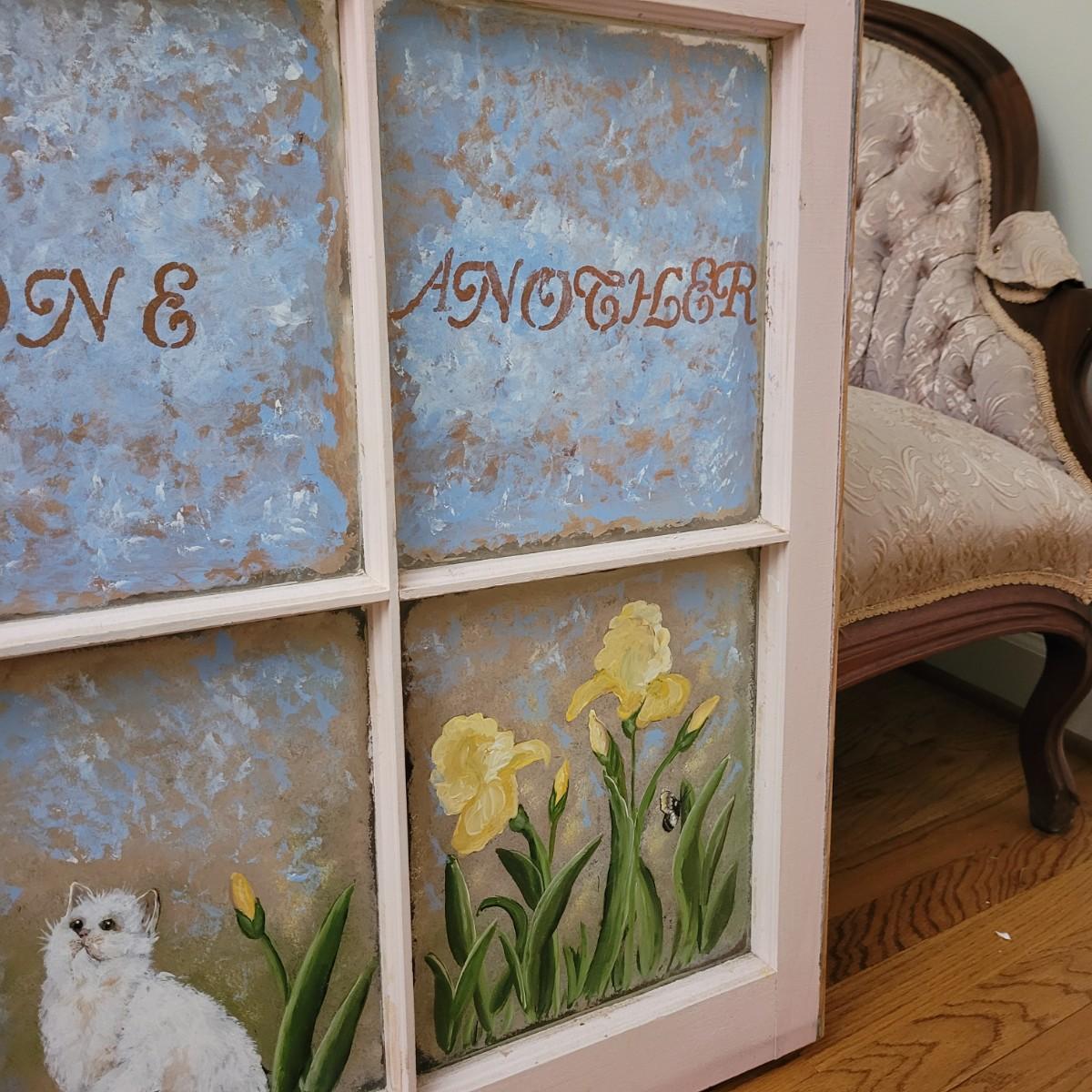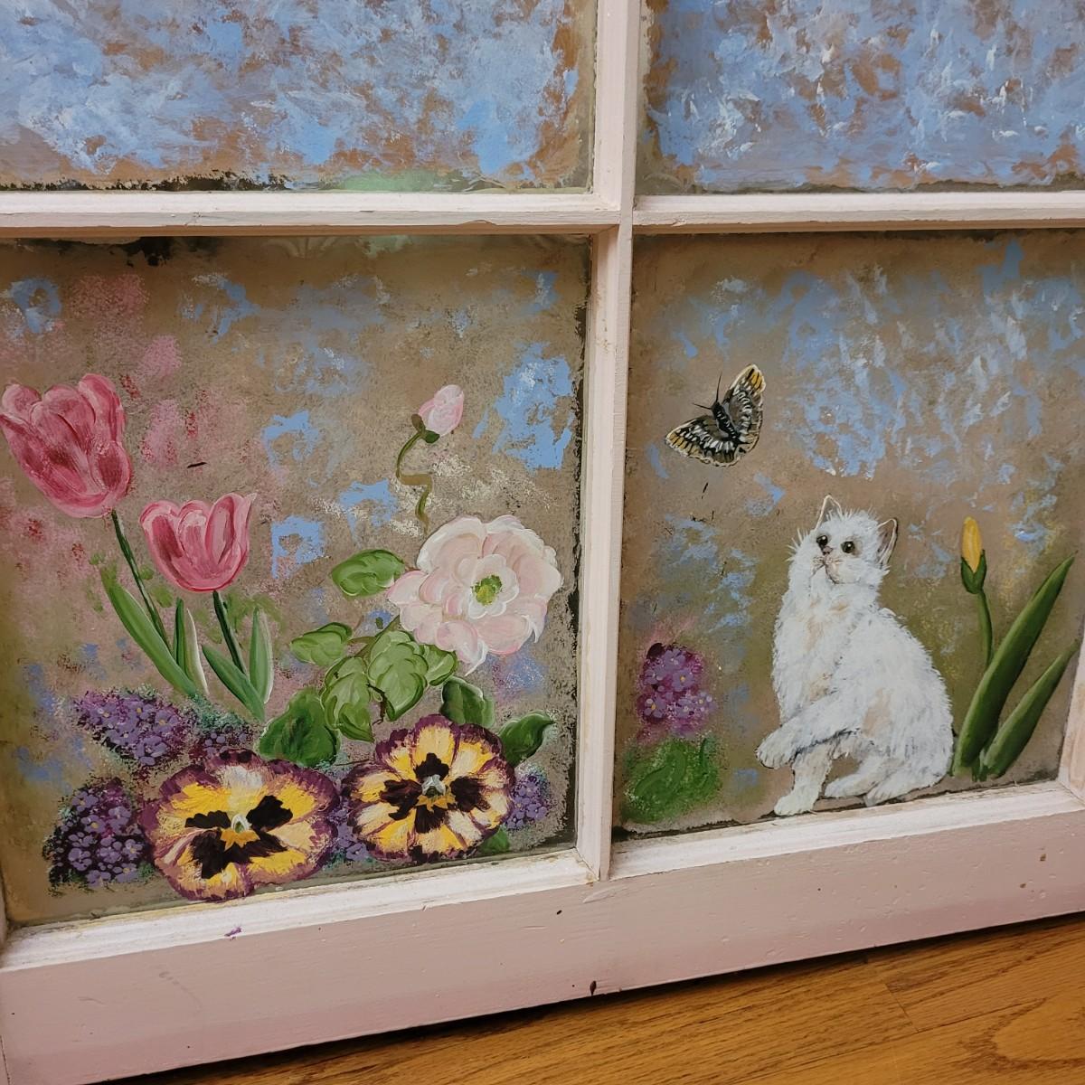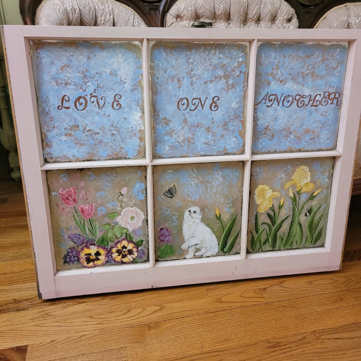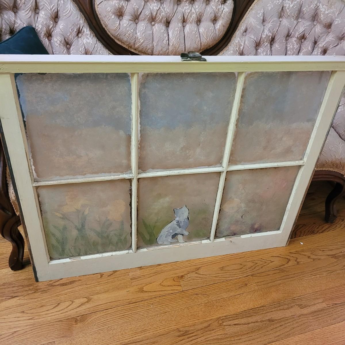 Hand painted vintage window frame with a sweet scene of flowers and a kitten. Measures approximately 36" x 28". Shipping available. Shipping can be costly. We suggest contacting our preferred local shipping provider, Postage Express, with dimensions and getting an estimate before bidding: (828) 670-5501 or postageexpress@yahoo.com.