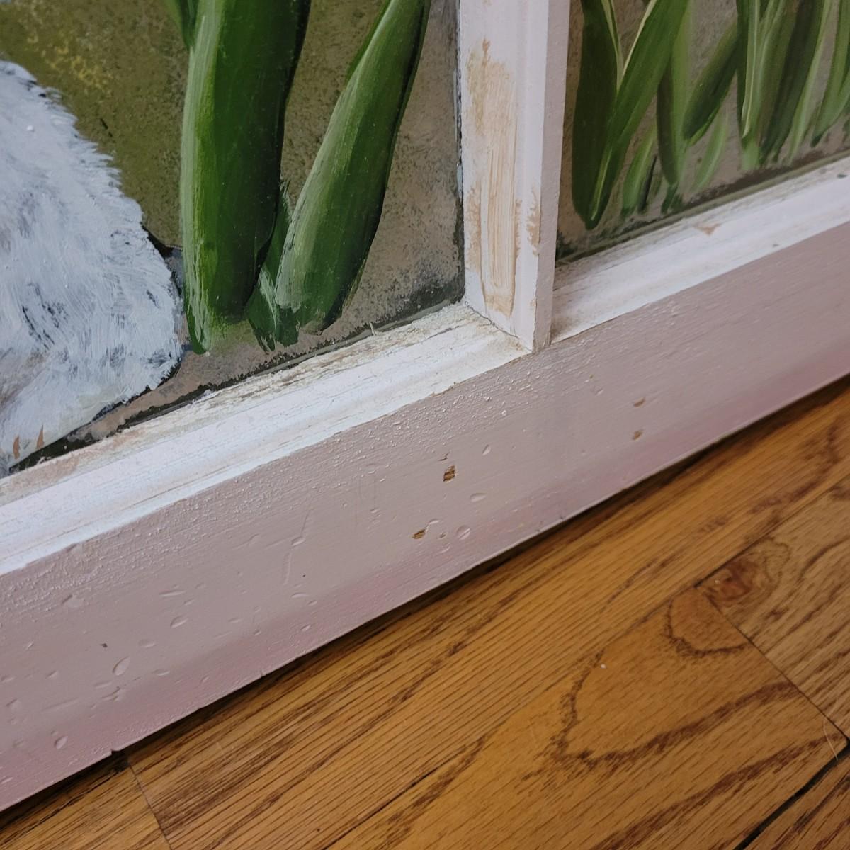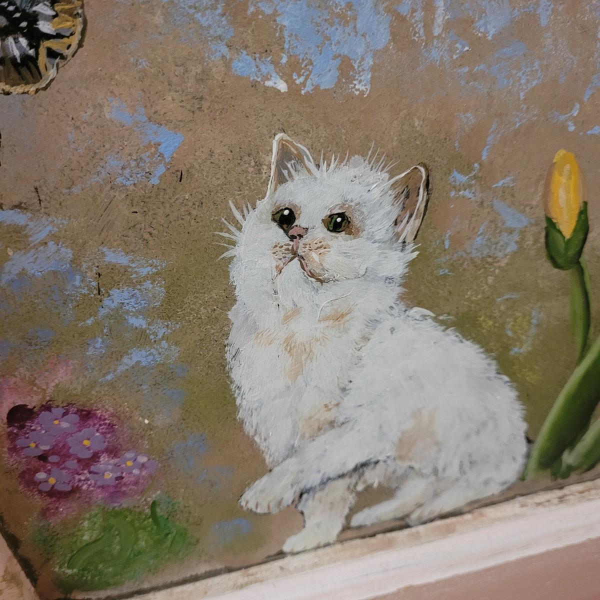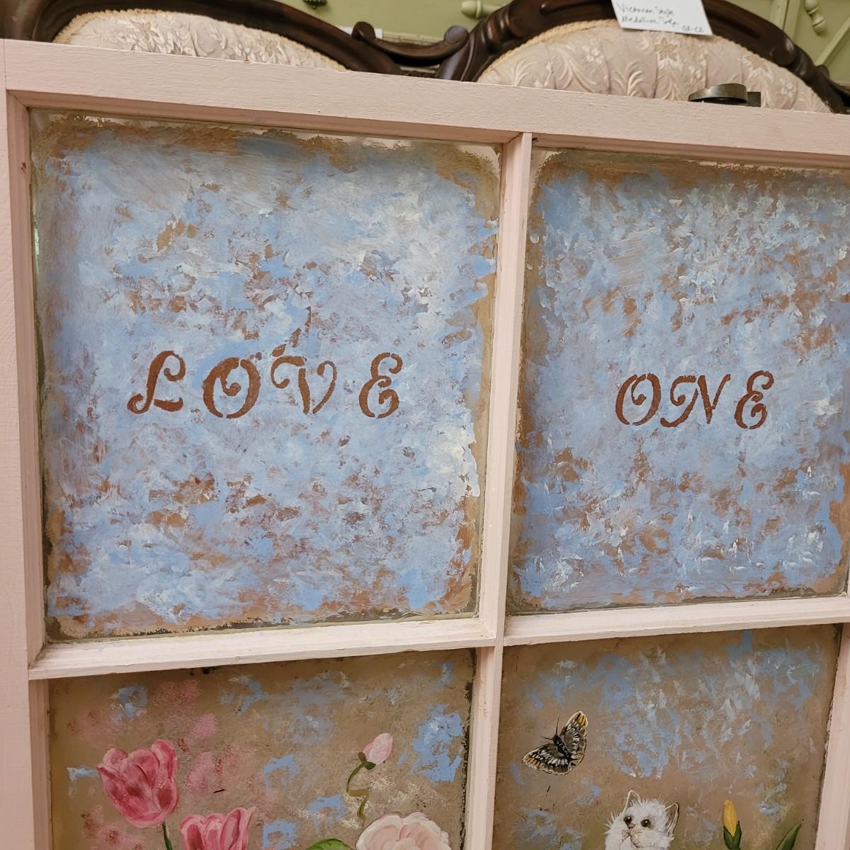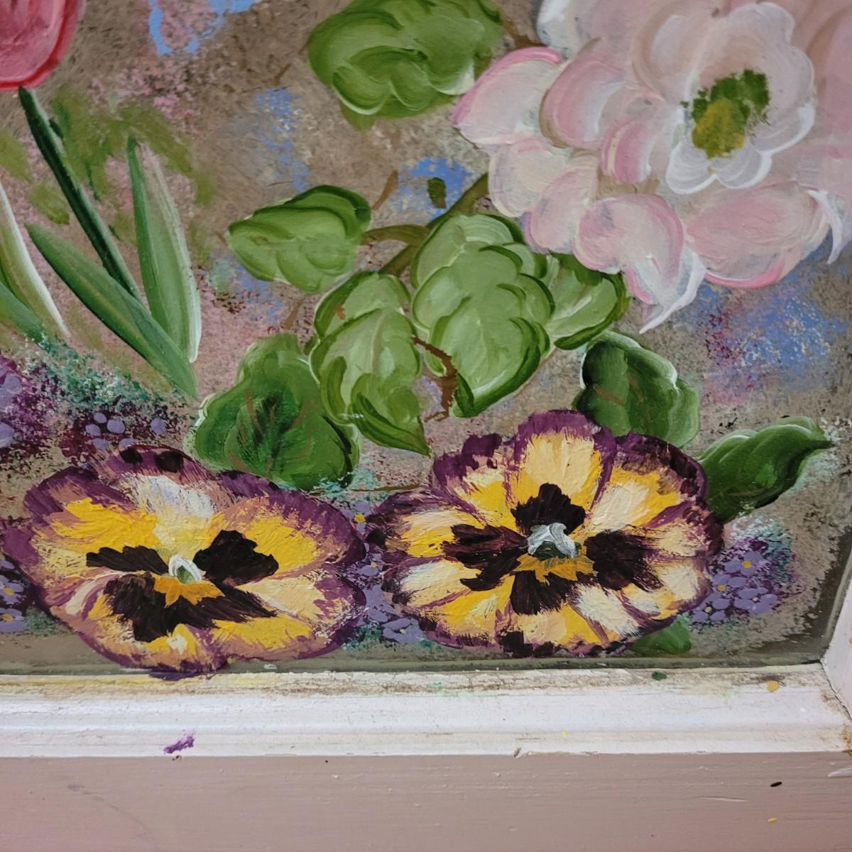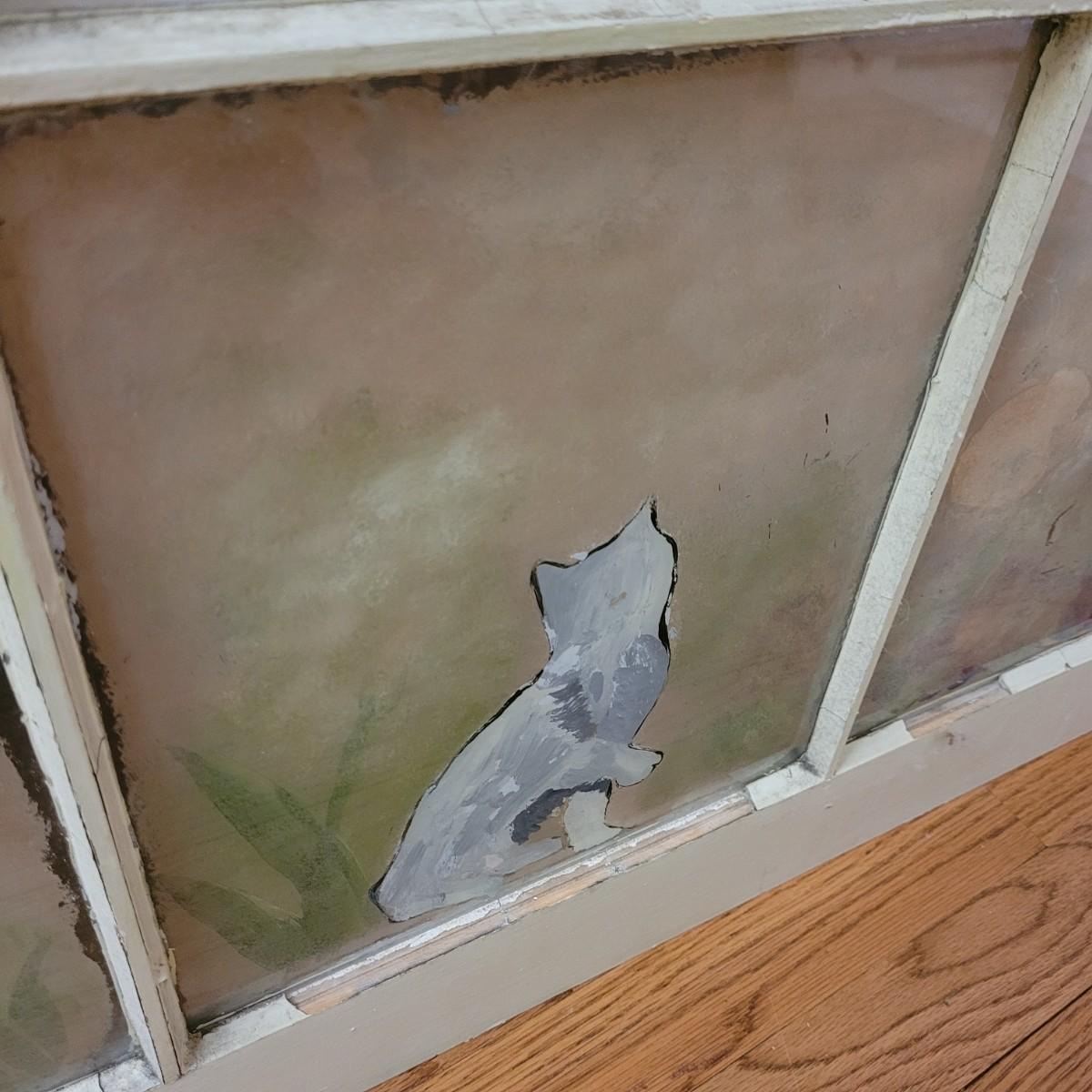 Hand painted vintage window frame with a sweet scene of flowers and a kitten. Measures approximately 36" x 28". Shipping available. Shipping can be costly. We suggest contacting our preferred local shipping provider, Postage Express, with dimensions and getting an estimate before bidding: (828) 670-5501 or postageexpress@yahoo.com.