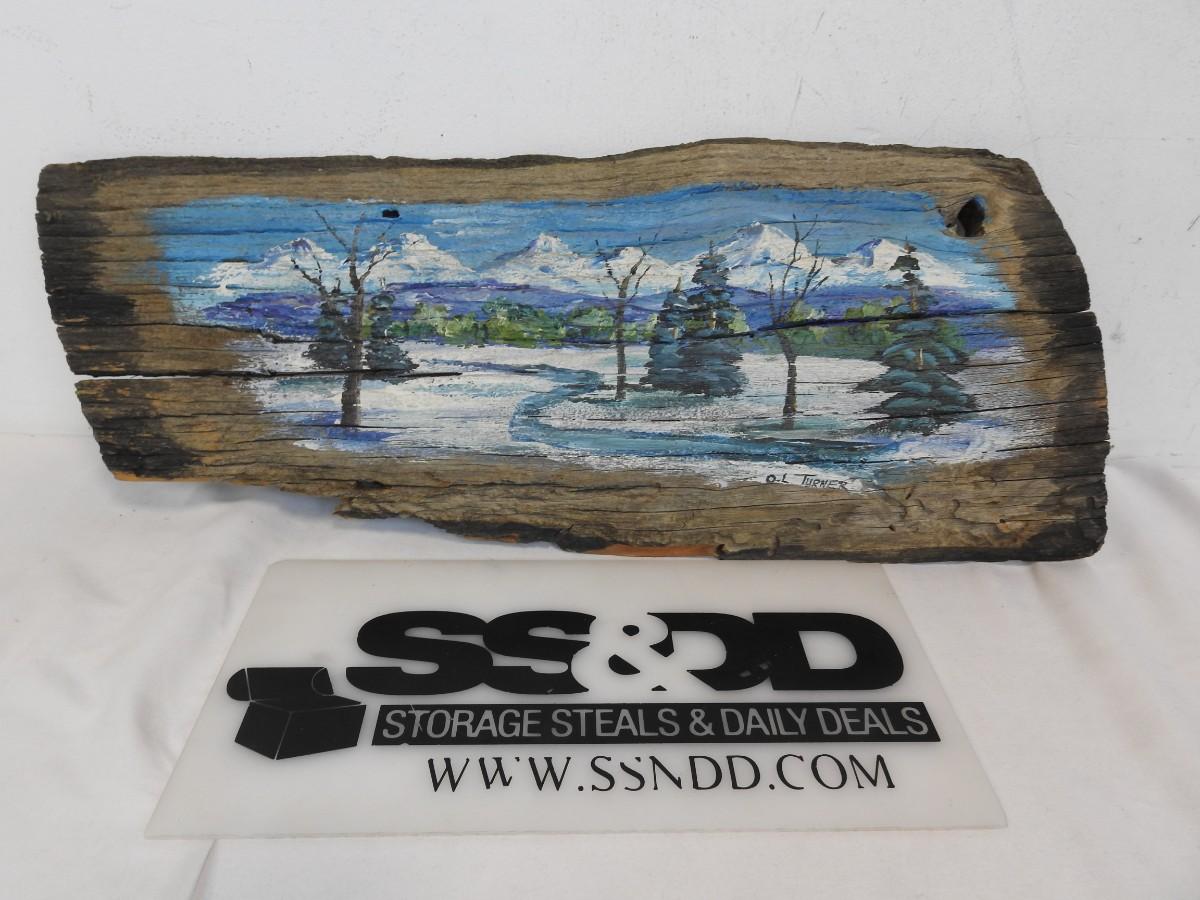 Painted Winter Scene On Piece Of Wood, Artist O. L. Turner, Has Hardware On Back For Hanging