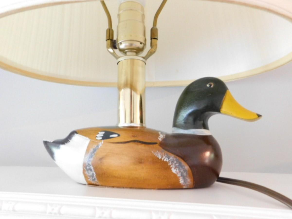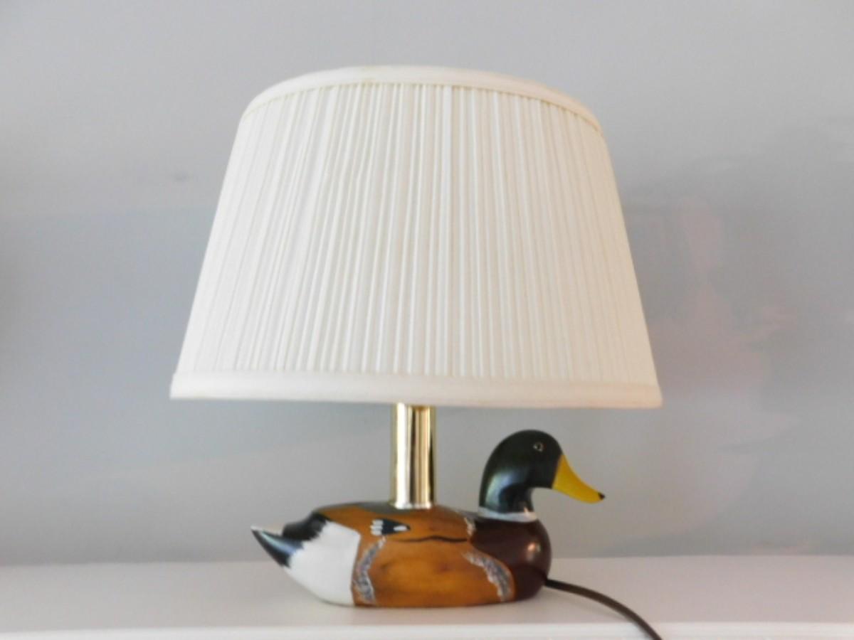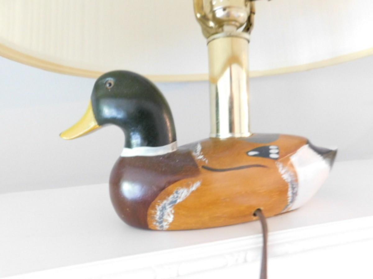 Painted Wood Duck Decoy Lamp with Shade. The shade has a loose seem in one spot