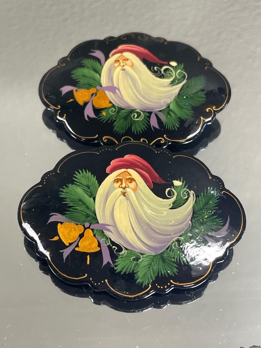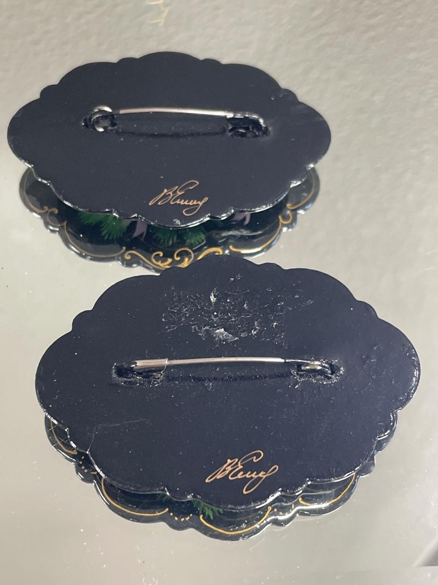 Painted wood pins are both signed