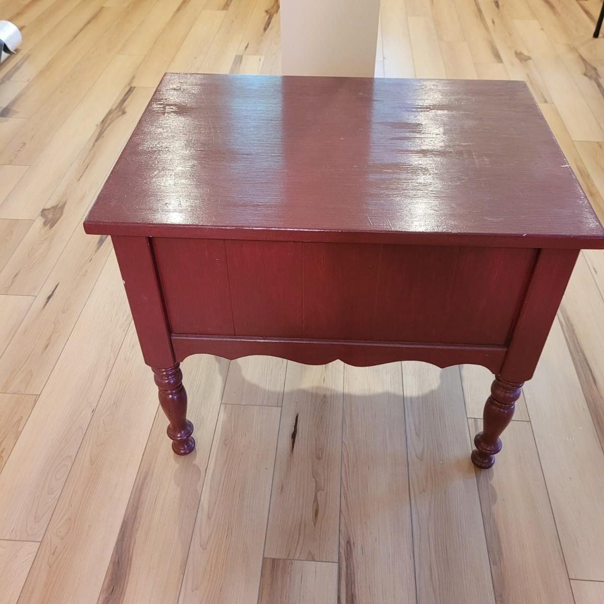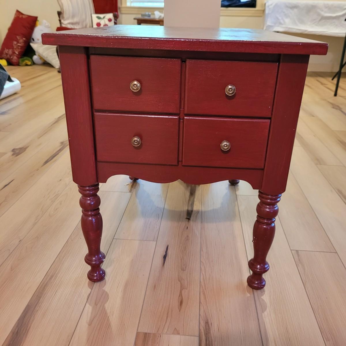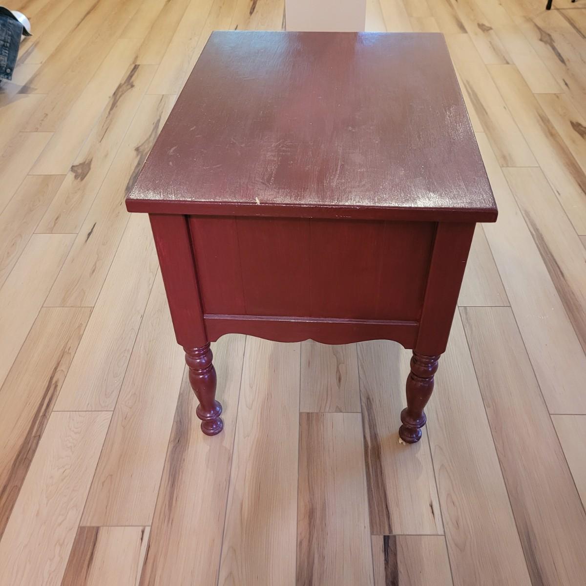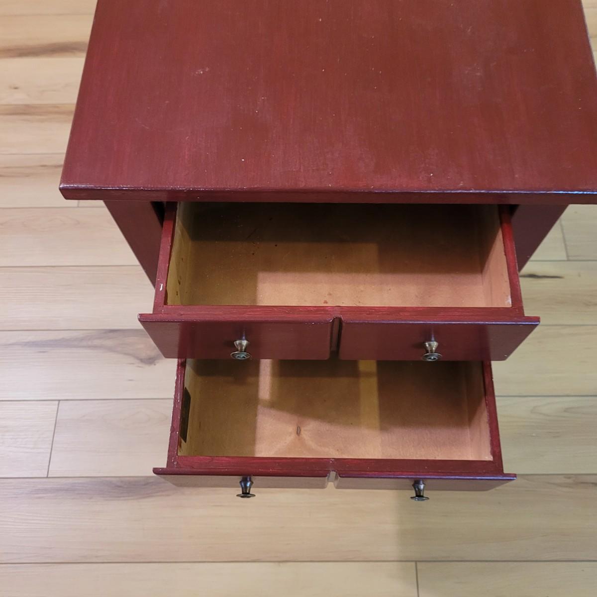 This painted wood side table by Columbia Manufacturing Co. has two deep drawers. Some paint chipping and scratches throughout (see photos), but sturdy. Measures approximately 19.5" x 26" x 22"H. Drawers 12.5" x 16" x 3.5"H. Local pickup only.