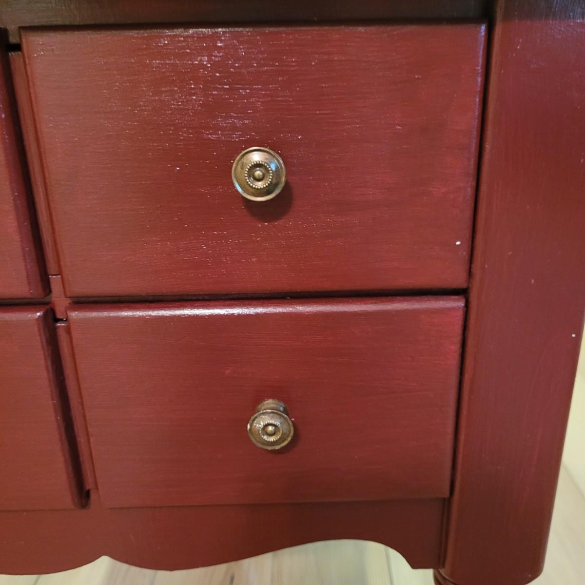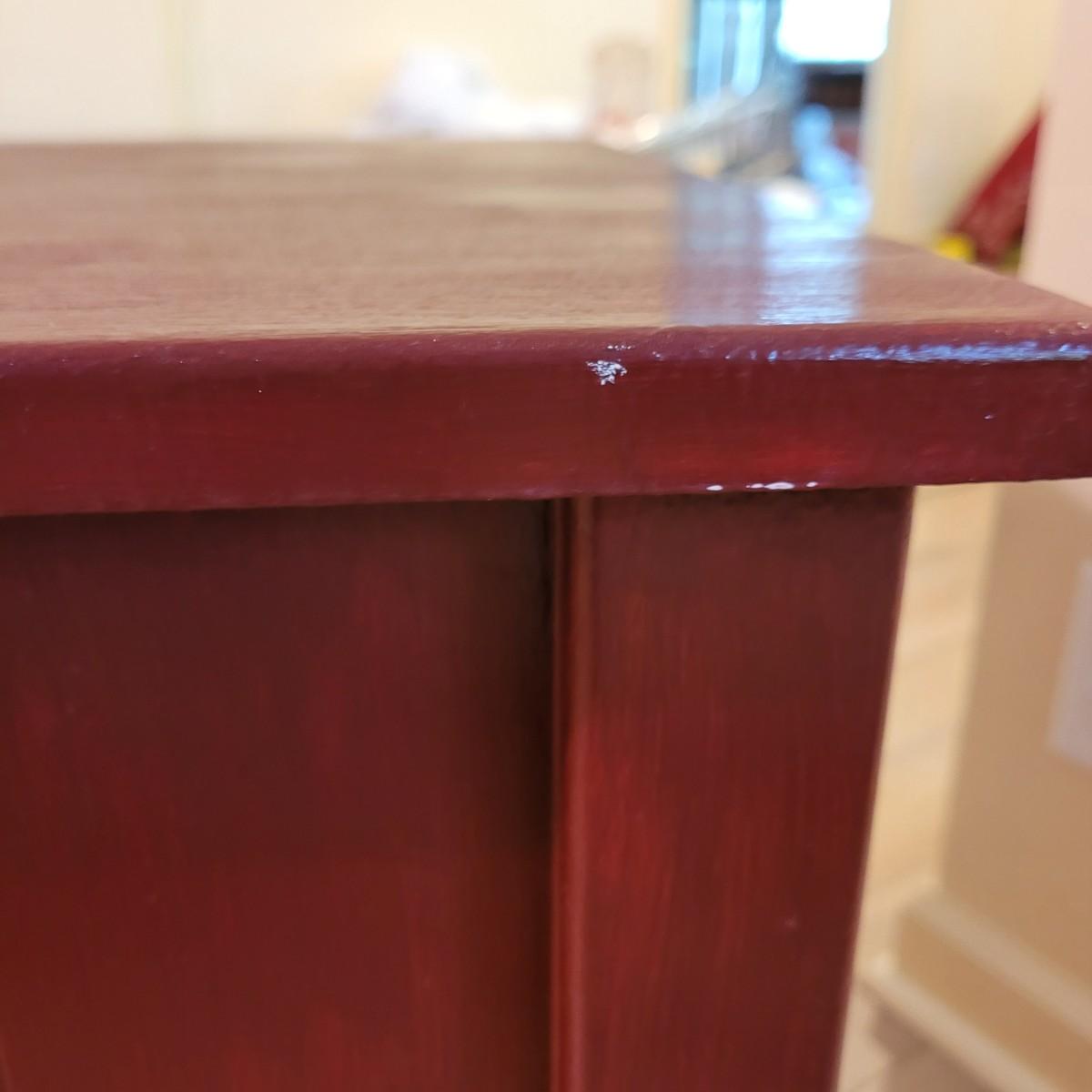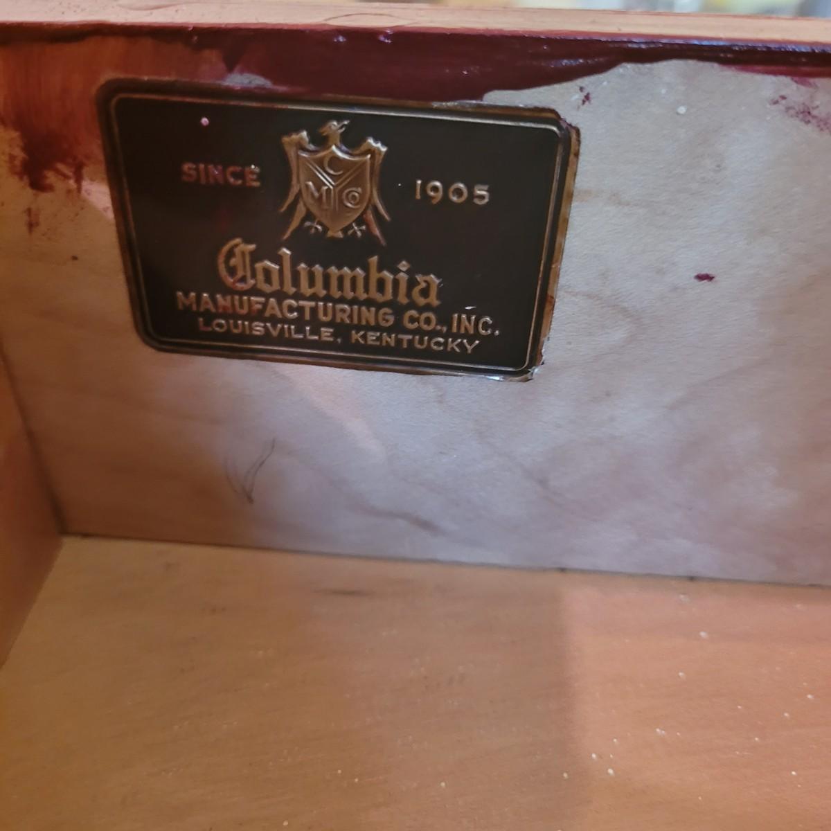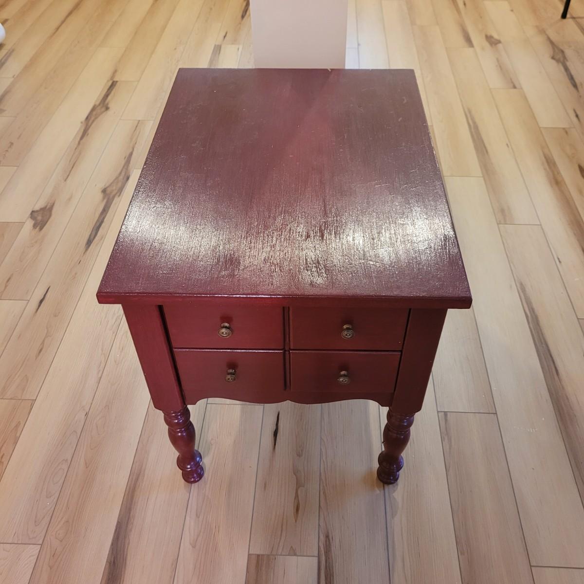 This painted wood side table by Columbia Manufacturing Co. has two deep drawers. Some paint chipping and scratches throughout (see photos), but sturdy. Measures approximately 19.5" x 26" x 22"H. Drawers 12.5" x 16" x 3.5"H. Local pickup only.