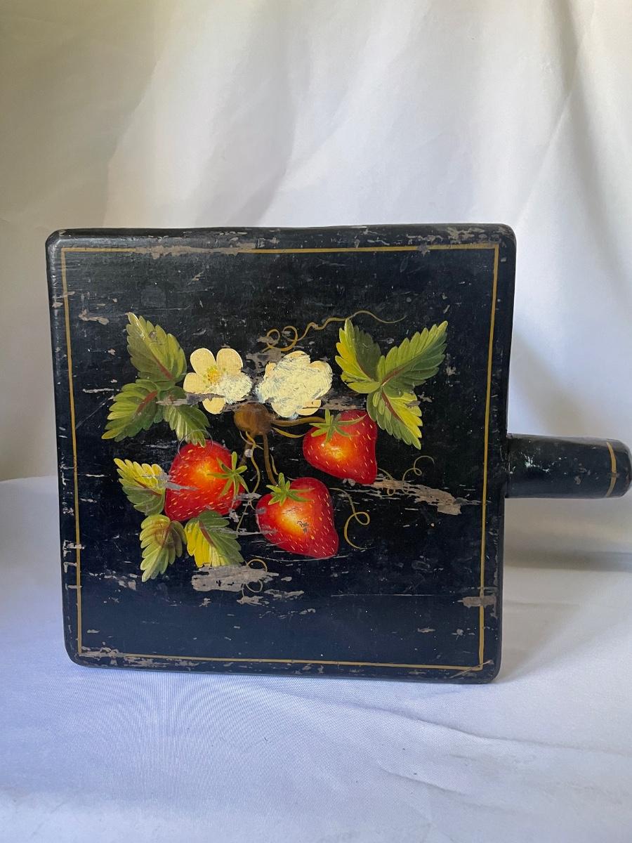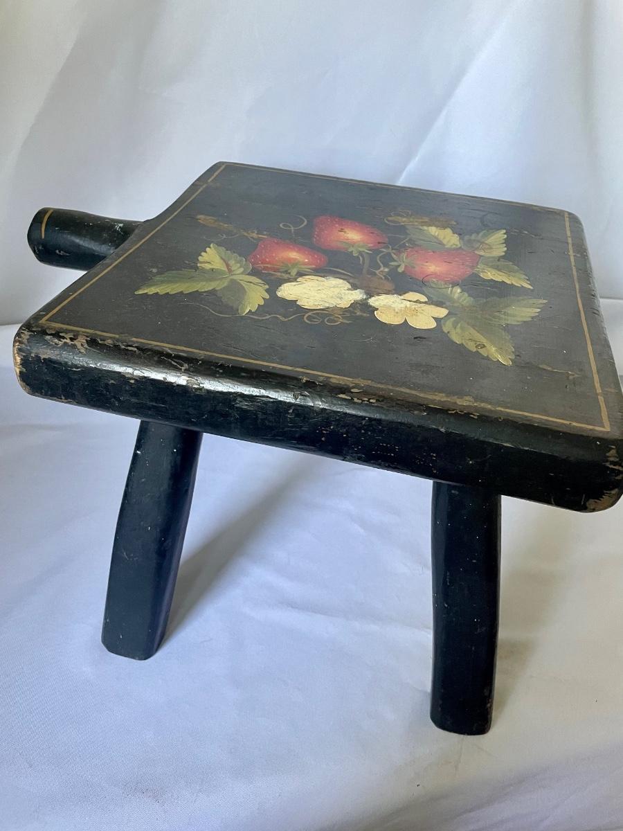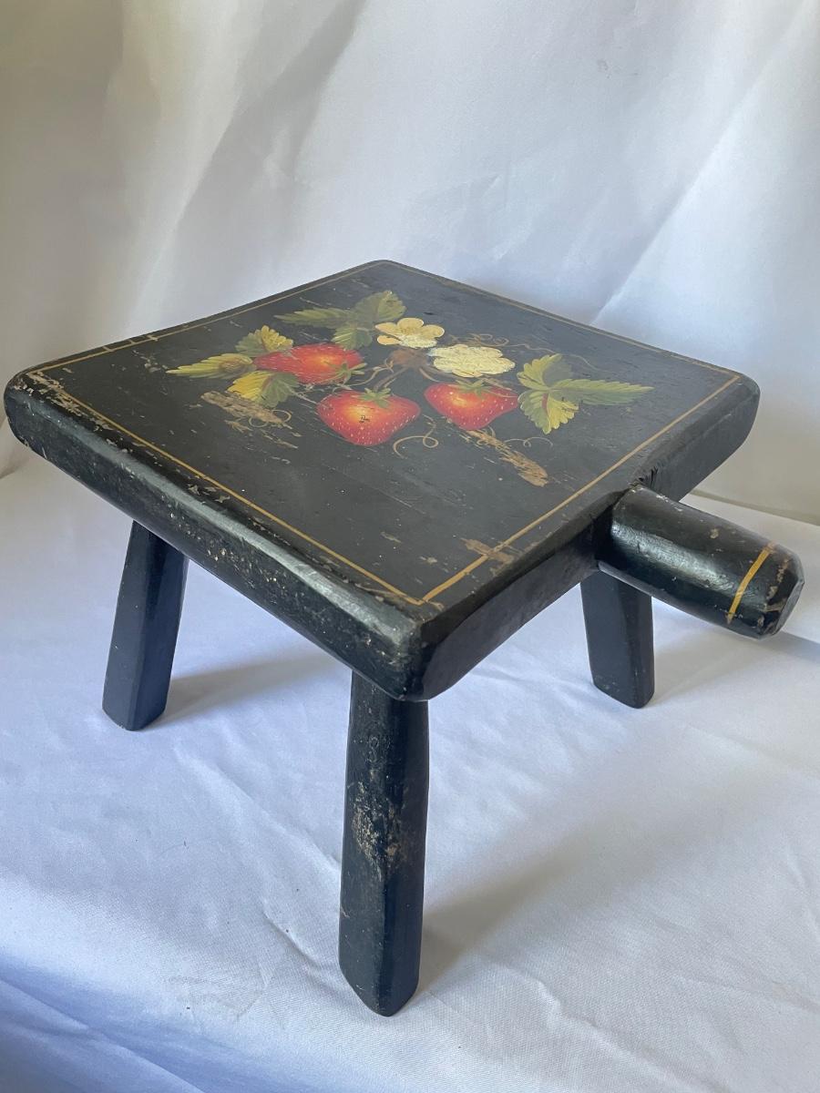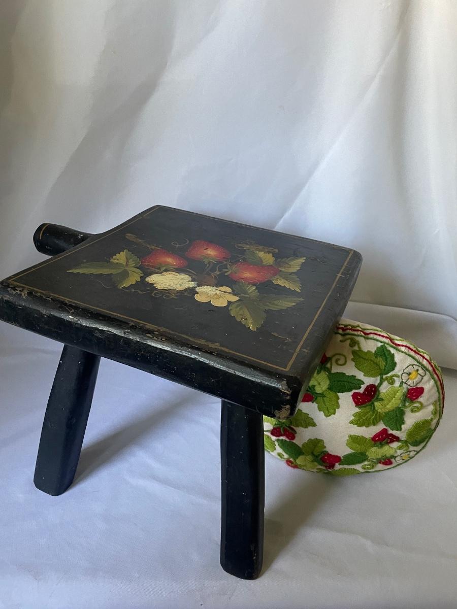 This adorable stool with handle is wood painted black with a strawberry motif in the center, it has minor scuffs in the paint that give it even more vintage appeal, it measures 11” x 11” x 11”. Also included is a
