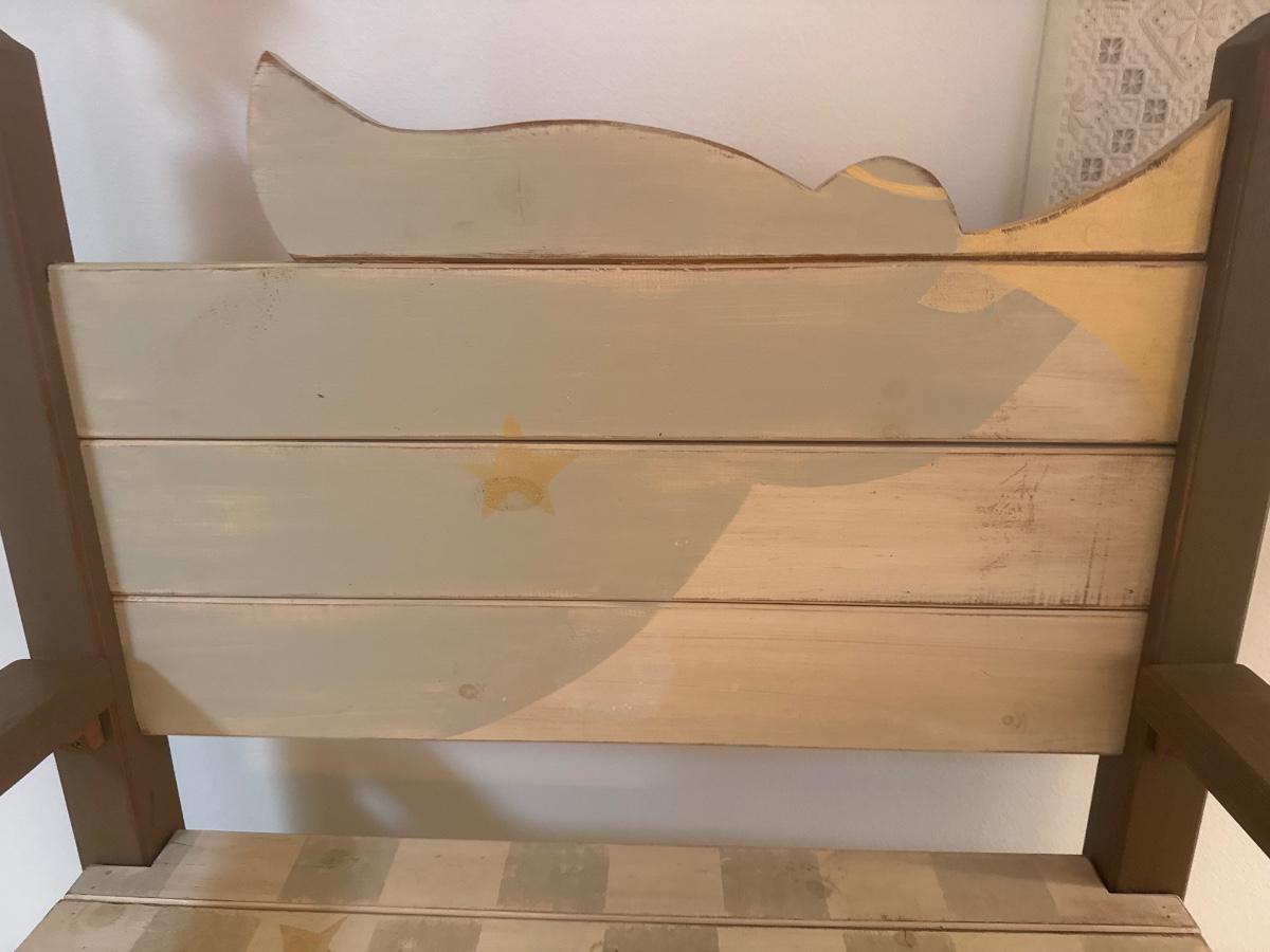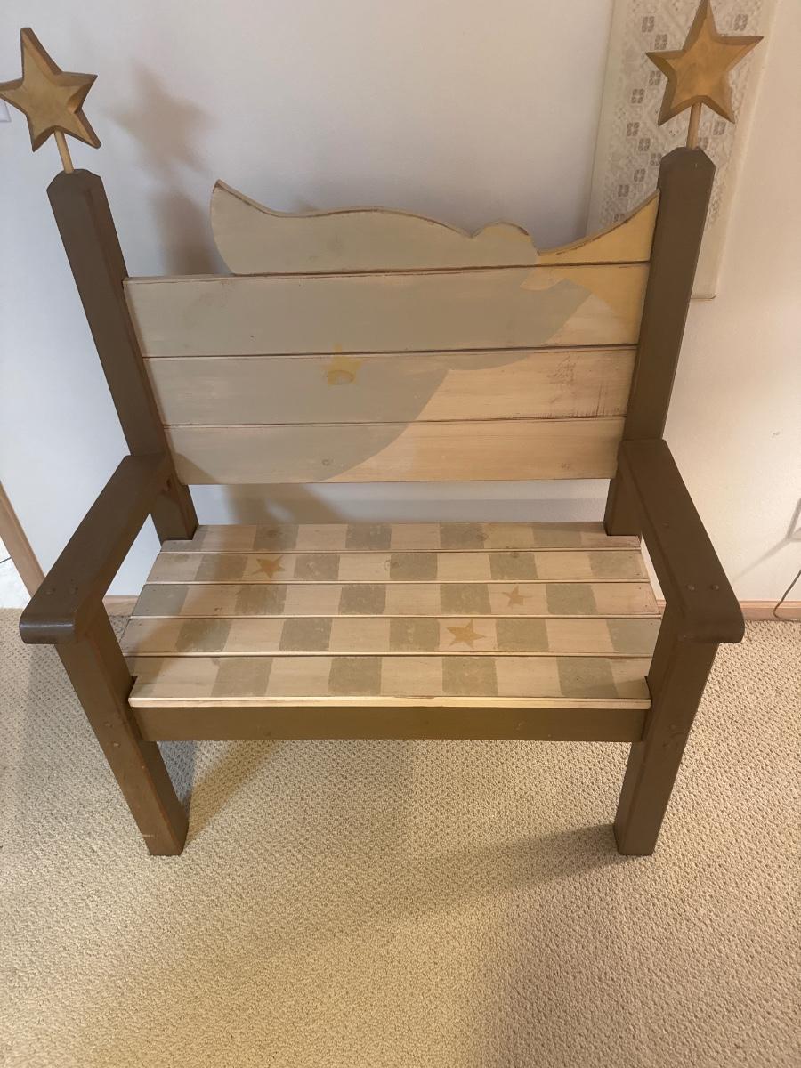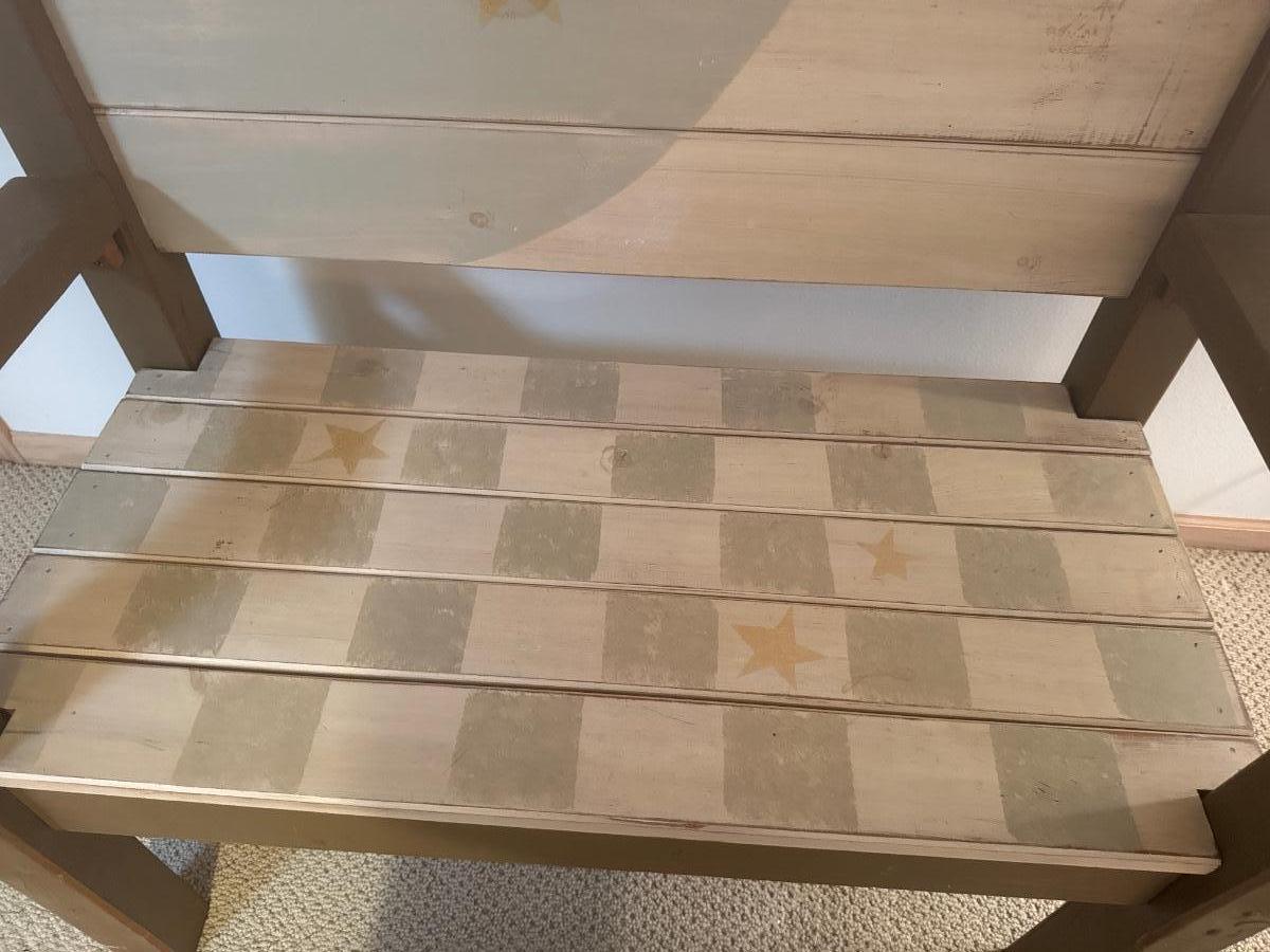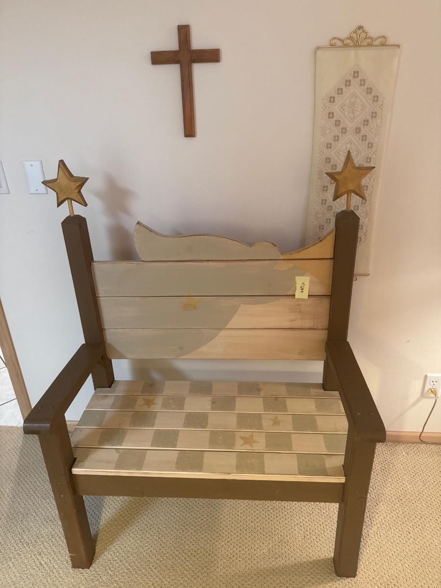 Painted wooden bench with wooden cross and wall decor