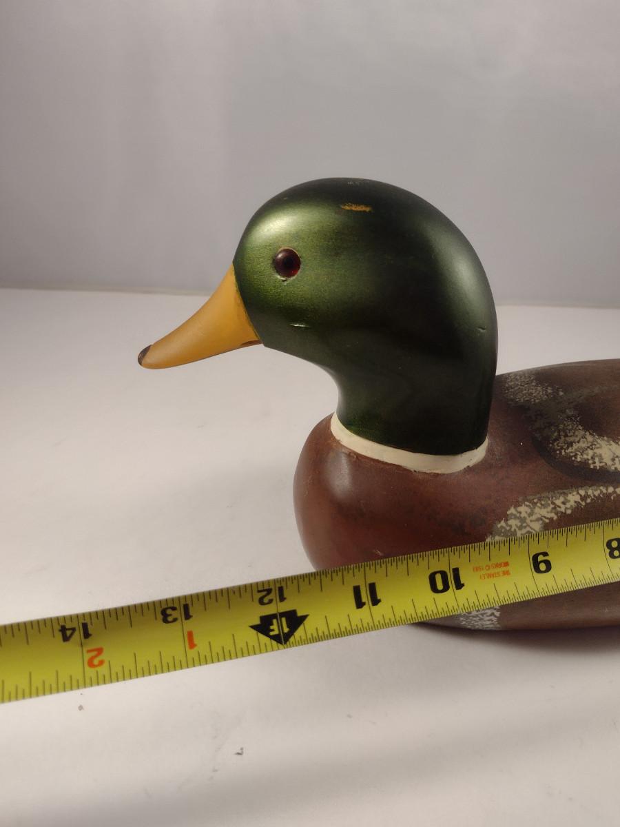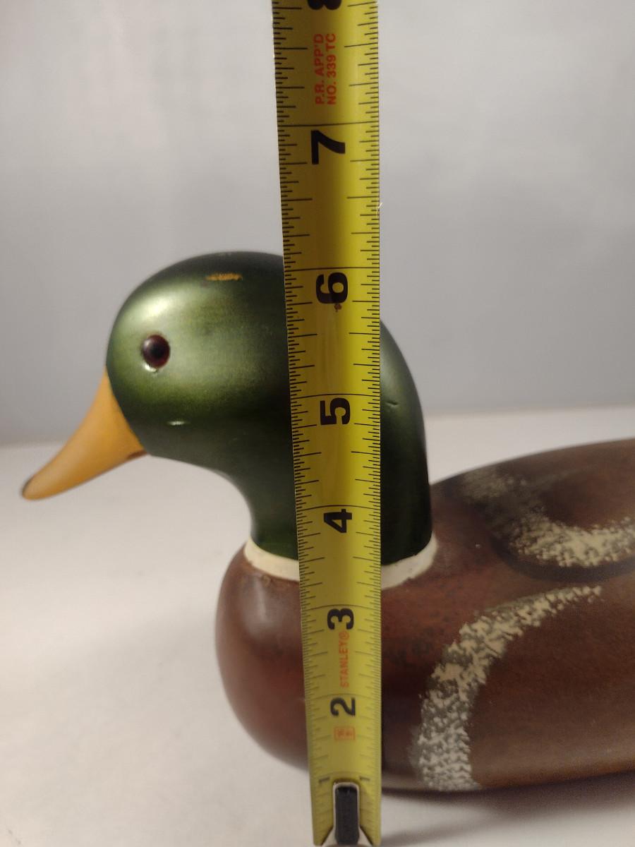 Painted Wooden Duck Decoy (#1). No maker's mark found. Item measures approx 6 1/4" tall, 12 1/2" long.