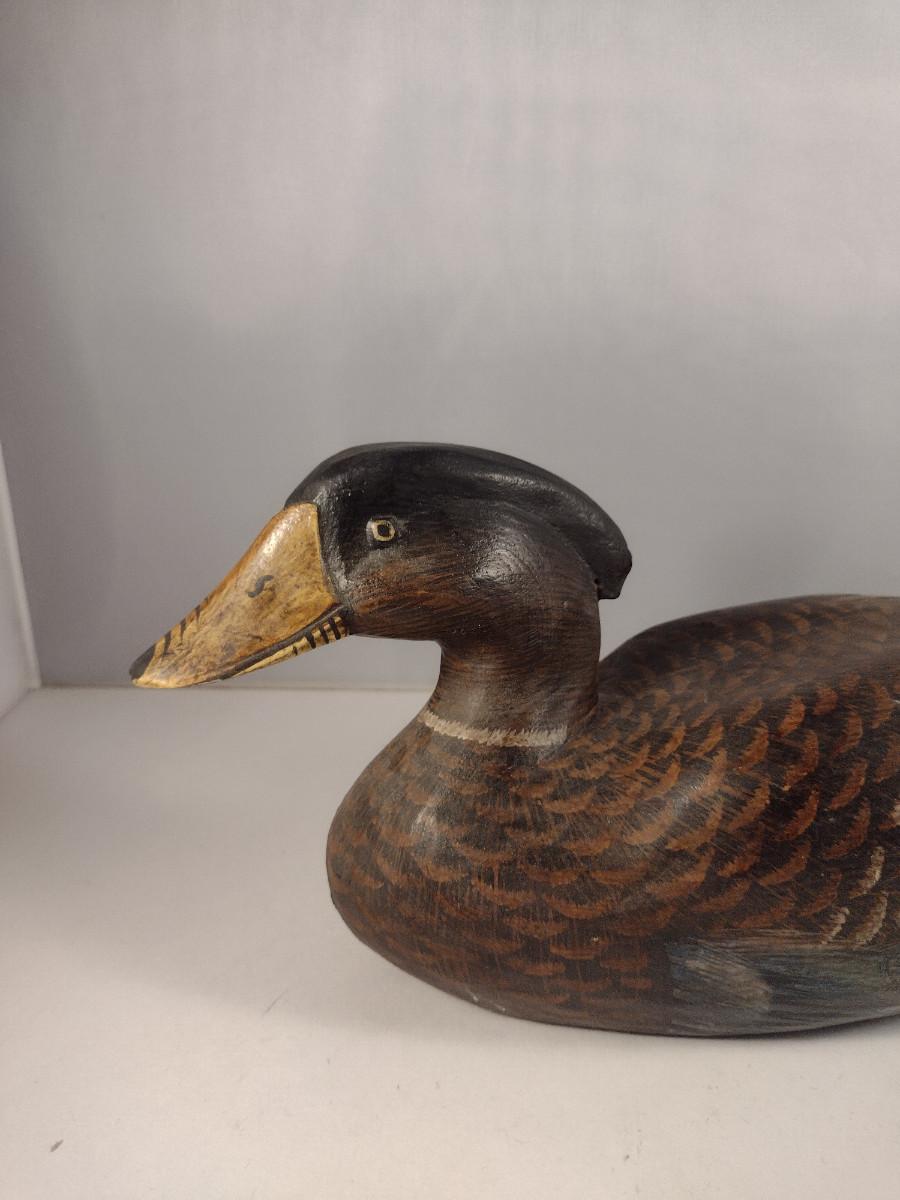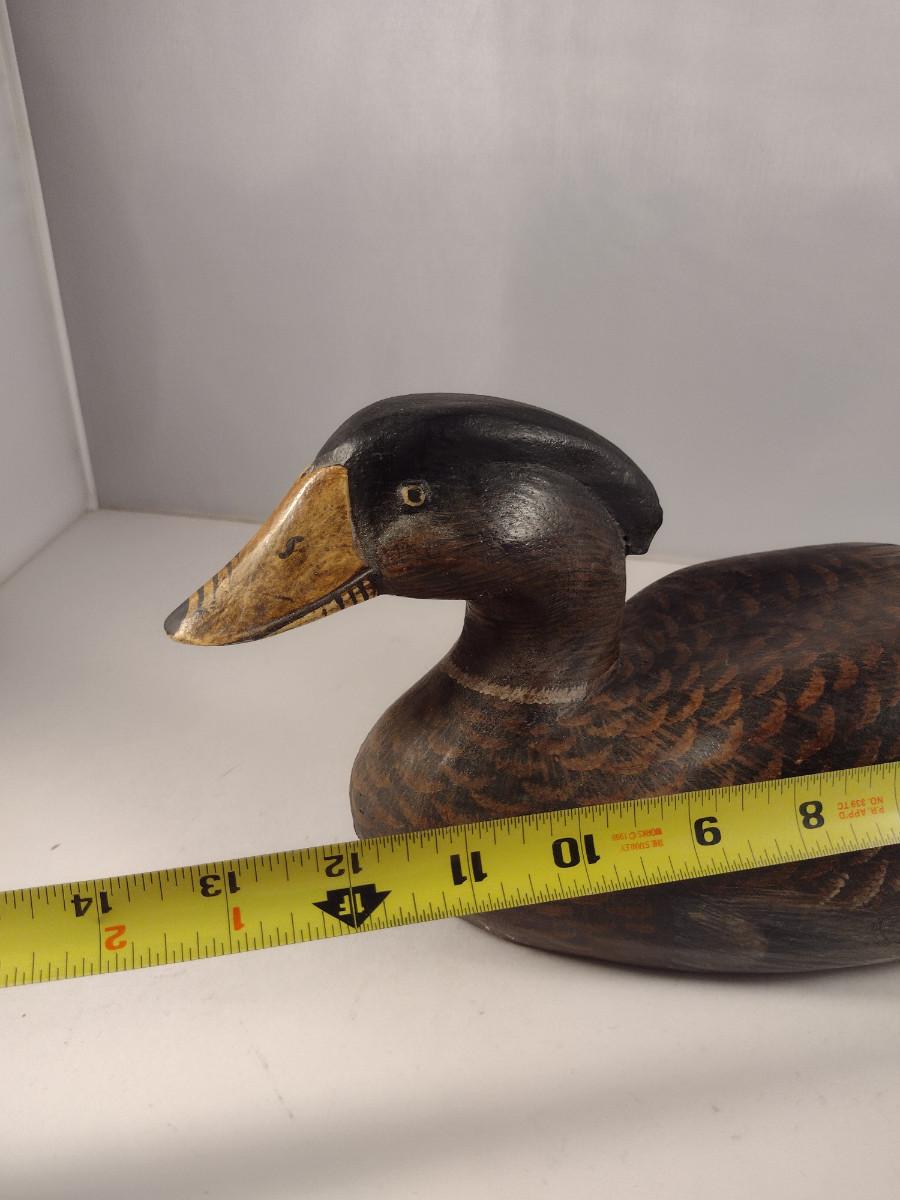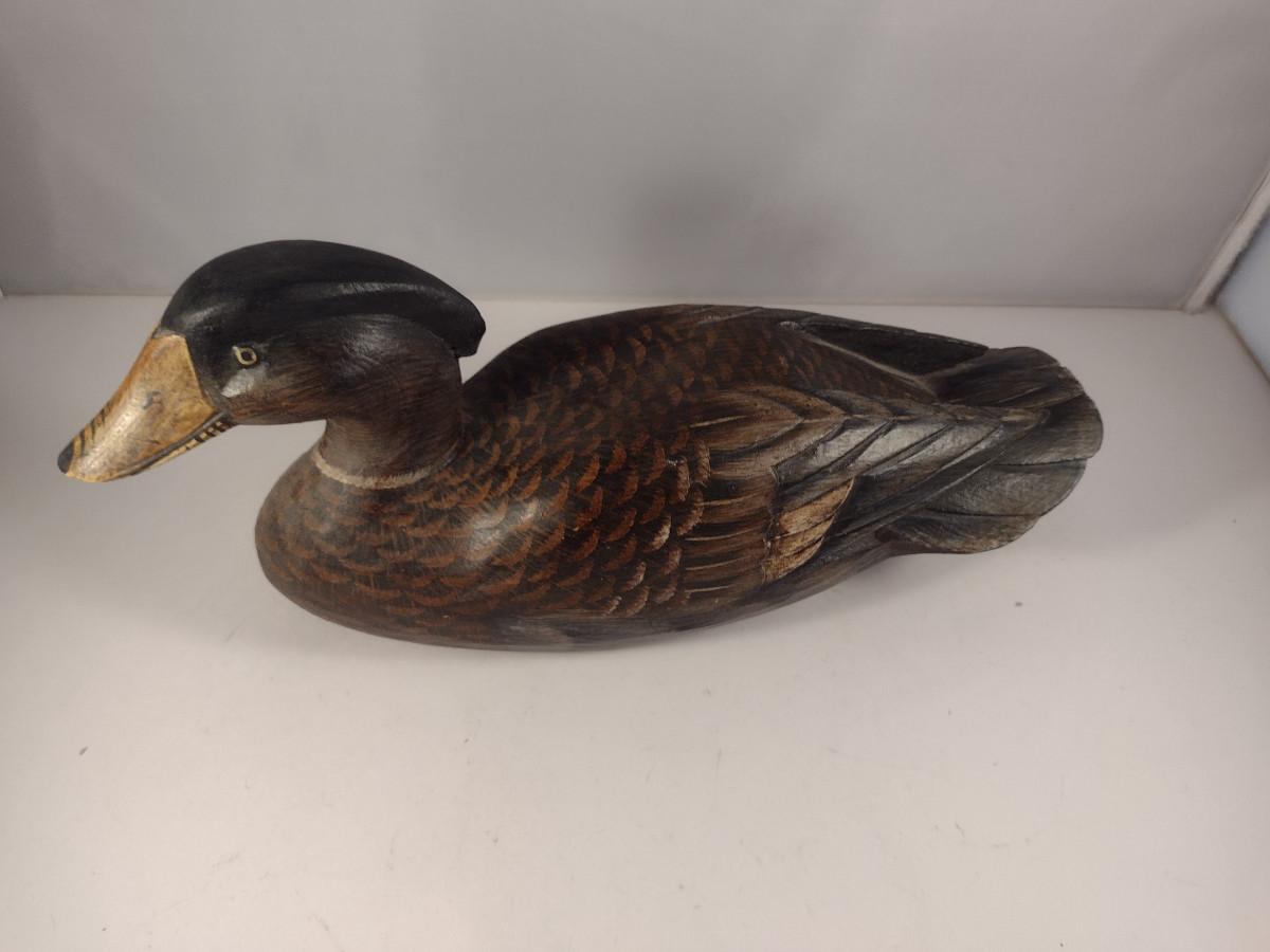 Painted Wooden Duck Decoy (#6). No maker's mark found. Item measures approx 5 3/4" tall, 13" long.