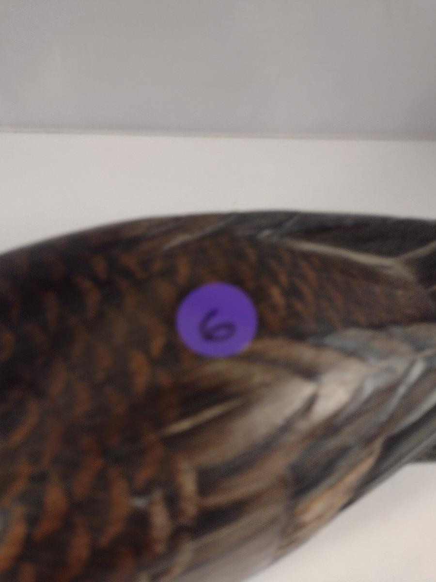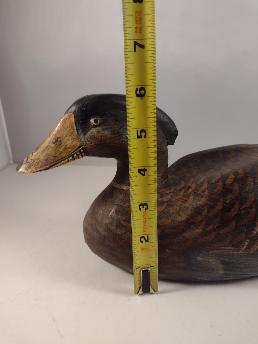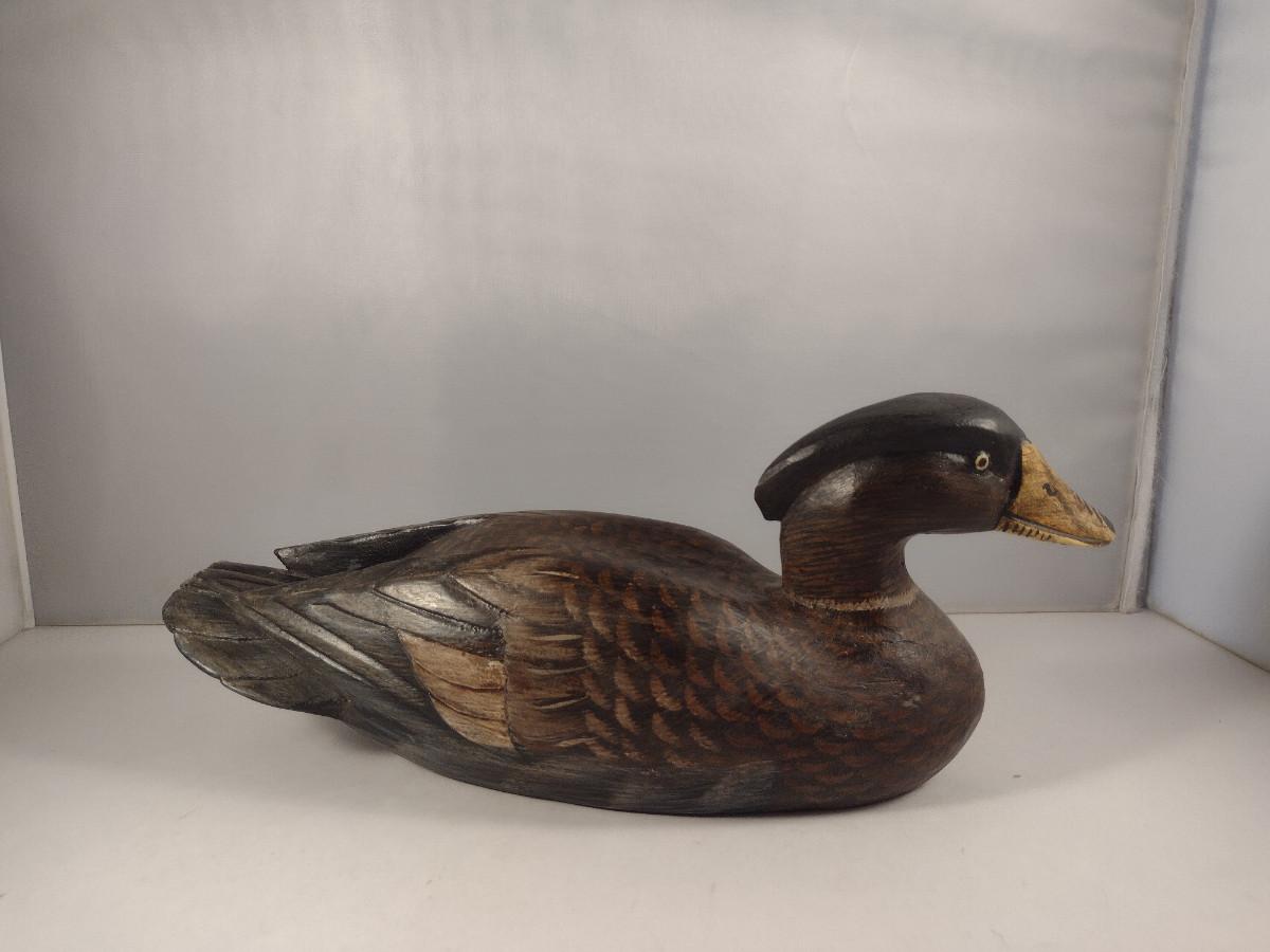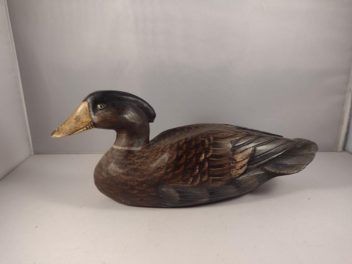 Painted Wooden Duck Decoy (#6). No maker's mark found. Item measures approx 5 3/4" tall, 13" long.