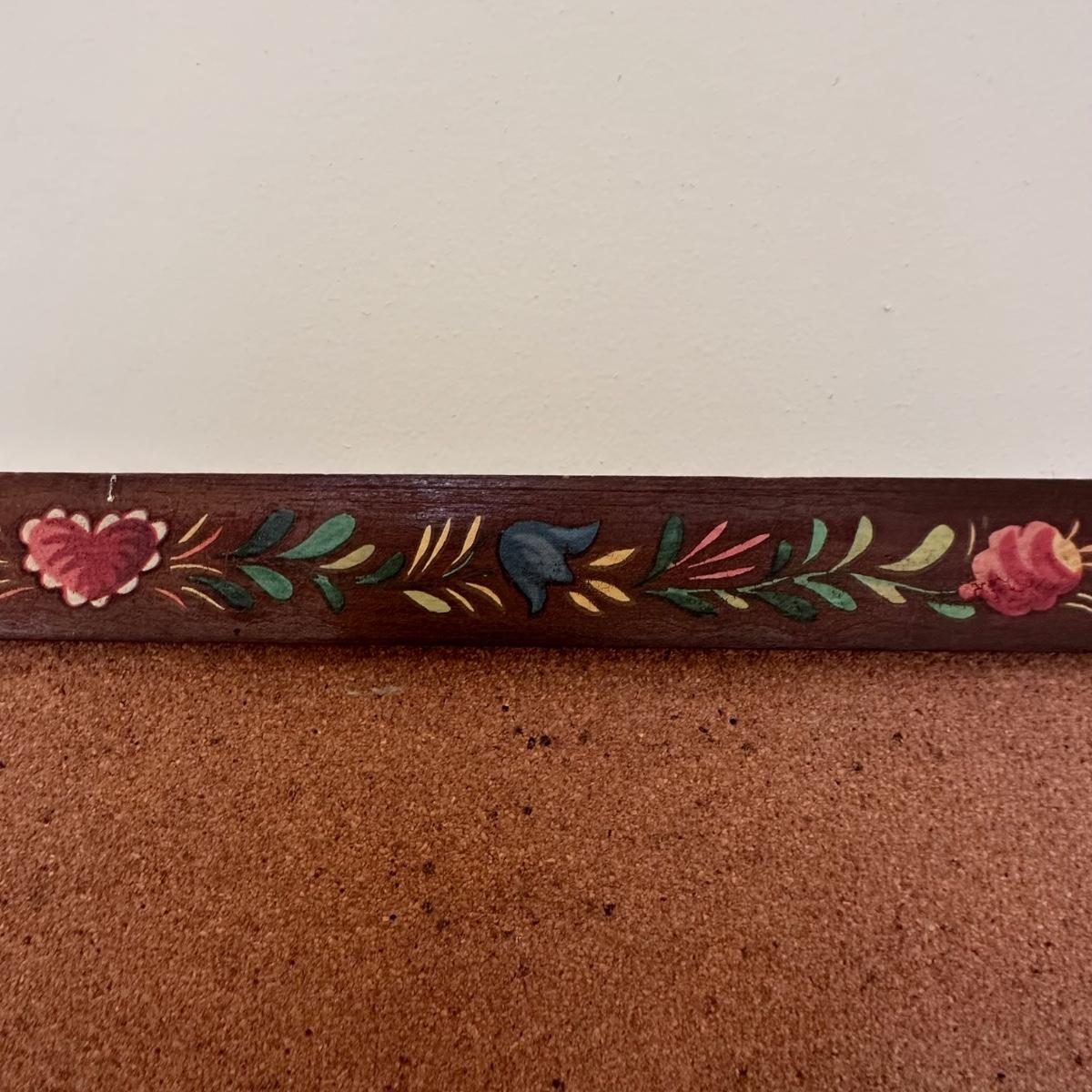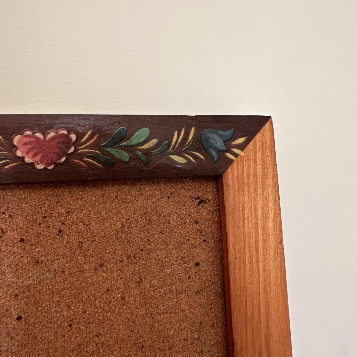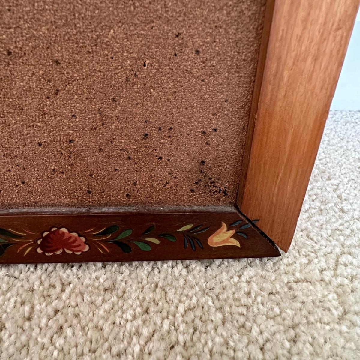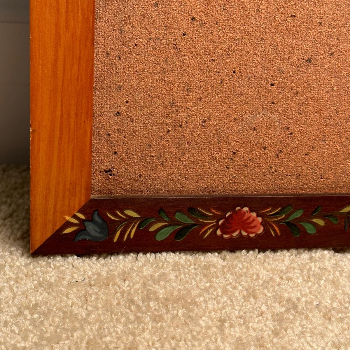 Floral painted wooden framed cork board measures 32” x 26.5”H. Wooden desk lamp measures 25”H from base to finial. Base measures 6”D. Lamp shade is 11”H. Three-way bulb works when powered on. Shipping available. Shipping can be costly. We suggest contacting our preferred local shipping provider, Postage Express, with dimensions and getting an estimate before bidding: (828) 670-5501 or postageexpress@yahoo.com.